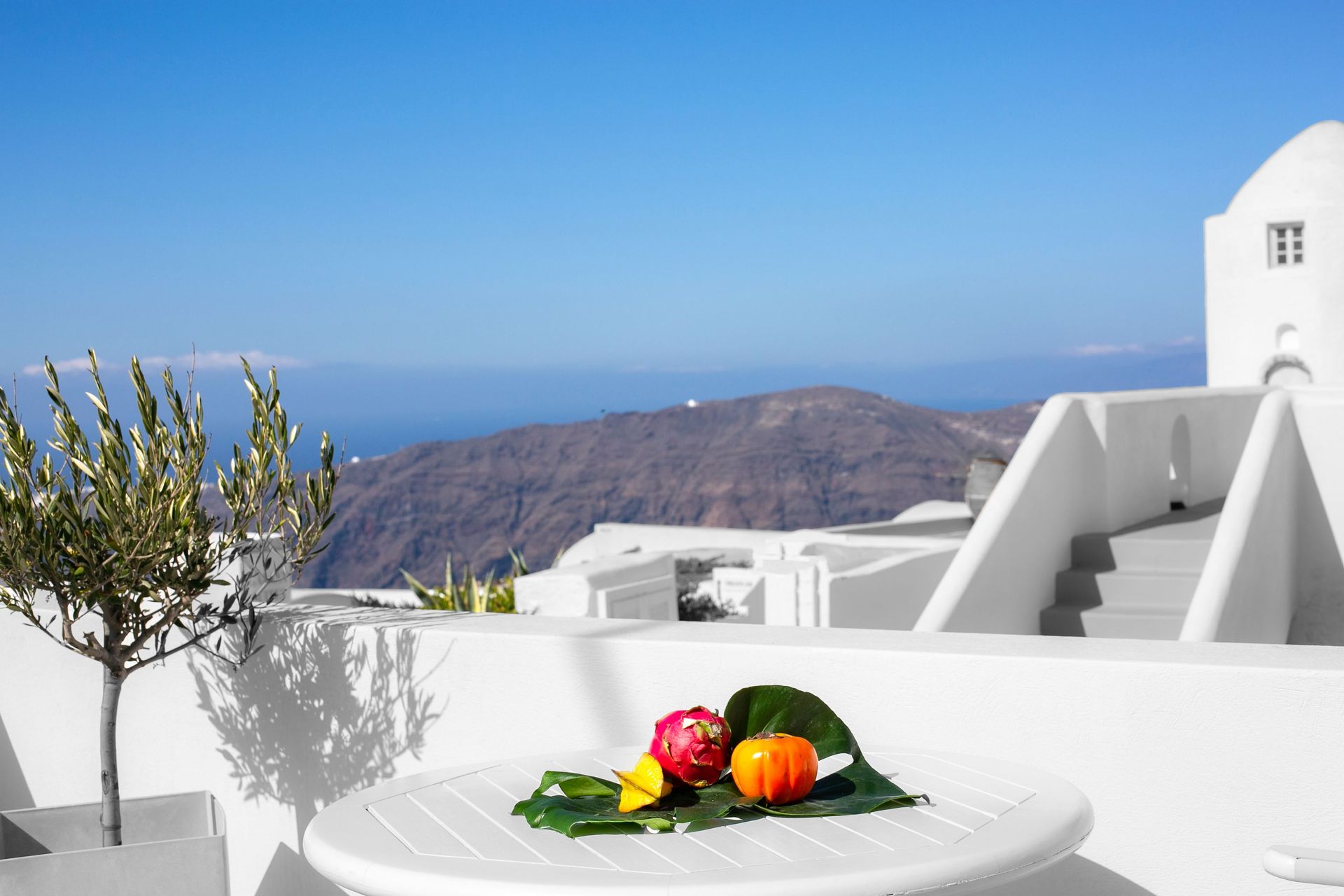 Suite with living room and separate bedroom and a balcony with pool and Caldera view.