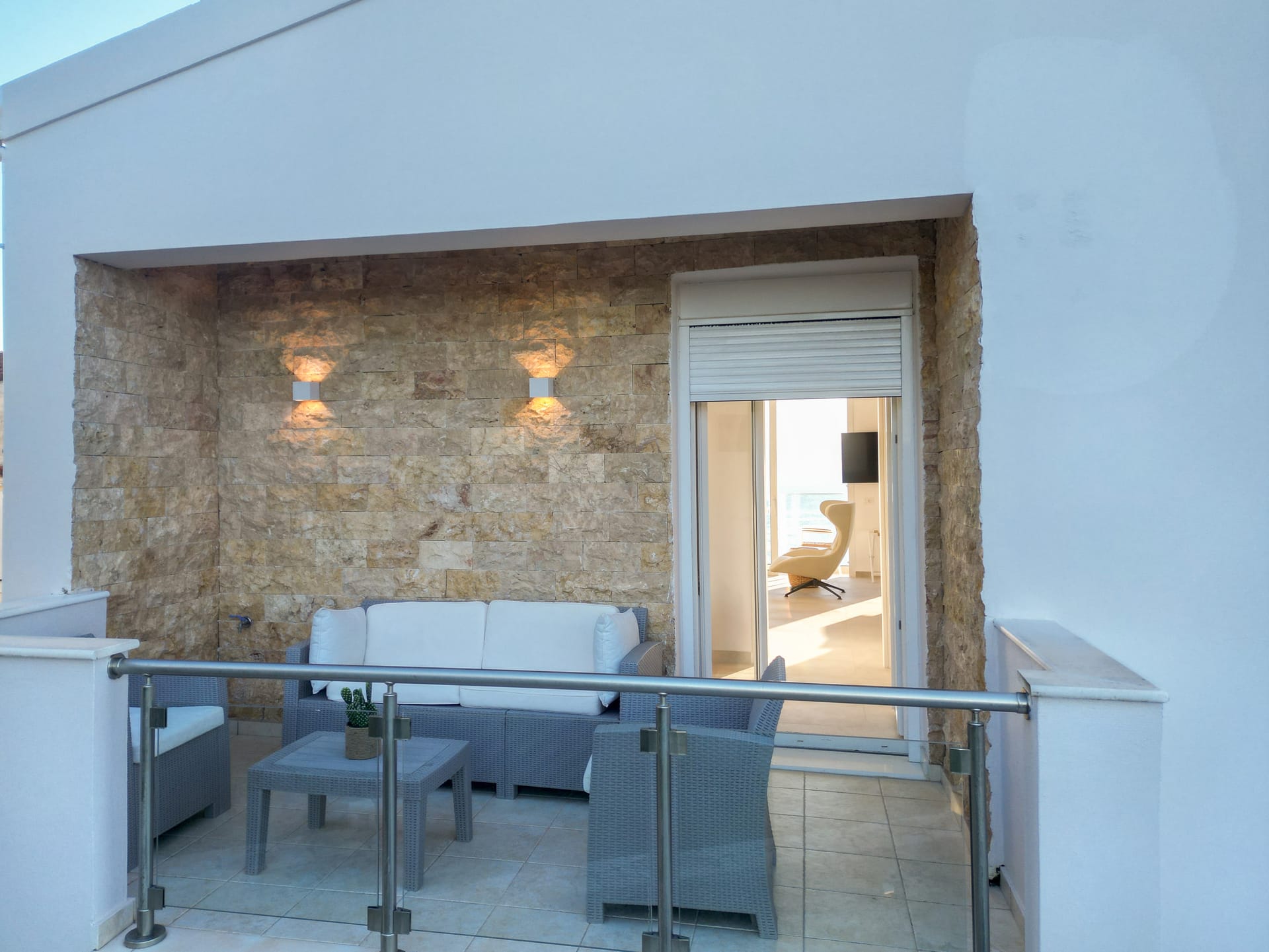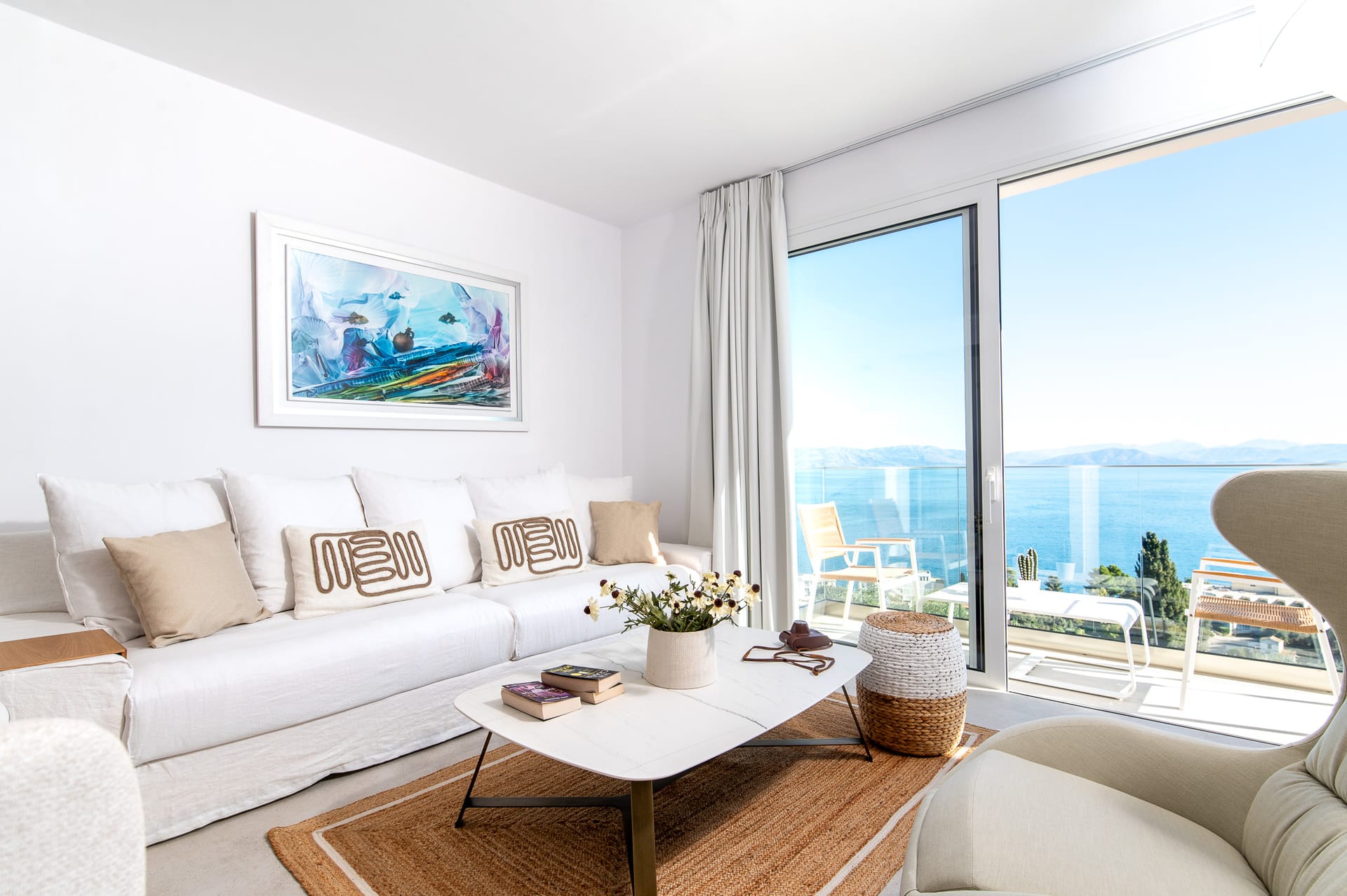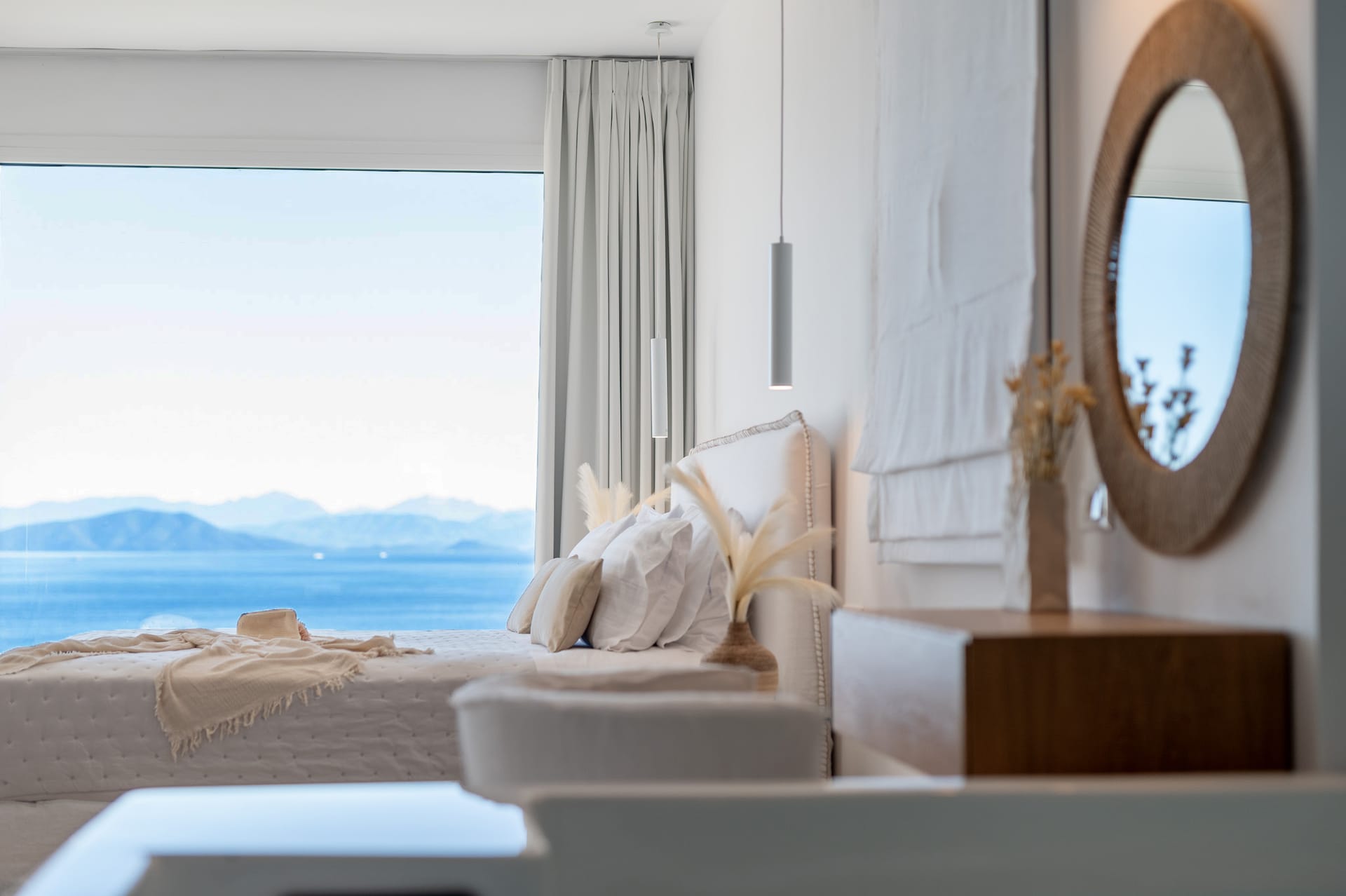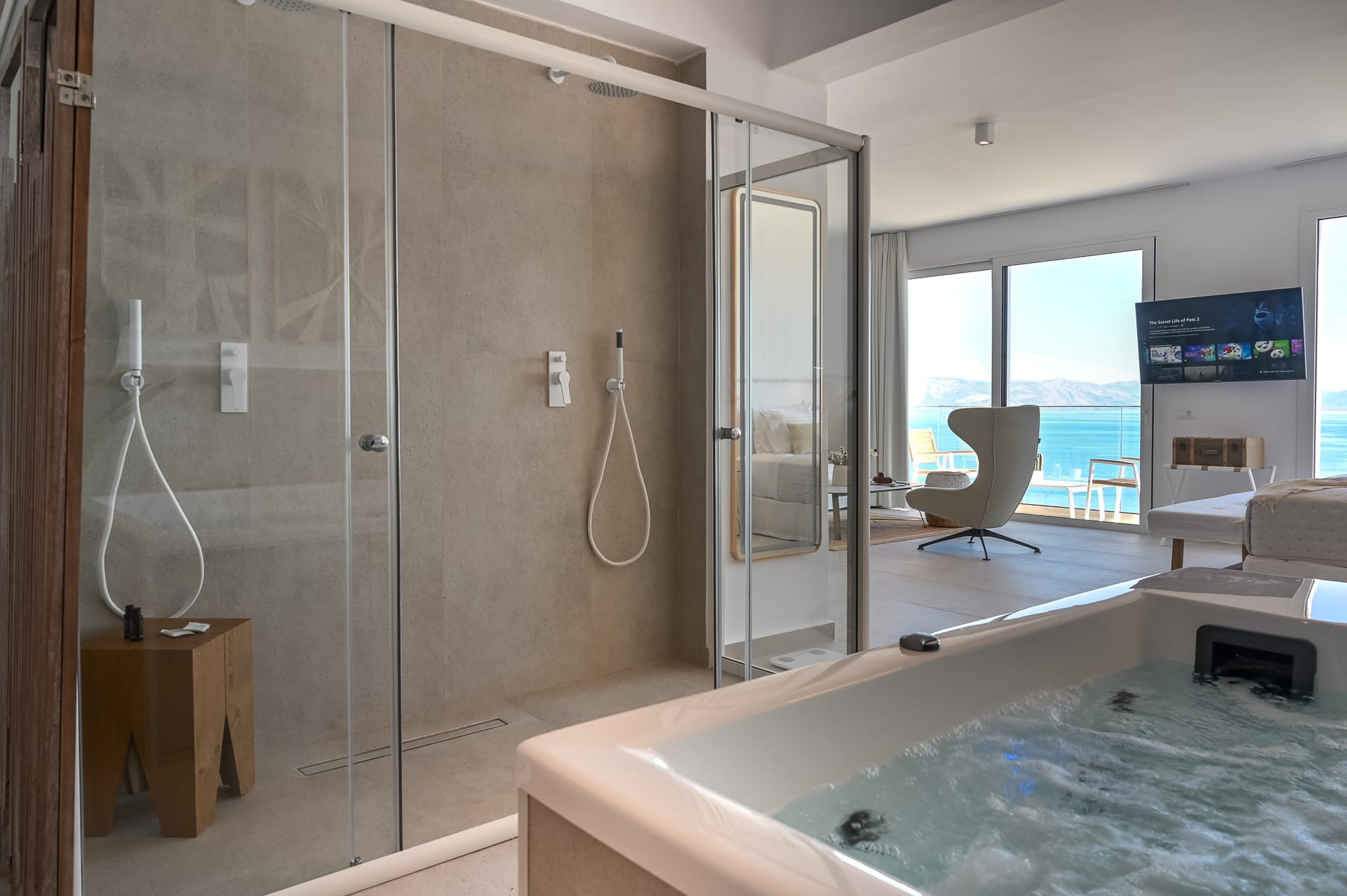 The “Panoramic Loft Suite with indoor hot tub” is an open-planed suite located on the second floor of the villa with individual front door. It includes a large bed with a flat-screen TV, A/C – heating and a kitchen equipped with all electrical appliances (refrigerator, microwave oven, washing machine, iron and iron board). It also has a sitting room with sea view and a bathroom with steam/jacuzzi, 2 showers, 2 sinks and a hair dryer.
