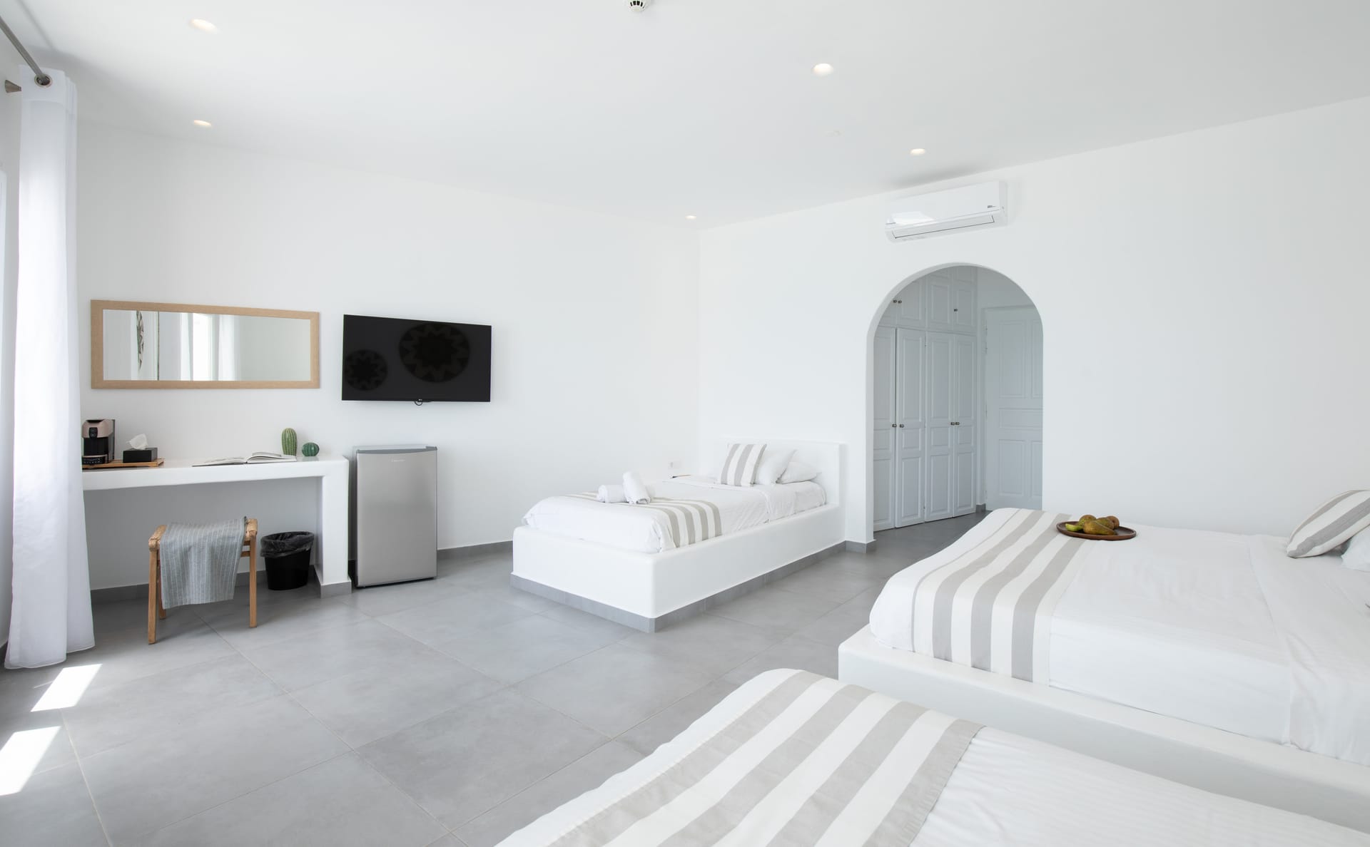 Elegantly decorated and fully renovated 2018f eaturing a king-size and 2 twin beds, bathroom with all the amenities and 2 rainfall-showers ,individually air-conditioning (hot & cold),safety box, free Wi fi access,hairdryer,iron board and iron, satellite radio, 43" satellite TV, refrigerator and private balcony with direct views of the Aegean Sea. Ideal for four people.located on the first floor.