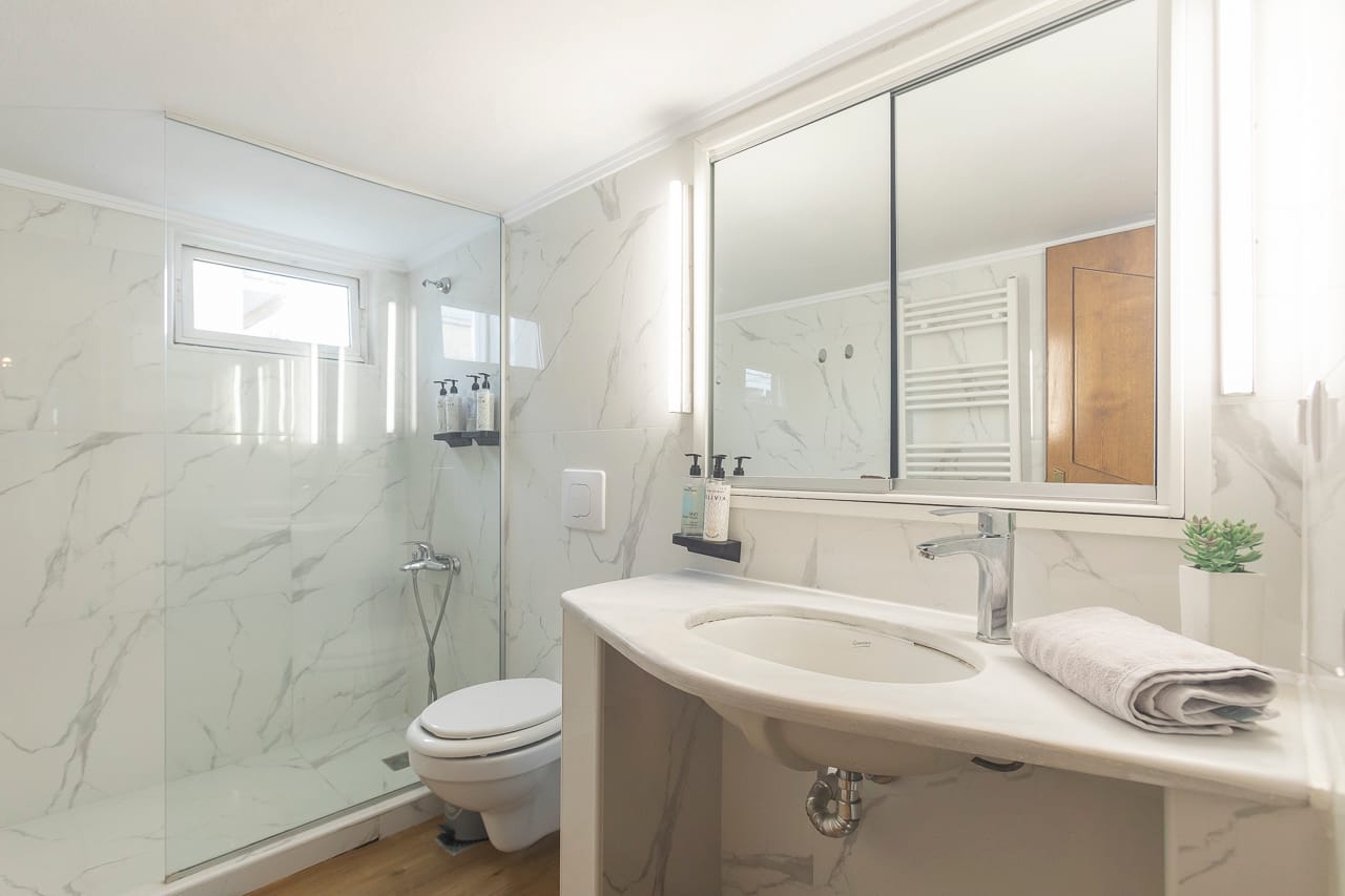 For guests who enjoy preparing their own meals, the fully equipped kitchen offers modern appliances and ample space, making cooking both convenient and enjoyable. The sleek and contemporary full bathroom is fitted with a walk-in shower, combining functionality with style.