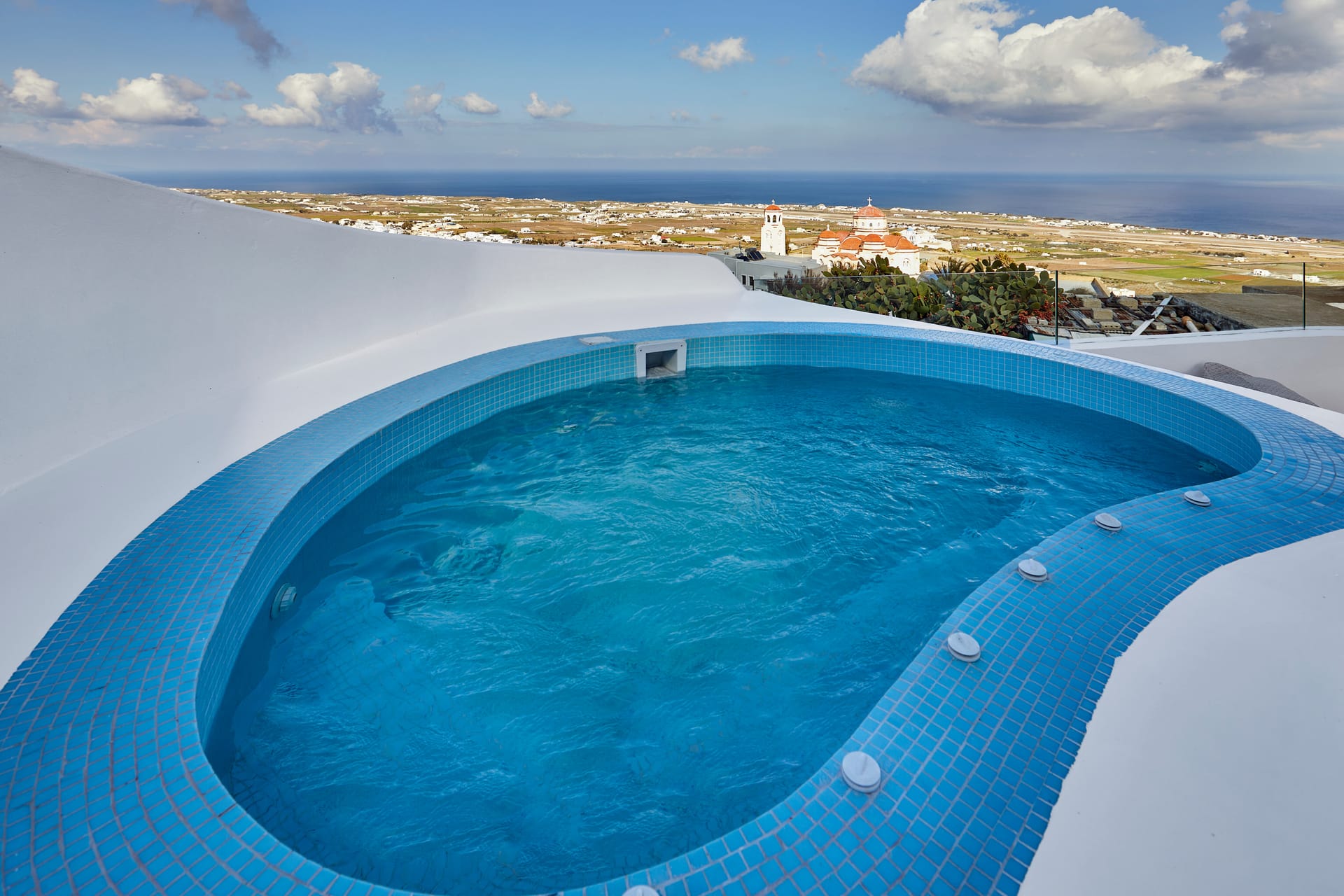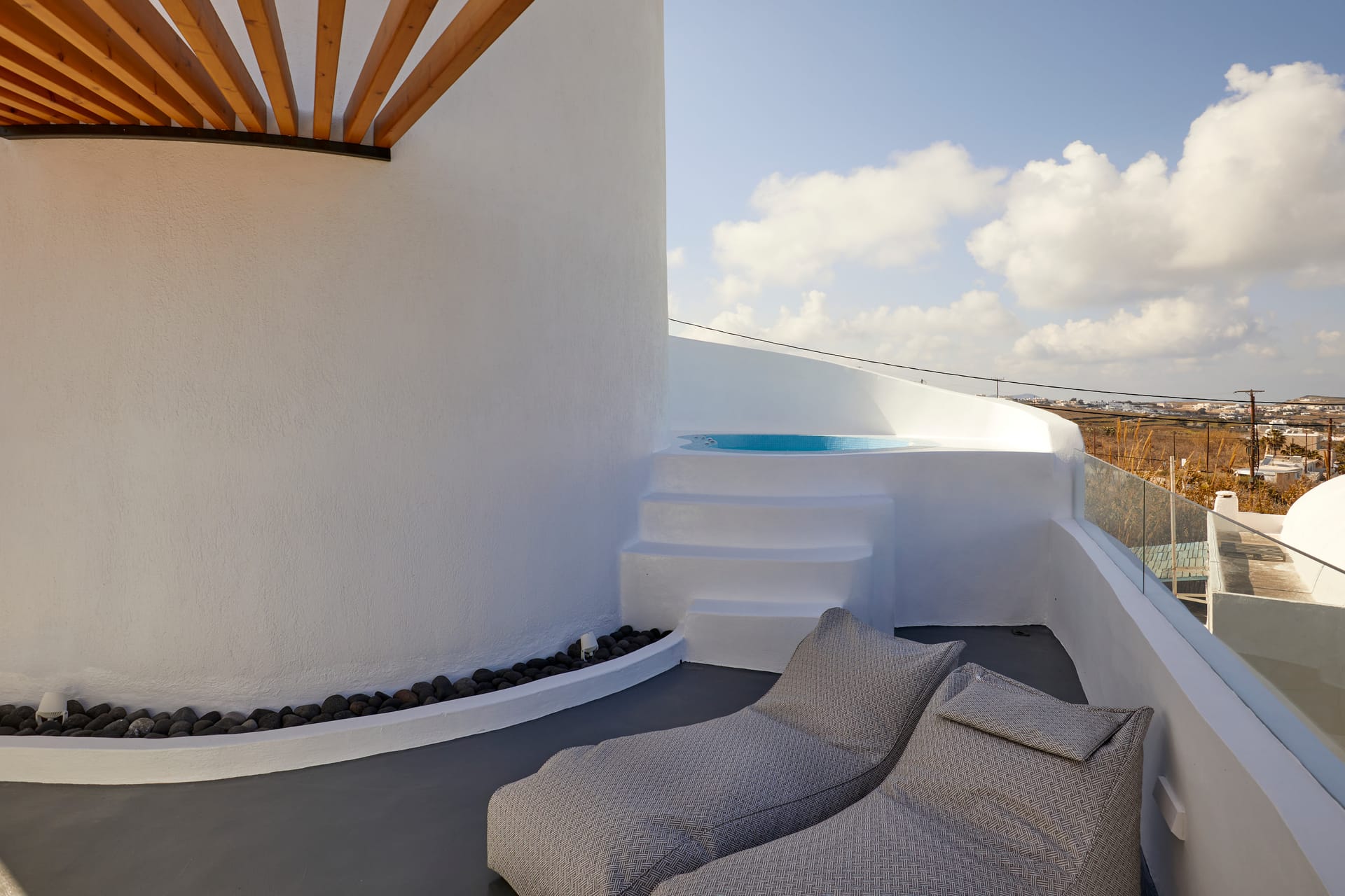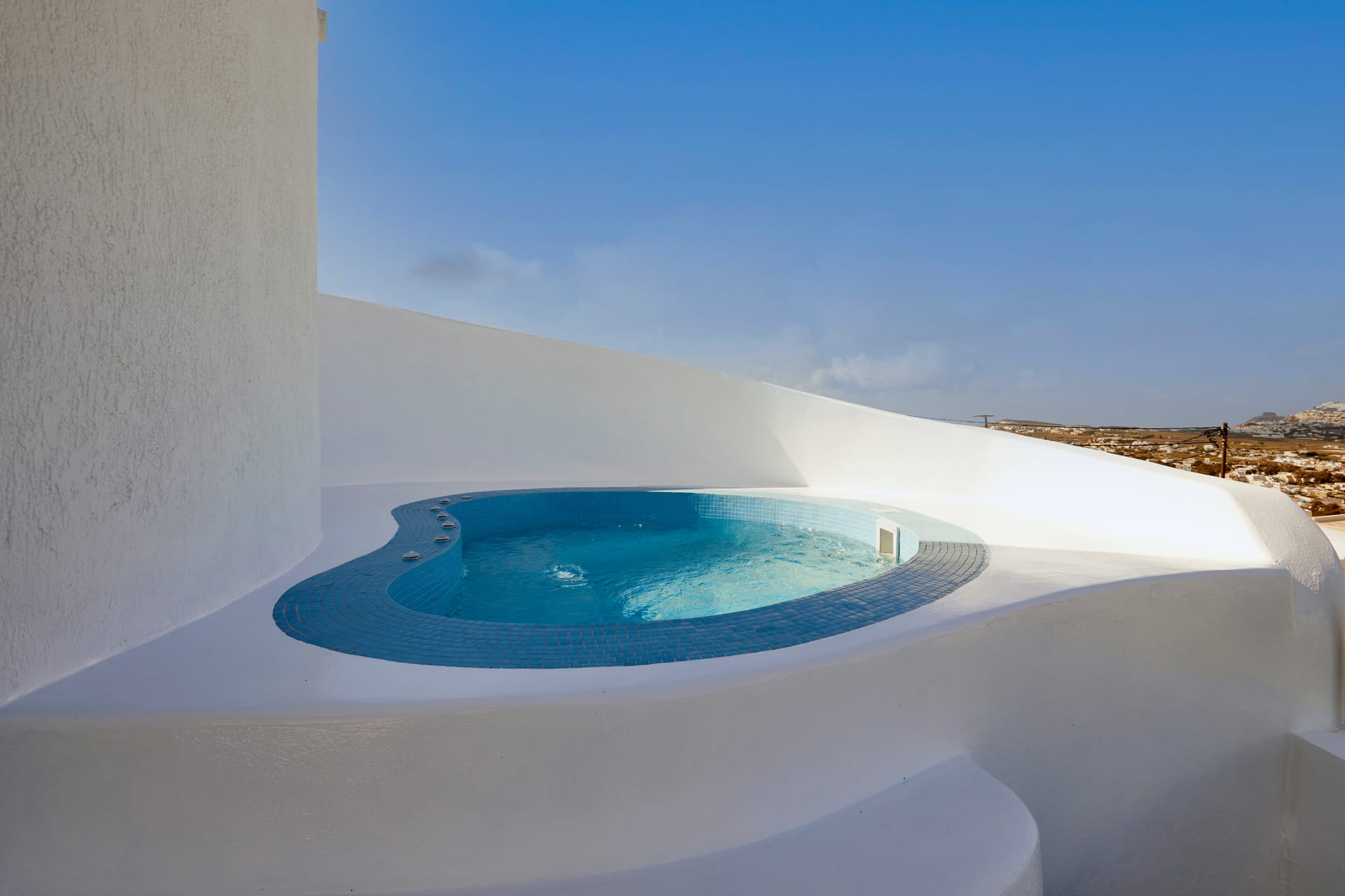Chill out in the outdoor seating area and plan your next expedition to discover the island. Admire a panoramic view to the azure waters of the Aegean Sea while drinking your morning coffee at your balcony or relish a nice meal with a view to the picturesque surrounding villages. The suite has a private heated jetted tub that will help you relax and rejuvenate your spirit.