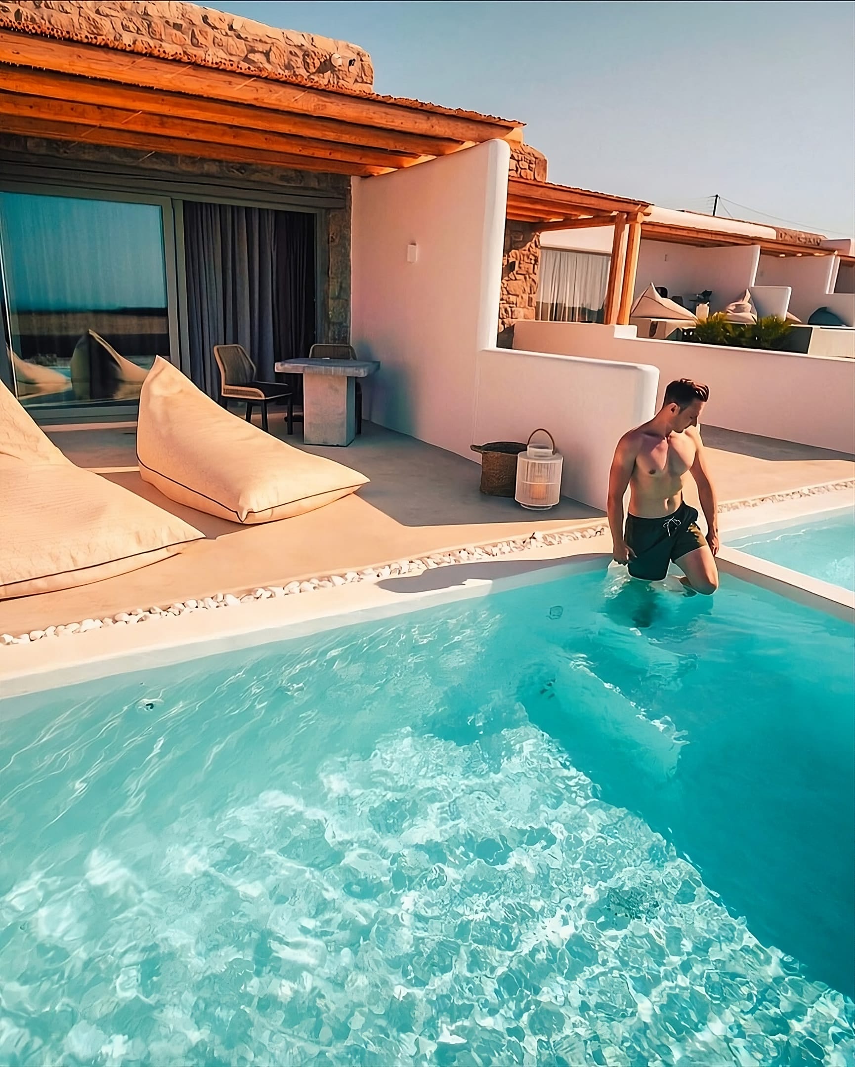 A luxurious 20-22 m2 suite designed for two, featuring the choice of a queen-size double bed or twin beds for your comfort. Enjoy a serene terrace with views of the Aegean horizon and the indulgence of a private pool, perfect for a tranquil getaway.