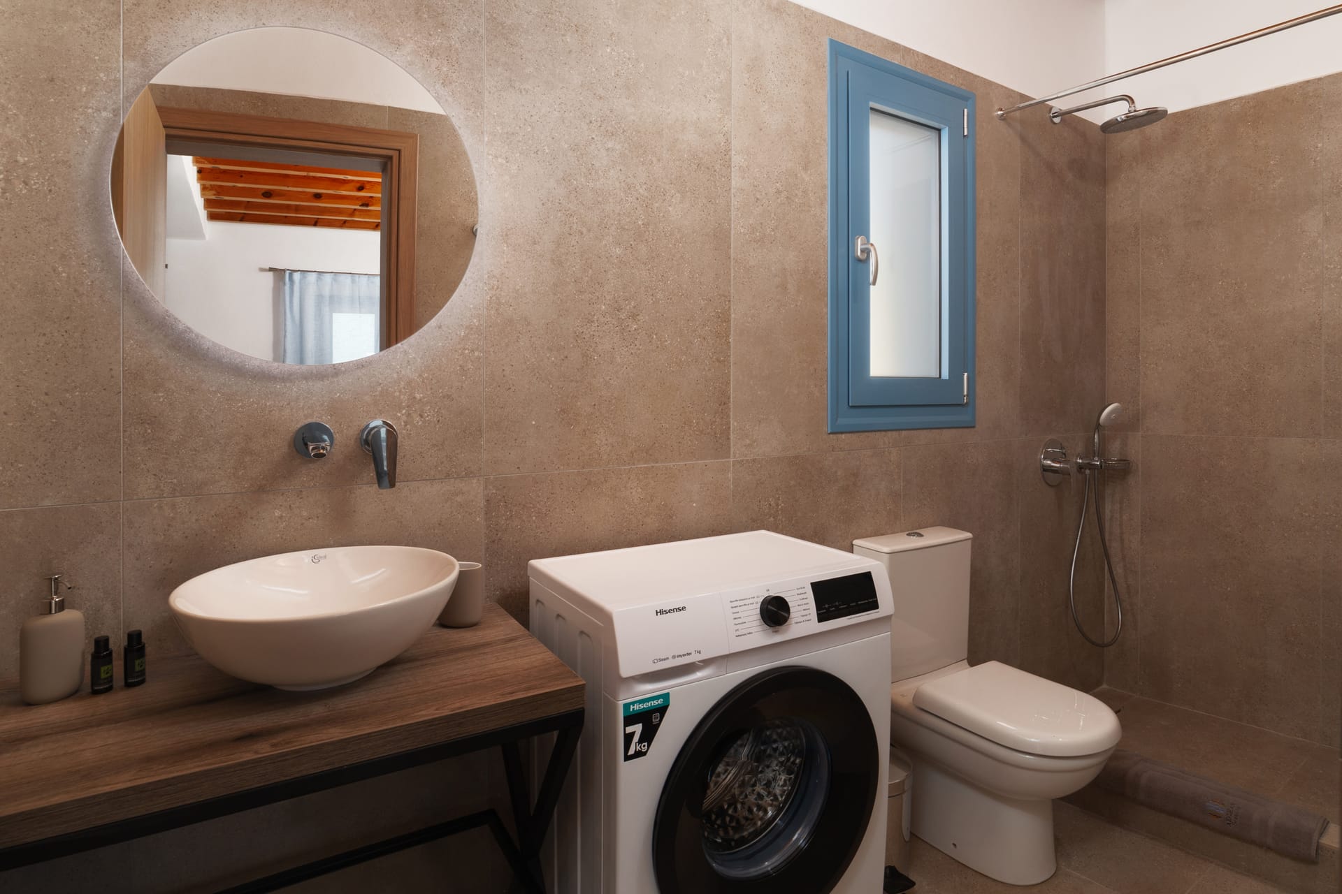 The bathroom is fully equipped with all necessities and includes a washing machine.