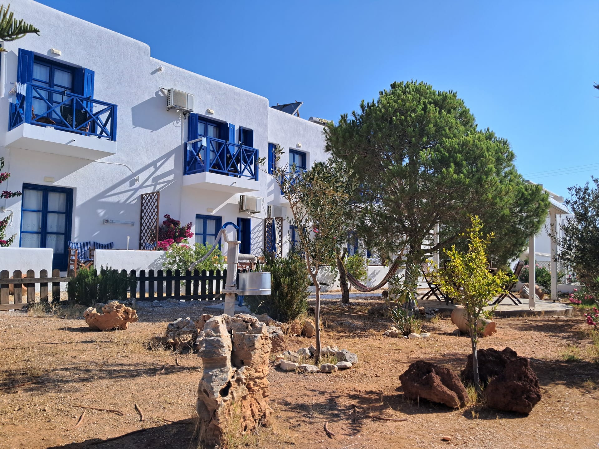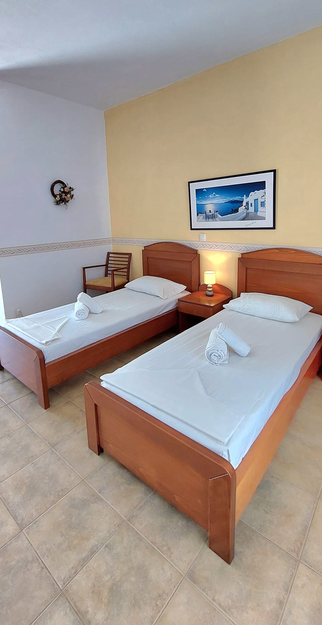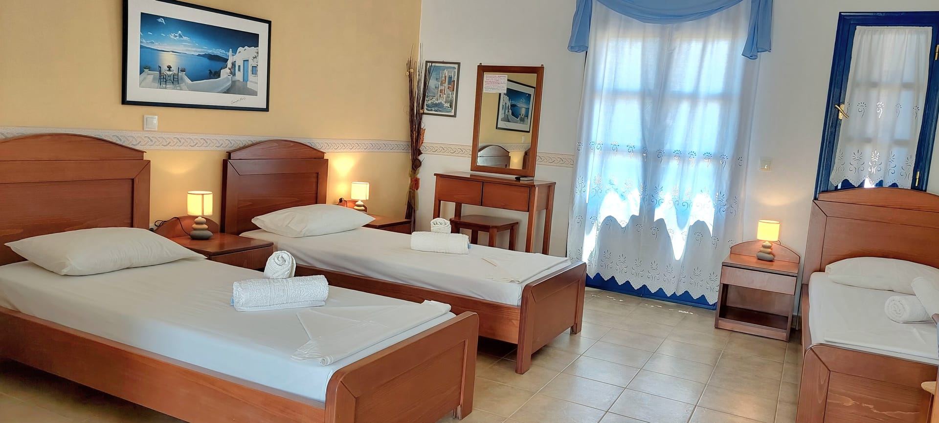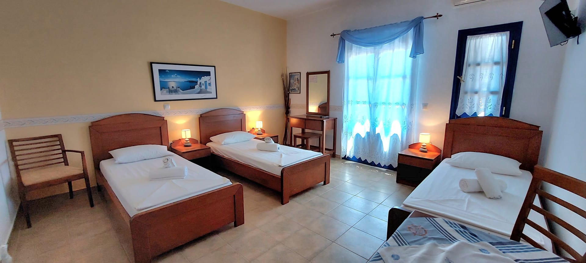 All studios consist of one bedroom, sitting area, bathroom with shower, kitchenette, private veranda with sea view of the picturesque port of karavostasi TV, A/C, hair dryer, bathroom amenities. Studios can accommodate from 2-3persons and is 35 sq.m.