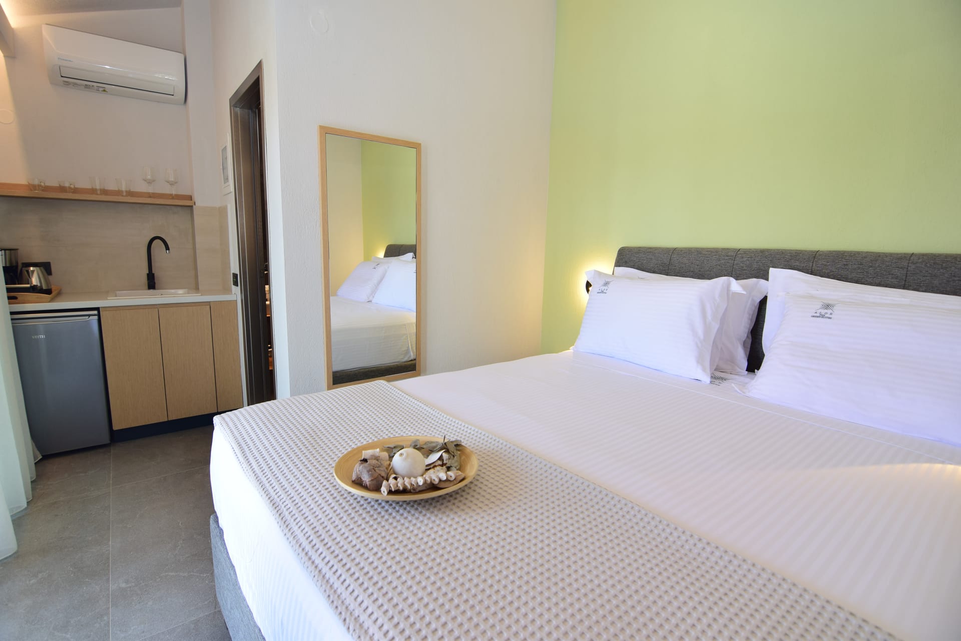 The property features 4 traditionally decorated studios with characteristic stone walls, wooden details, and a warm, island-inspired atmosphere. Each studio can accommodate up to 4 guests and includes a private bathroom, air conditioning, flat-screen TV, mini fridge, and free Wi-Fi.