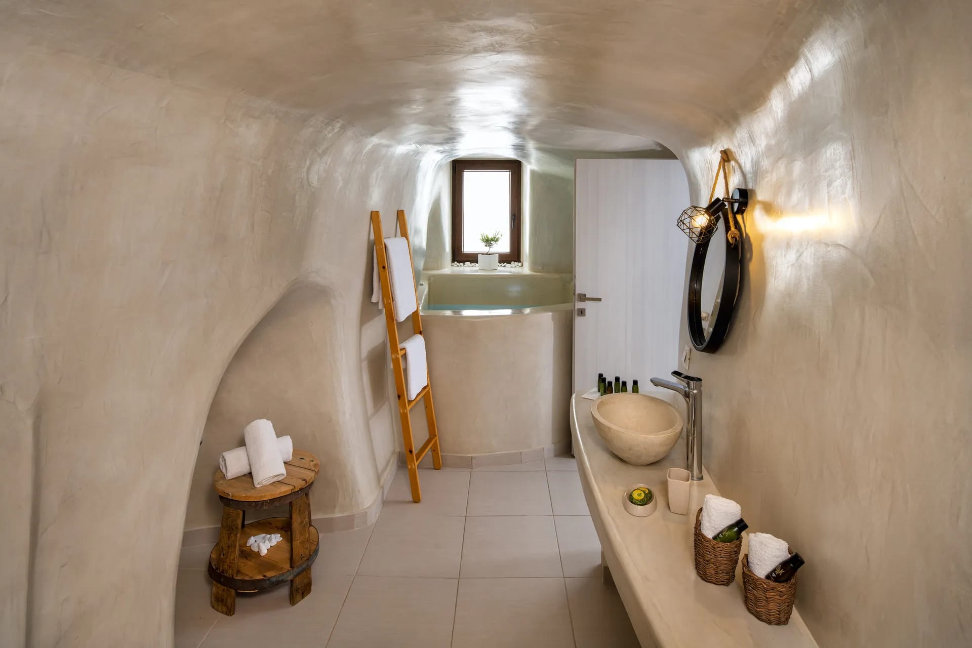 Indulge in the luxury of both indoor and outdoor hot tubs, perfect for relaxing any time of day. Step out onto your private sun-drenched terrace, complete with sunbeds, where you can bask in the Aegean light in total seclusion.