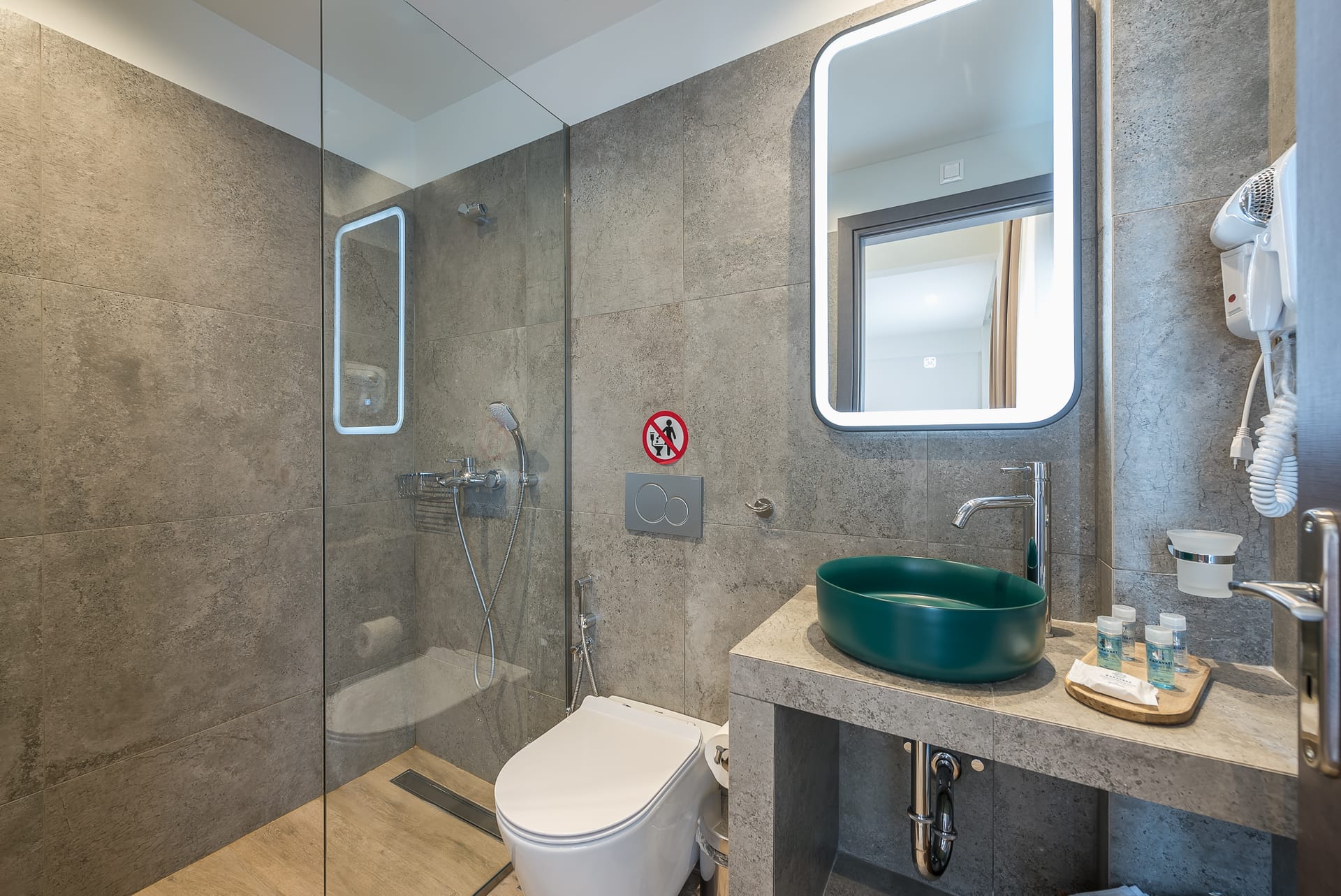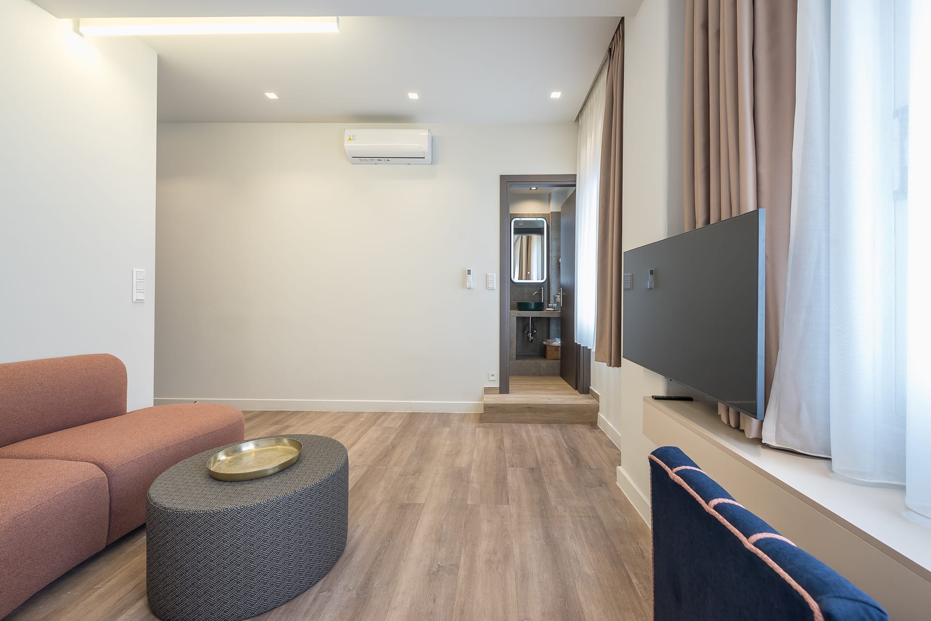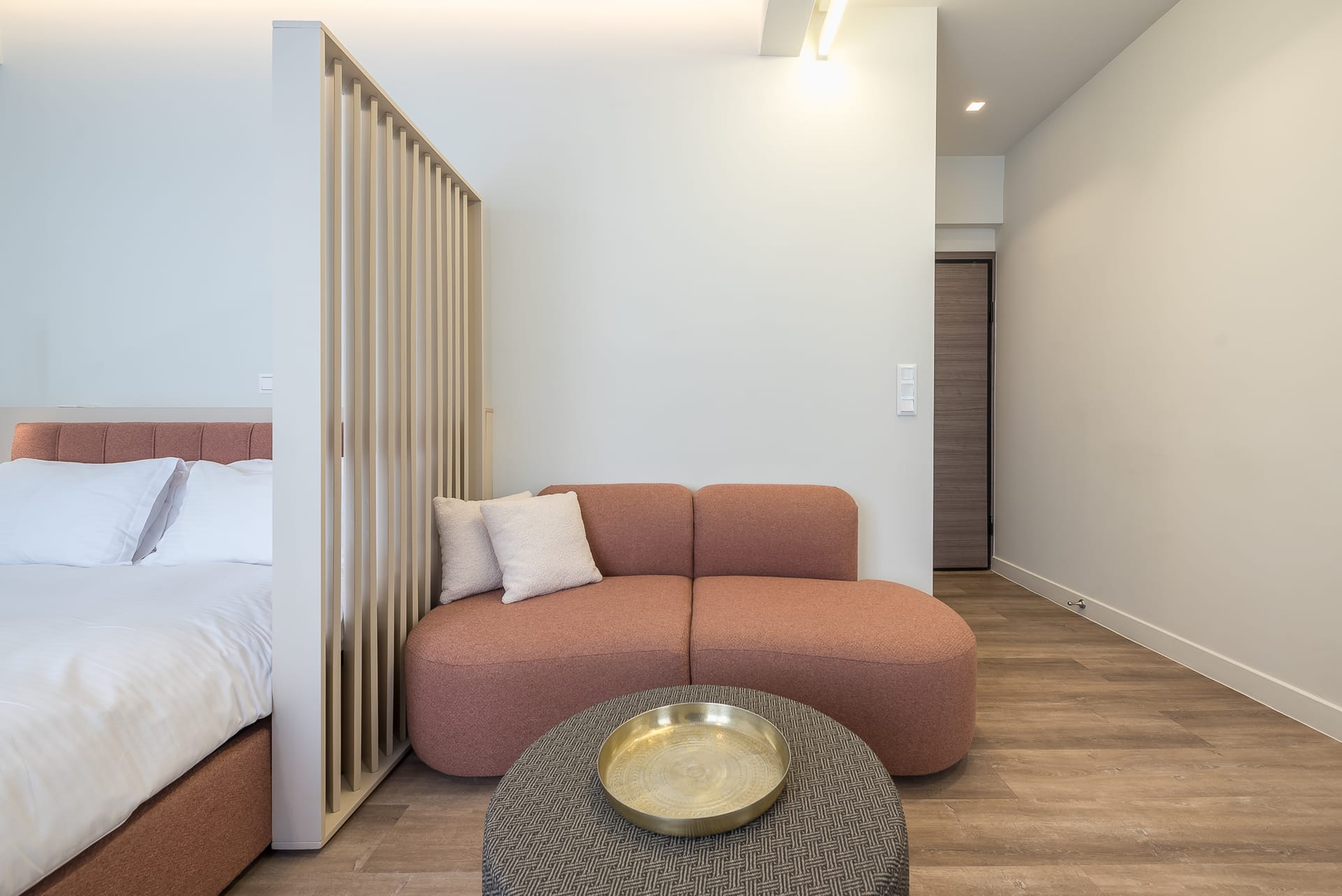Step into the realm of opulence within our Deluxe Double Room at Aeiphoria Suites & Rooms, where luxury meets comfort in perfect harmony. The majestic king-size bed beckons you to sink into its embrace, while the inviting sofa offers a cozy nook for relaxation. Sip on freshly brewed coffee from the in-room coffee maker as you unwind with your favorite show on the sleek smart TV. The ensuite bathroom, adorned with plush bathrobes and slippers, invites you to indulge in a moment of tranquility. With every detail meticulously curated, this room is a sanctuary of serenity amidst the vibrant cityscape.