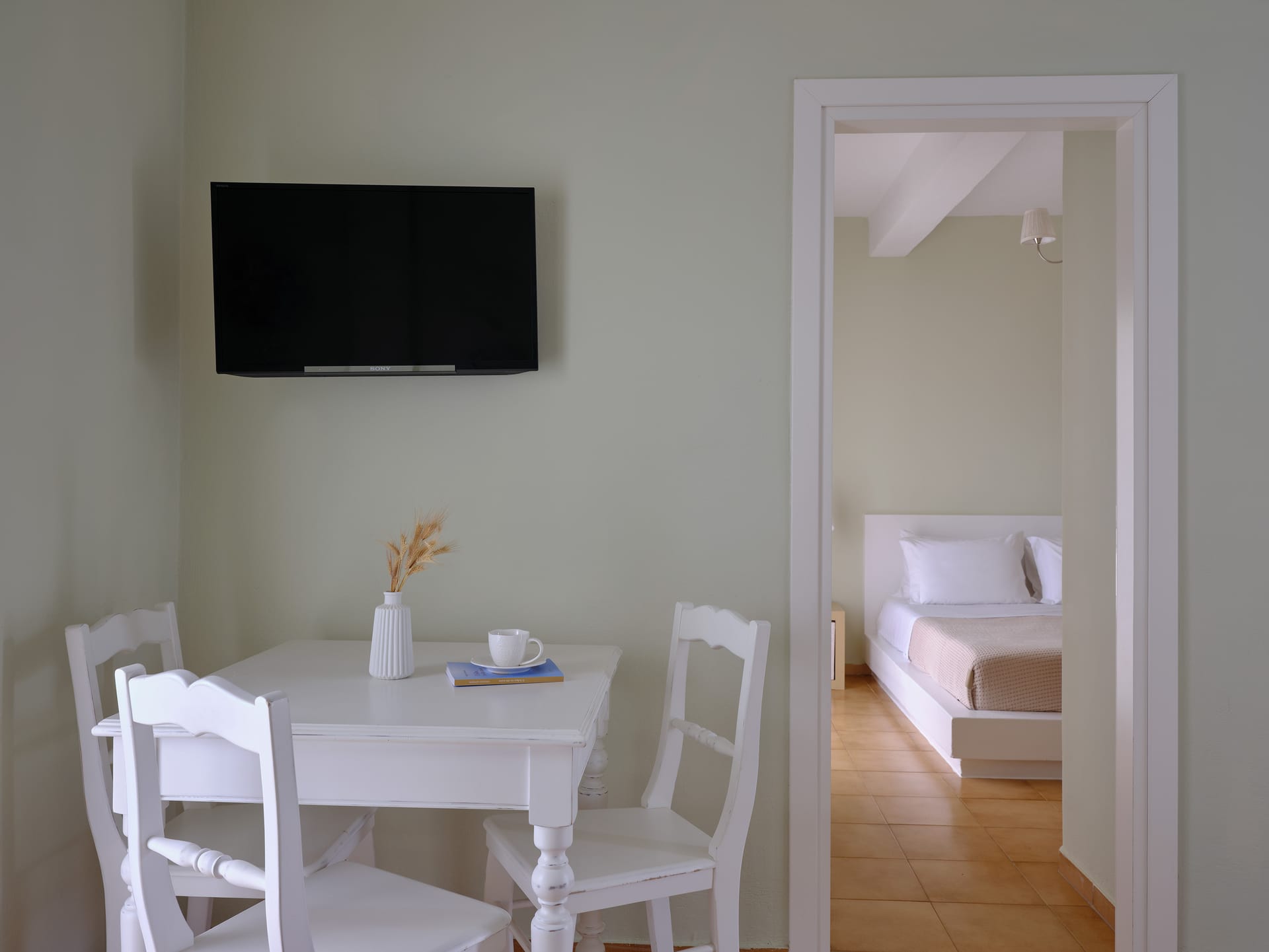These apartments accommodate up to 3 adults or 2 adults and one child while the interior design is characterized by romantic touches that make the difference in the authentic all-white island decoration. Located on the ground level, featuring a double bed, a sitting area with one comfortable built-in couch, a bathroom with a tainfall shower and a furnished veranda with garden views. Your ideal apartment for you and your beloved family!