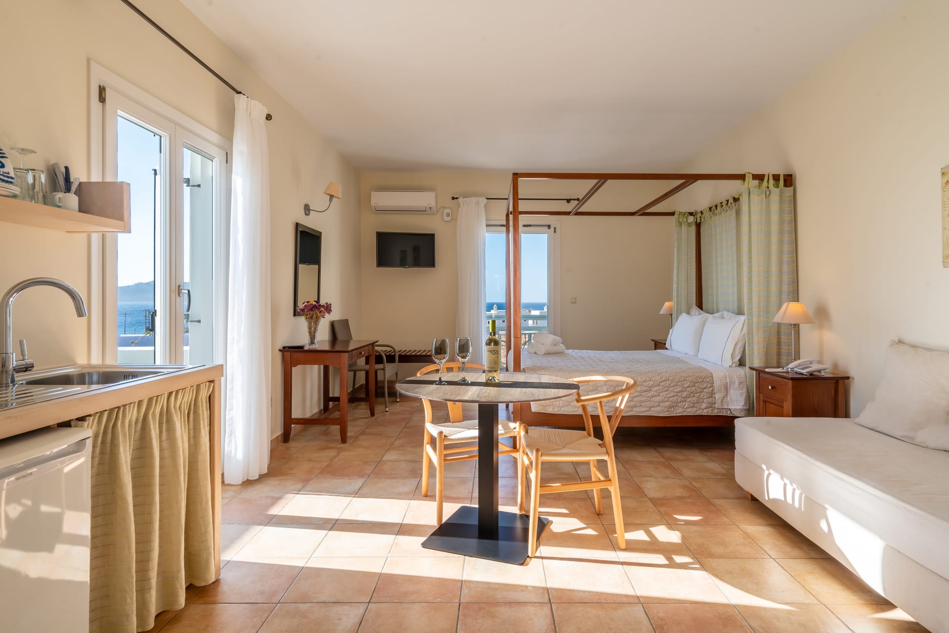 The Double/Triple Sea View Room at Aeolos Koufonisi offers a superior accommodation experience, combining Cycladic aesthetics with the absolute sense of freedom created by the unobstructed view of the Aegean Sea. Ideal for 2–3 people, it is an excellent choice for couples, friends or small families seeking elegance, tranquility and authentic island hospitality.