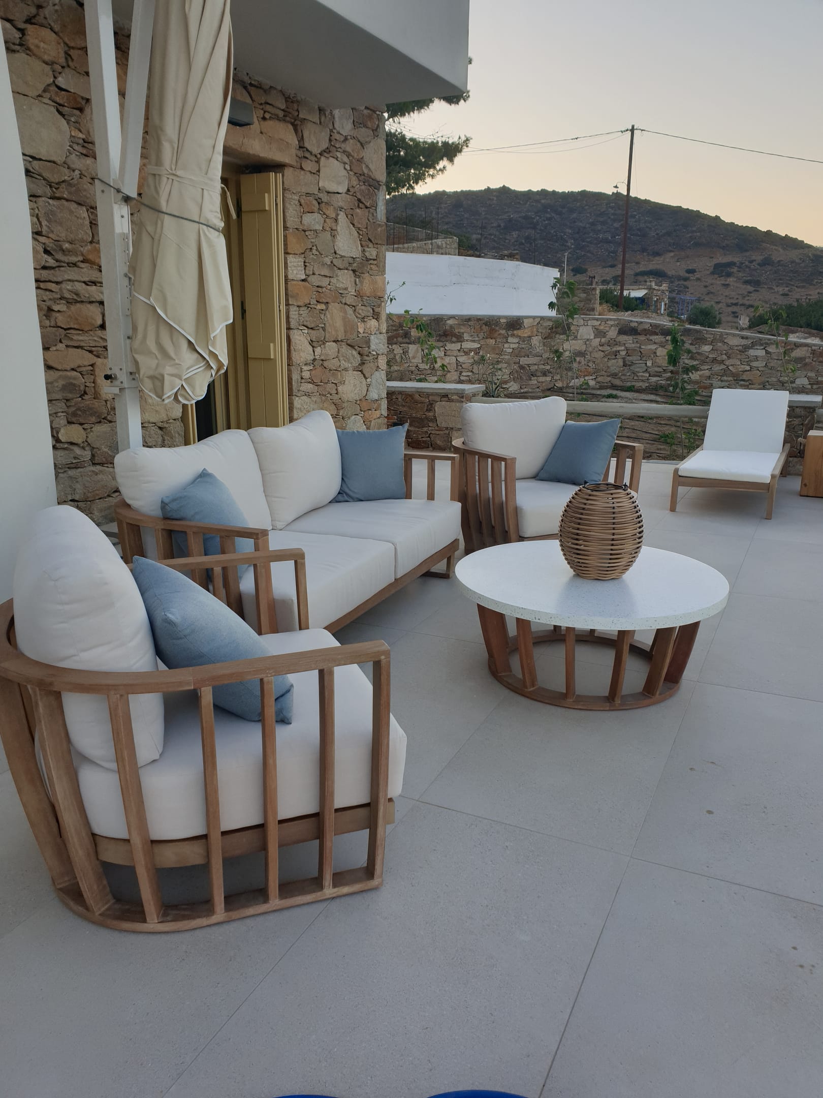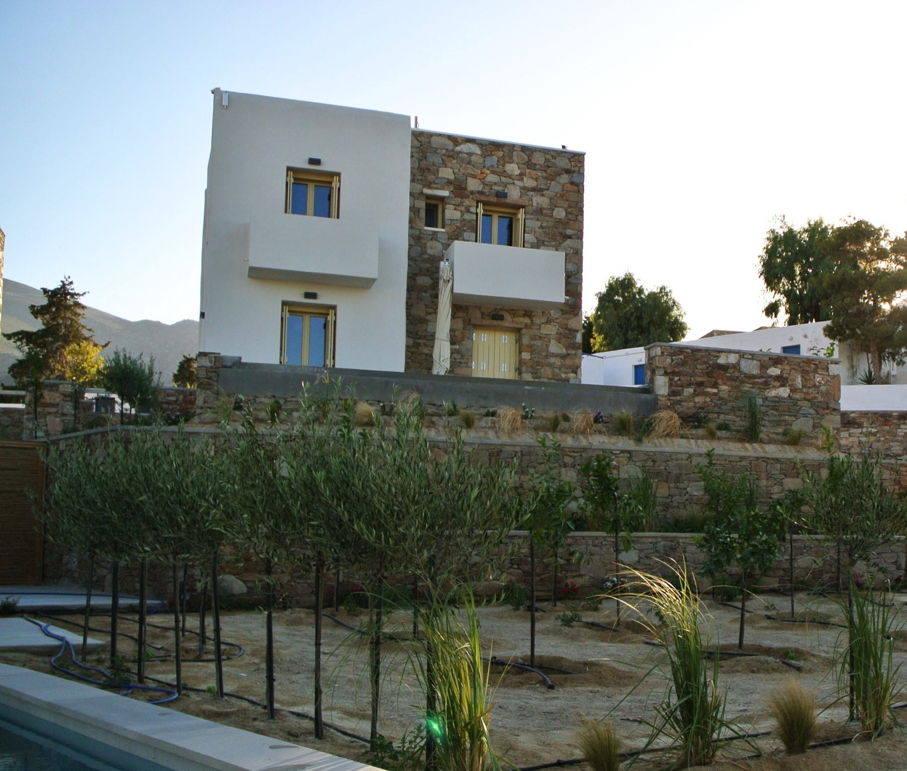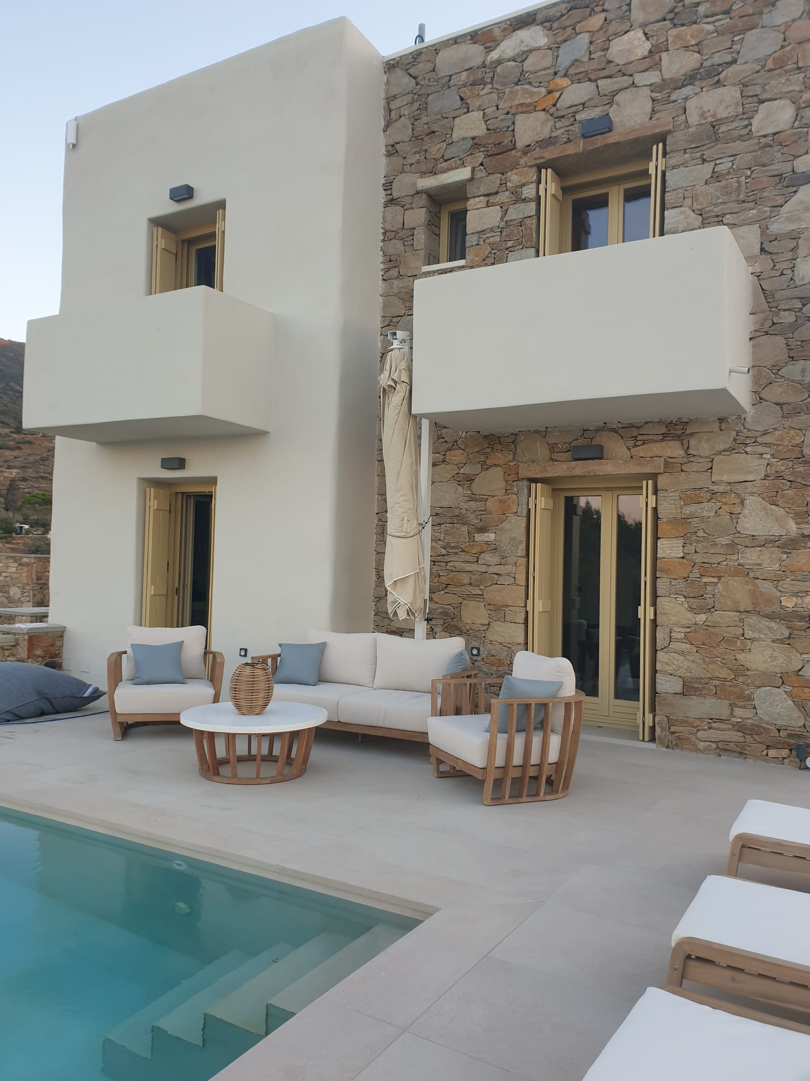 Two-storey stone-built villa of 75 sqm with private pool. On the first floor, there are 2 bedrooms with king-size beds, a private balcony with unlimited sea views, and a bathroom. On the ground floor, there is a living room with 2 built-in beds-sofas, a dining room, a fully equipped kitchen, and a WC. It is decorated with modern materials following the Cycladic architecture where stone and wood dominate.