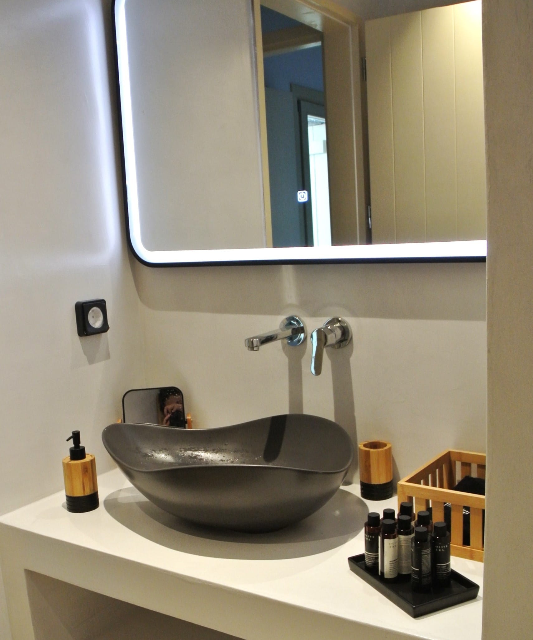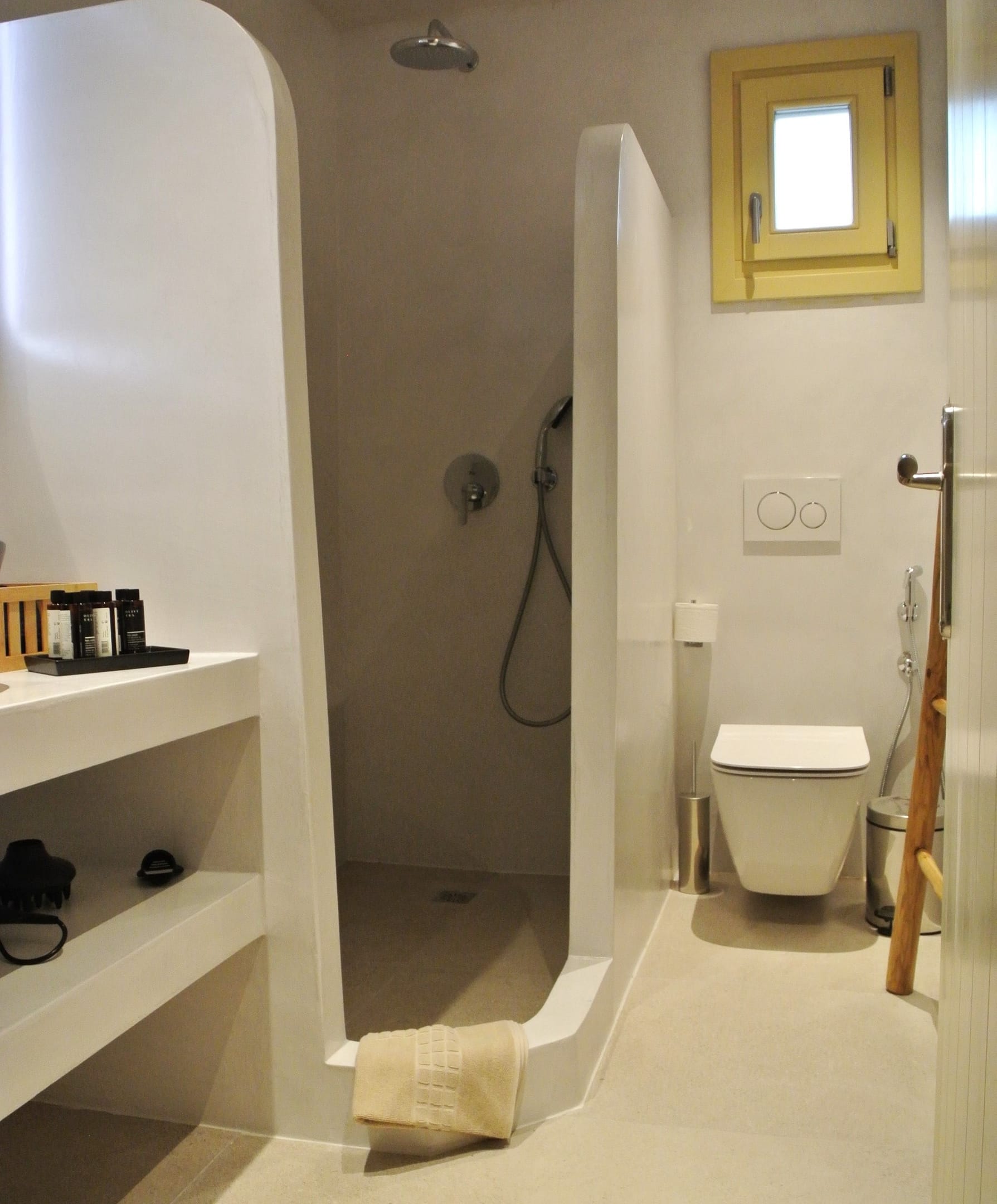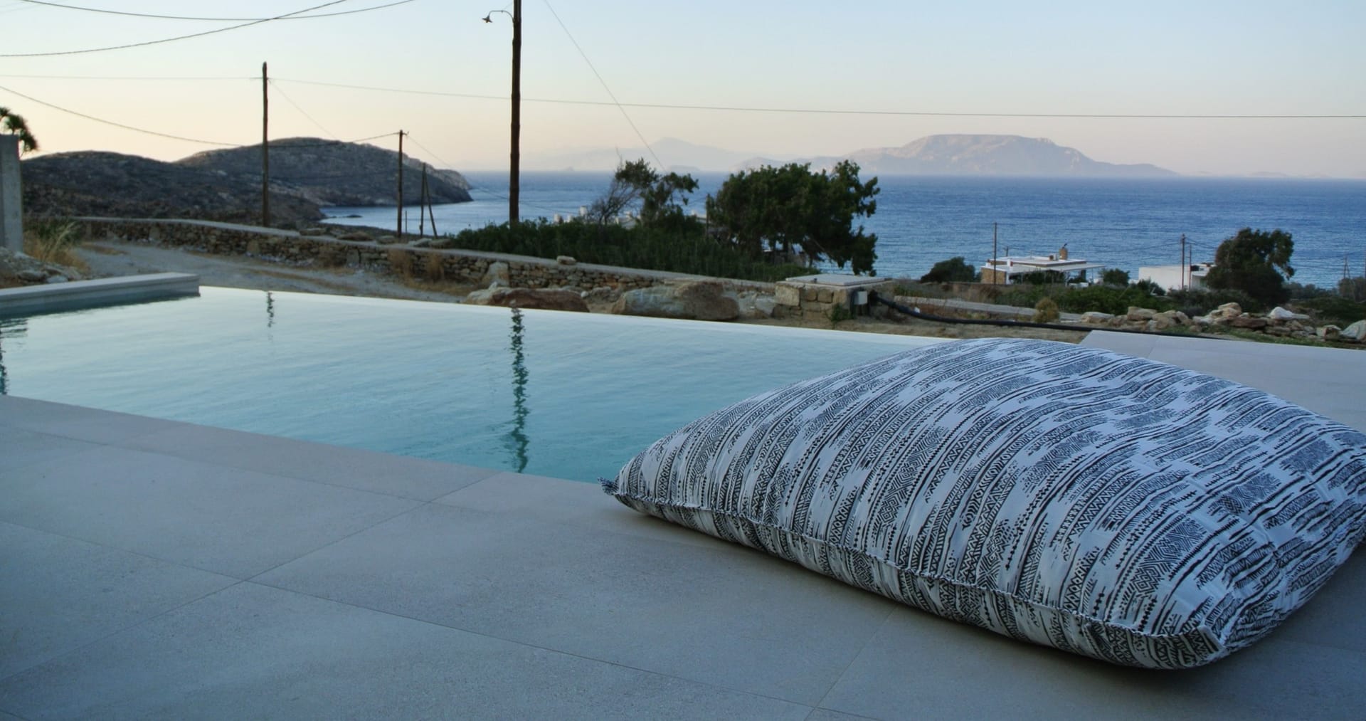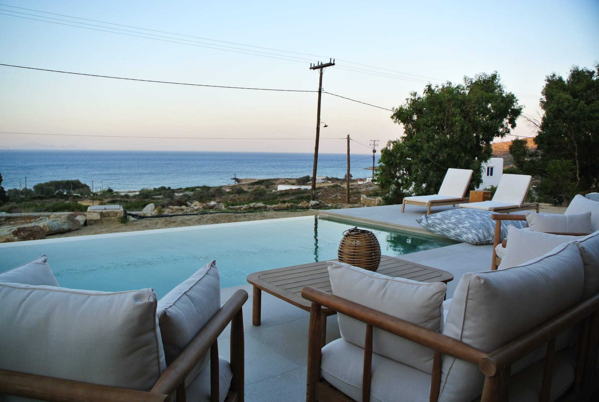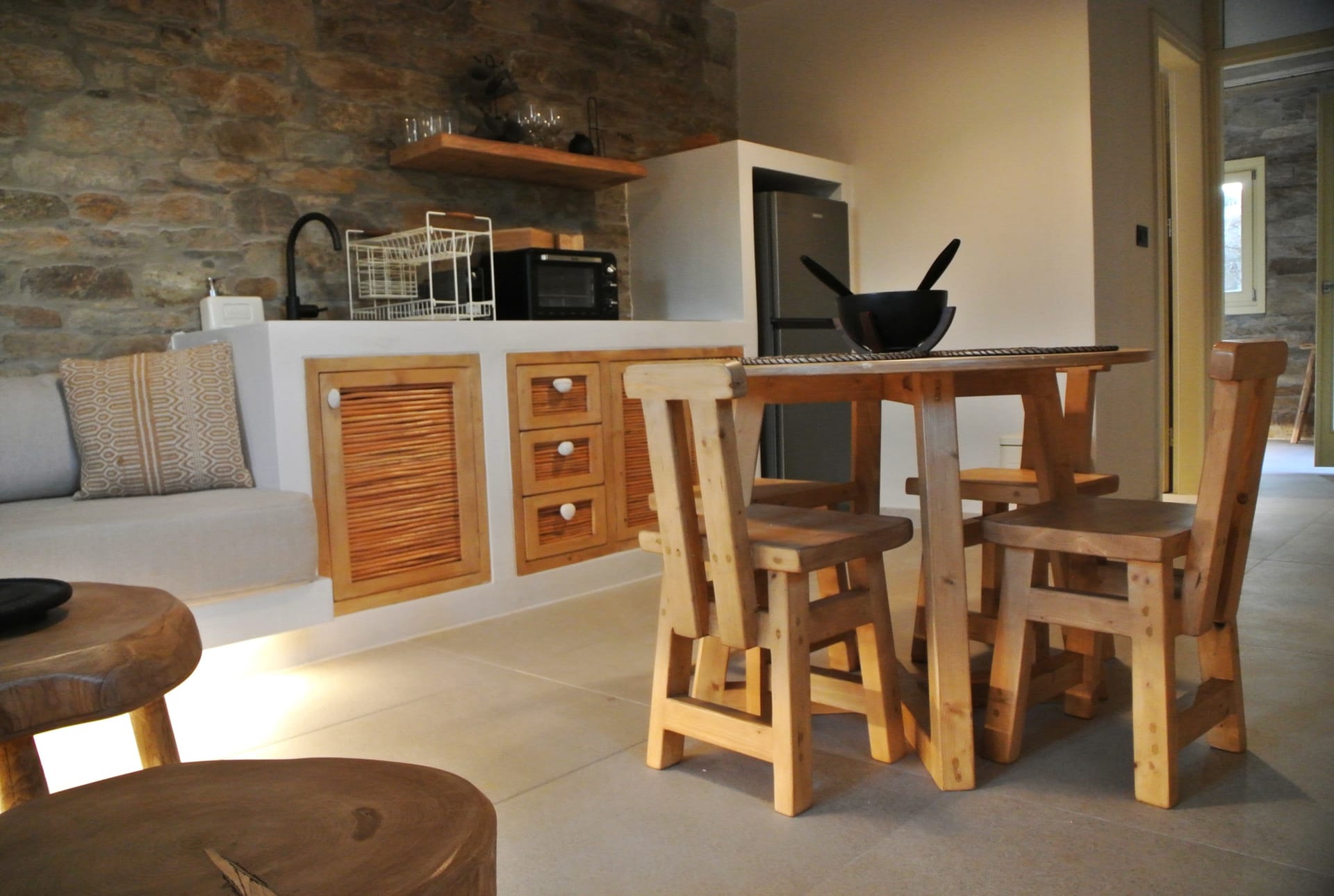 Ground floor stone-built villa of 50 sqm with private pool. It is decorated with modern materials following the Cycladic architecture with stone and wood being the dominant elements. It consists of a bedroom with a king-size bed and a living room with 2 built-in sofa beds. It has a fully equipped kitchen, dining room, and bathroom.