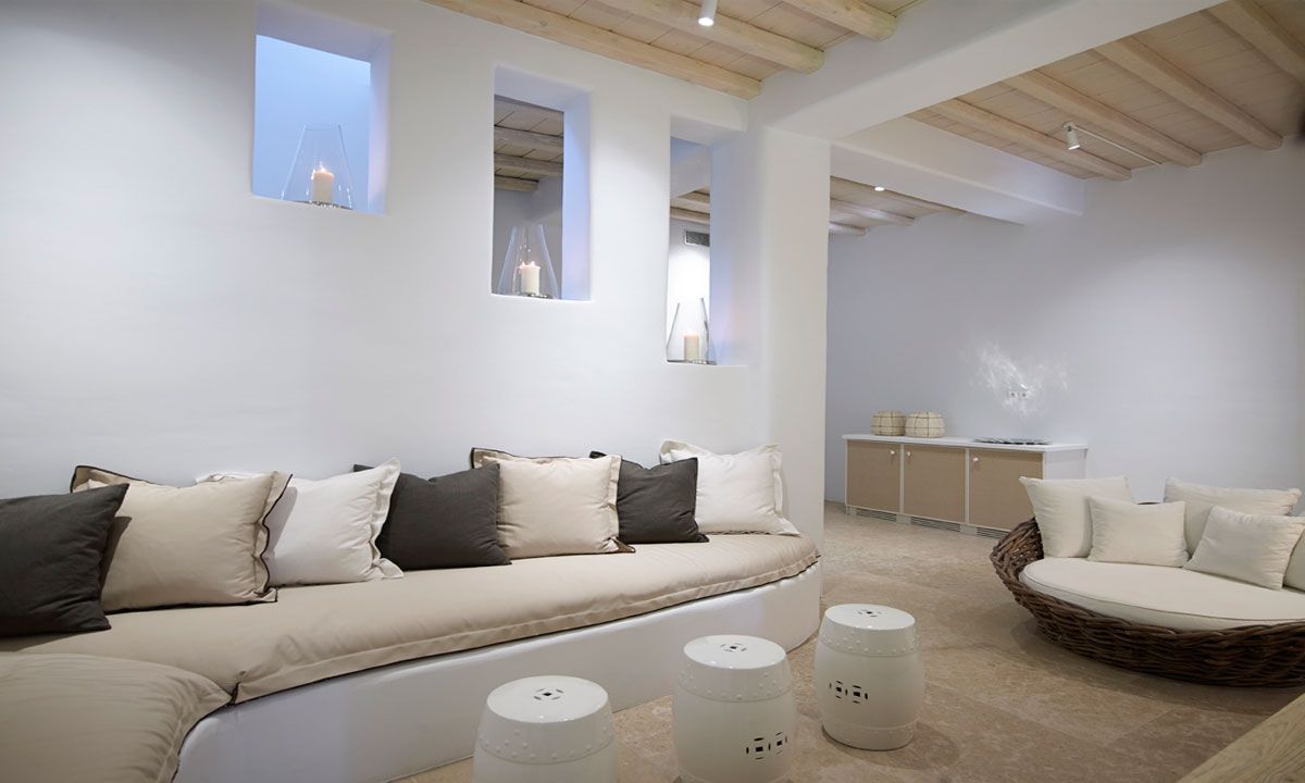 The villa's elegant white interiors and exteriors, along with tasteful decorations, reflect the island's Mykonian elegance, so guests can fully immerse themselves in the spirit of the island. The villa comes with daily complimentary maid service, 24/7 CCTV monitoring at the periphery of the estate to detect unauthorized people, Netflix to enjoy relaxed adventures, flat-screen TVs for everyone's enjoyment, backup generators to face frequent local electric shortages, a desalination plant to ignore frequent local water shortages, and a 24/7 gate-access control.