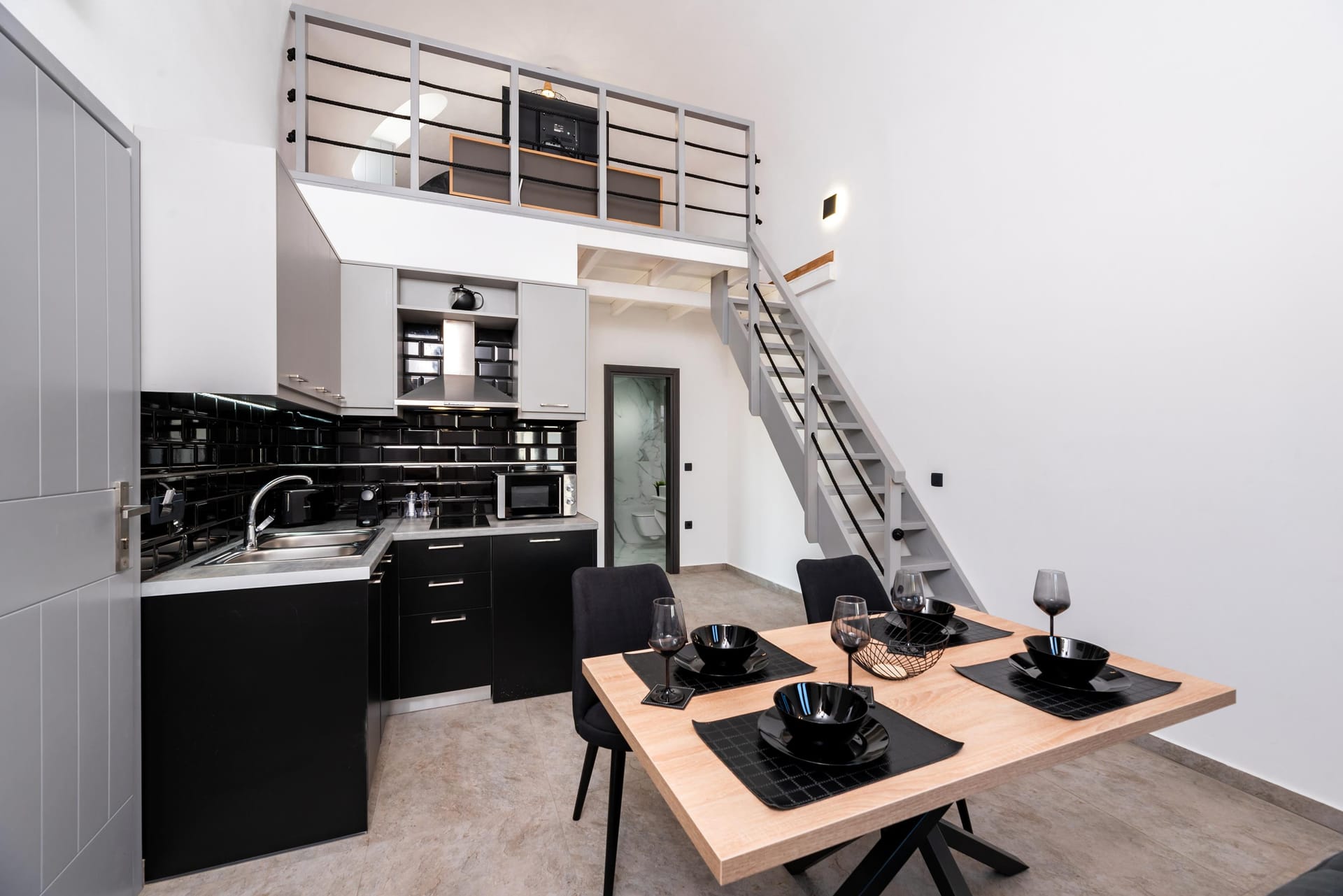 Villa Apollonia is ideal for couples or families with older children who want to vacation together, but still value their privacy. The villa has a main entrance, dining room, living room, and kitchen on the pool level, which lead to two bedrooms that share a bathroom. There's also a separate entrance on the ground level that leads to a large bedroom, kitchenette, living-dining area, and a bathroom.