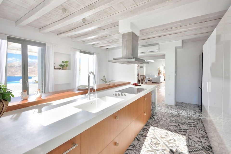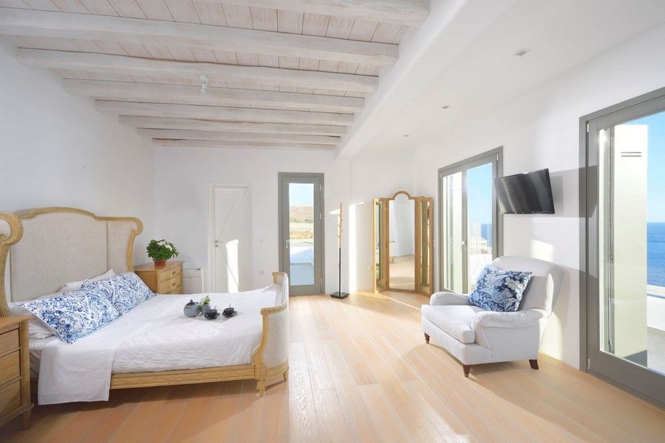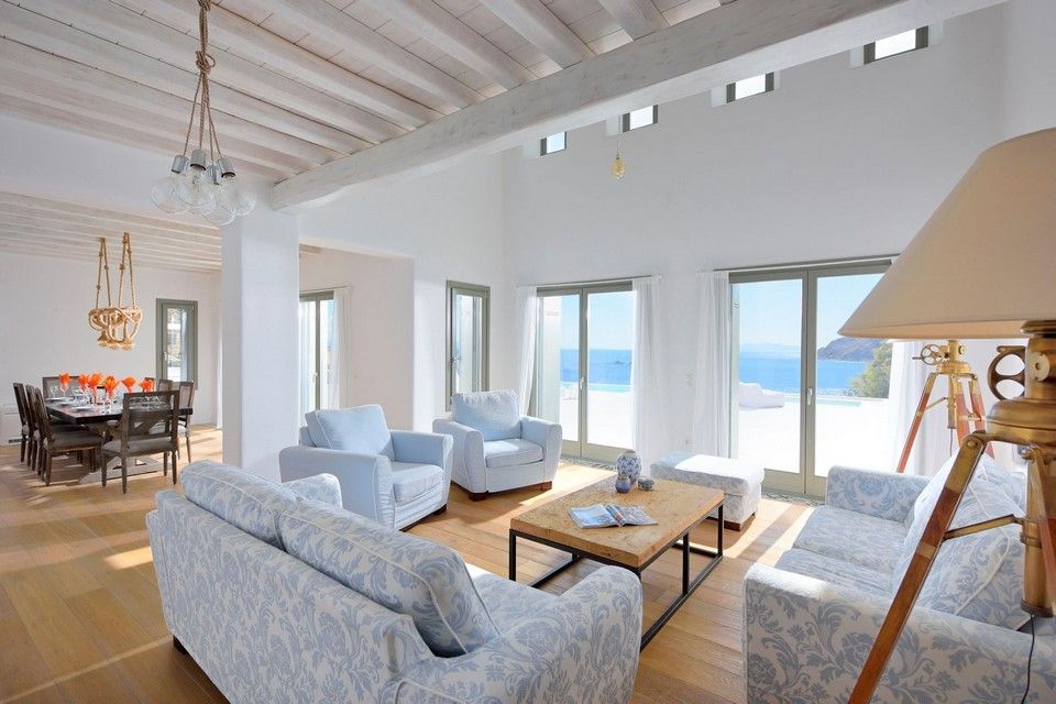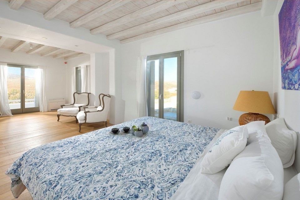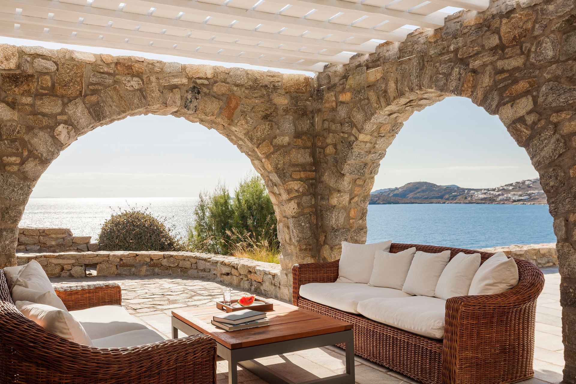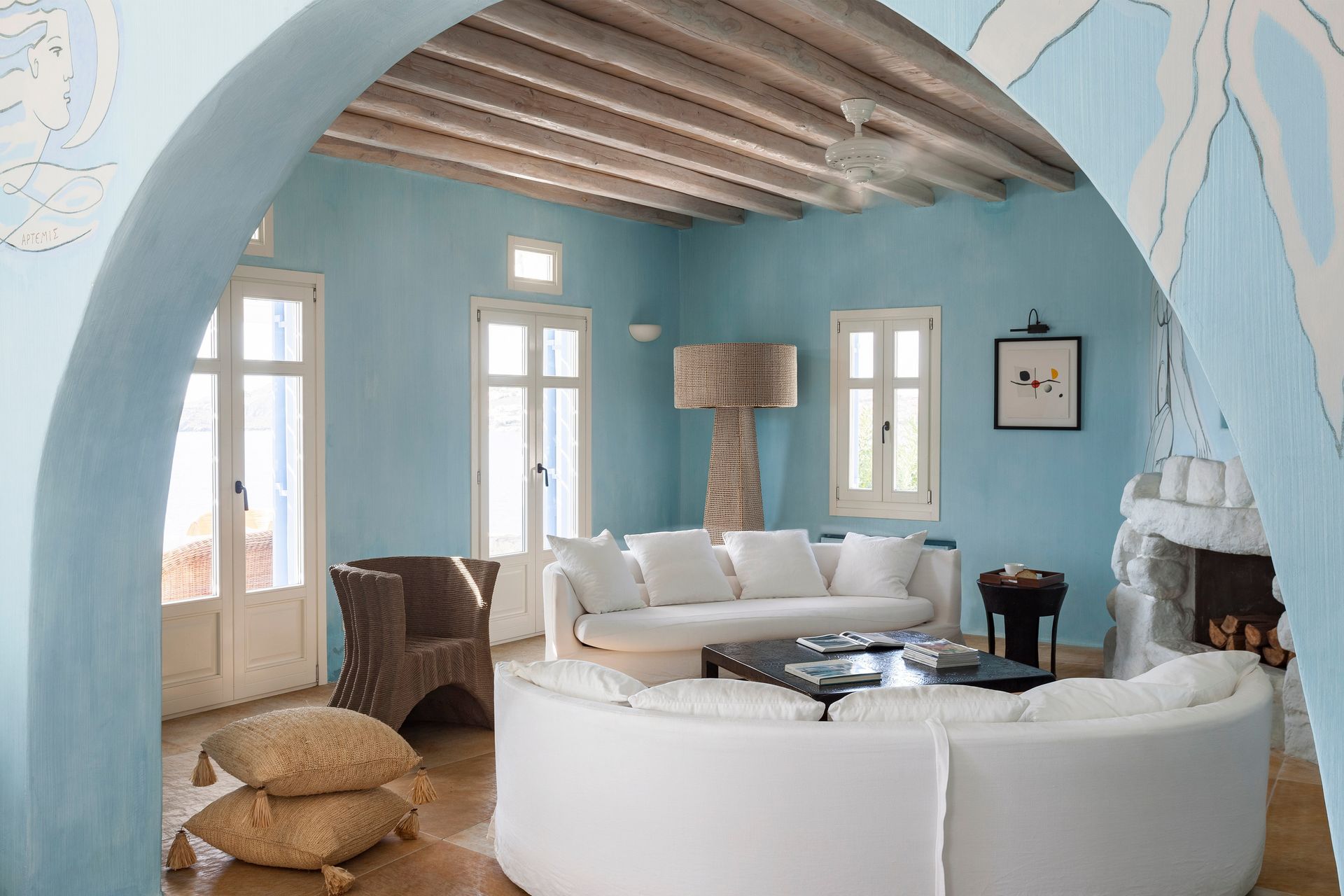 Inside, the villa features rich indoor colors and designs intentionally crafted to distract and inspire guests from the over-powering natural beauty of the island. The curvaceous furniture complements the island's unique rounded Cycladic architecture. In contrast, the exterior draws upon magnificent fiery-colored stone-chiseled walls and broad flagstones to blend into the natural zeitgeist of the island's wild-side.