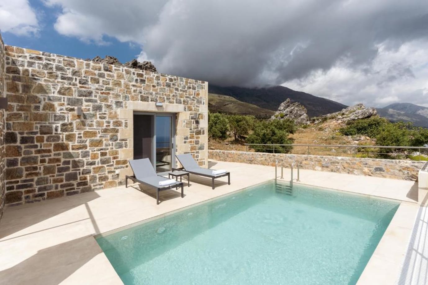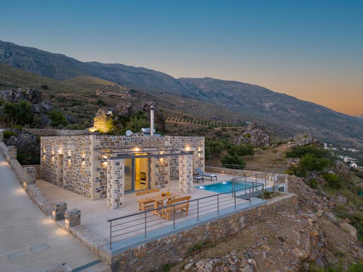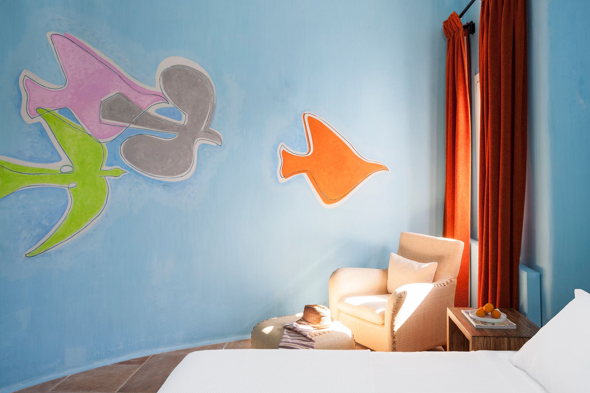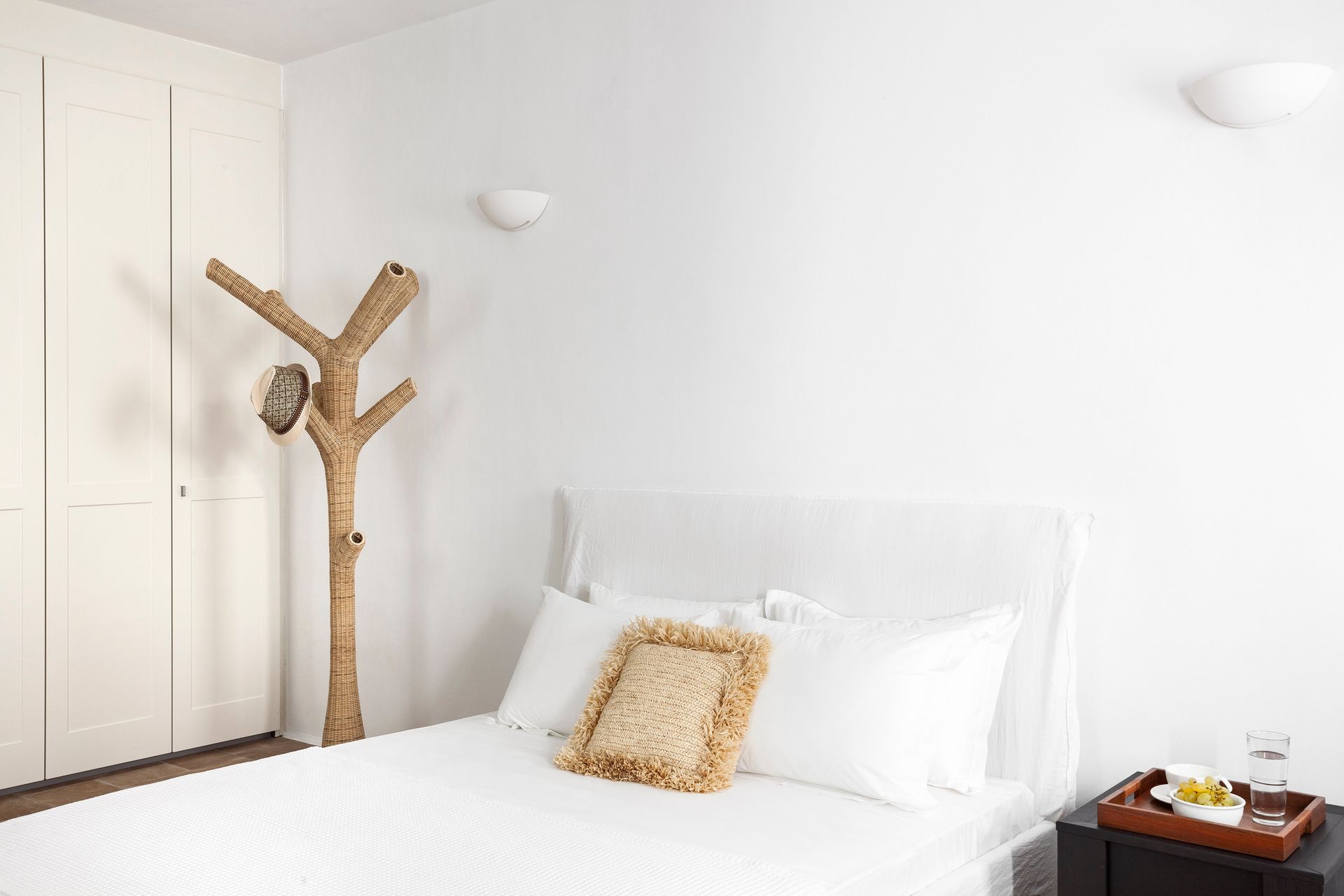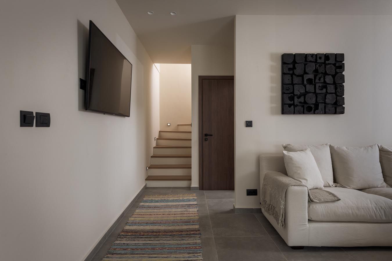 Inside, the villa features rich indoor colors and designs intentionally crafted to distract and inspire guests from the over-powering natural beauty of the island. The curvaceous furniture complements the island's unique rounded Cycladic architecture. In contrast, the exterior draws upon magnificent fiery-colored stone-chiseled walls and broad flagstones to blend into the natural zeitgeist of the island's wild-side.