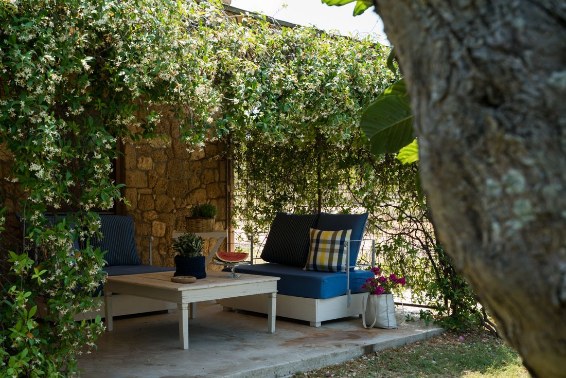 Each maisonette can accommodate 5 persons max. On the ground floor, there is the living room with a masonry sofa-bed, the kitchen, the bathroom and a room with two single masonry beds. Inside the maisonettes there are masonry stairs that lead to the master bedroom which has a king-sized bed. All maisonettes dispose of a yard with a lounge and a balcony with a masonry sofa, an ideal place from which one can enjoy the unique Ionian Sea sunset.Facilities & services of maisonettes: 2 air conditioners, radiators, a fireplace, TV, DVD Player, satellite TV, kitchen electrical appliances and domestic ware, coffee machine, iron and ironing board, hairdryer, safe, 2 wardrobes, sheets, towels, swimming pool towels, body care items, centrally-located washing machine & dryer. Daily room-cleaning. Bed sheets are changed twice a week and towels are changed every two days.
