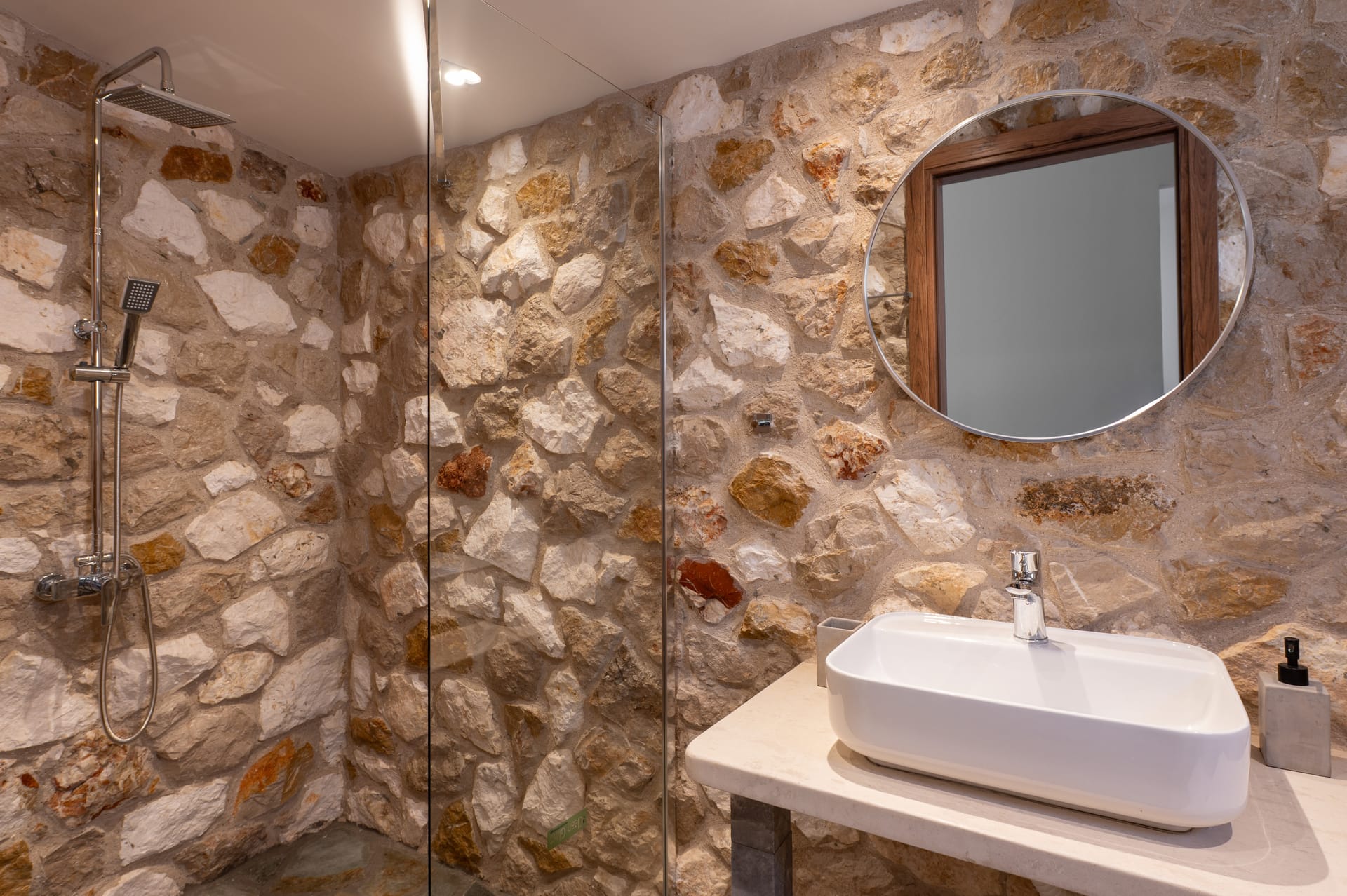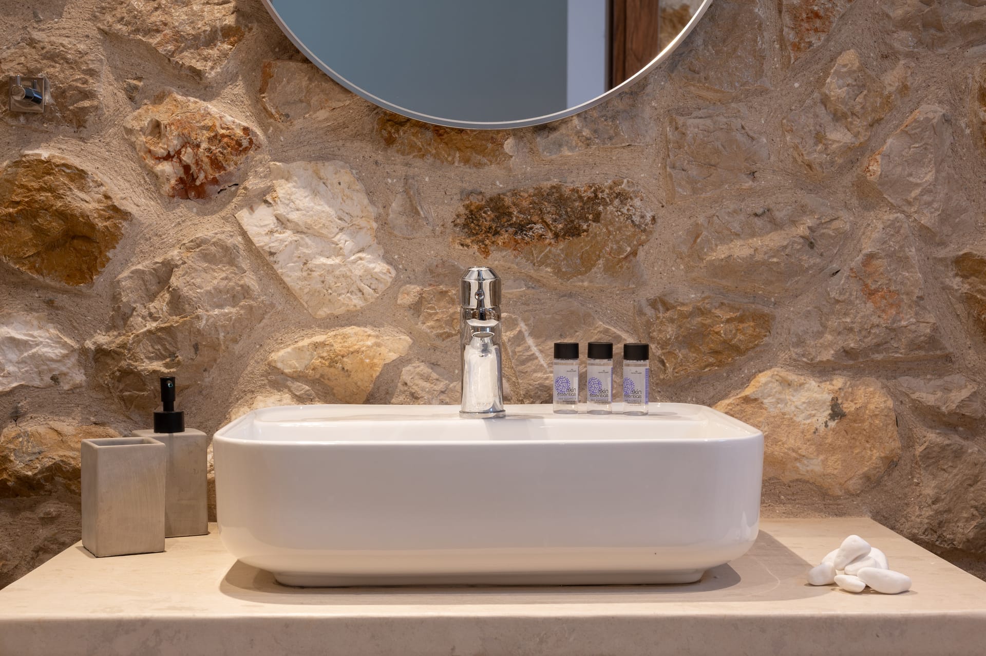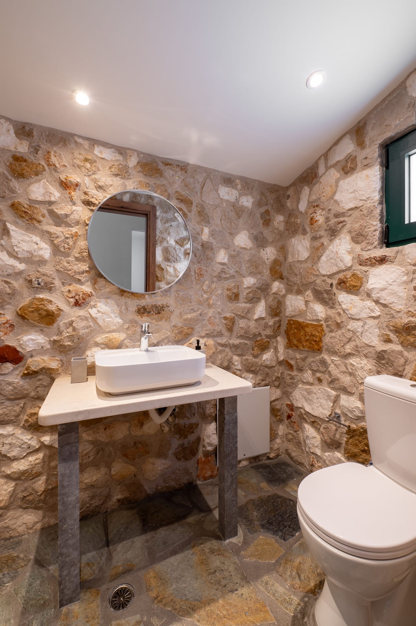 Stone walls and wooden accents give the space a warm, authentic feel. The large balcony offers stunning sea views and an outdoor dining area—perfect for enjoying the sunlight and sea breeze throughout the day.