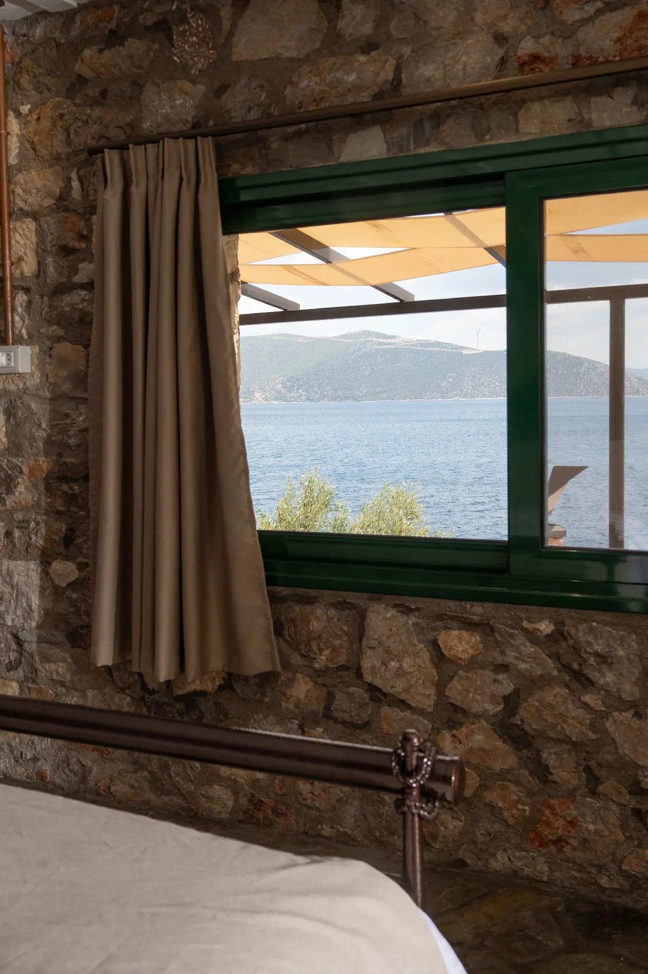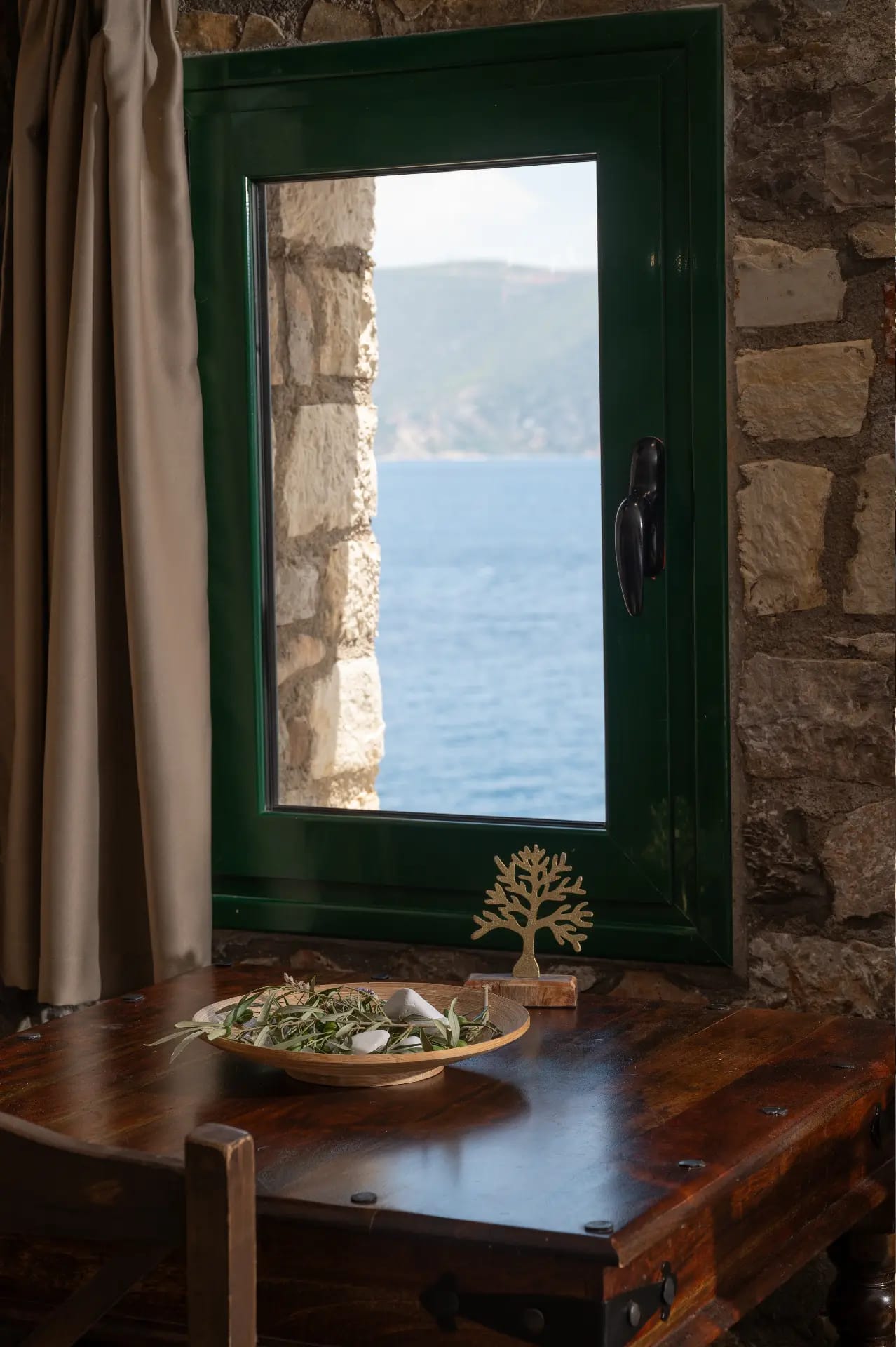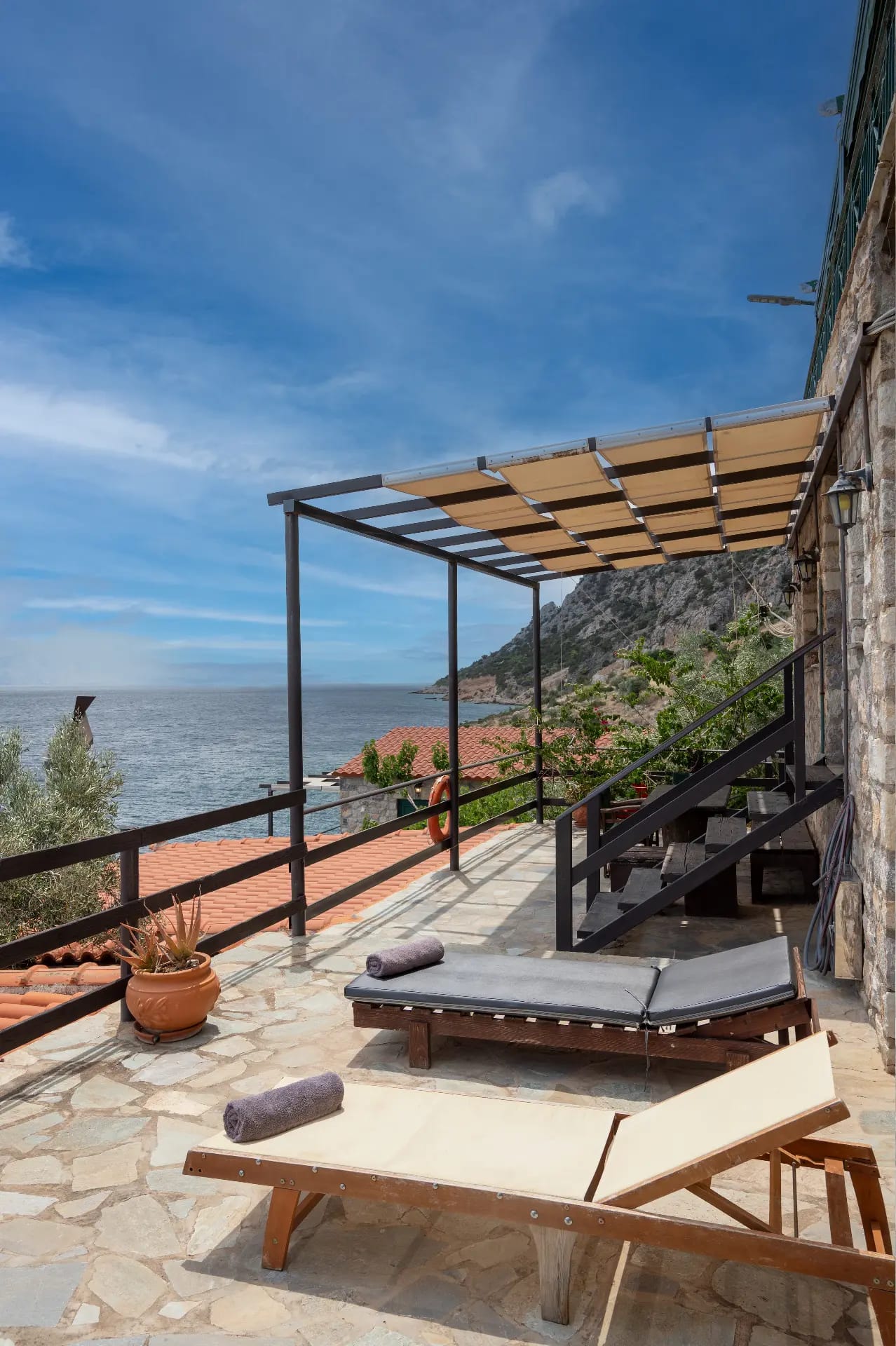It has a single space, with wooden furniture and a double metal bed. Enjoy the view and the sound of the sea from every corner of the room. Equipped kitchen in the open space, which includes a comfortable dining area. Big balcony in the endless blue horizon. The apartment has impressive stone walls with handmade wooden constructions as well as a luxurious bathroom with a shower.