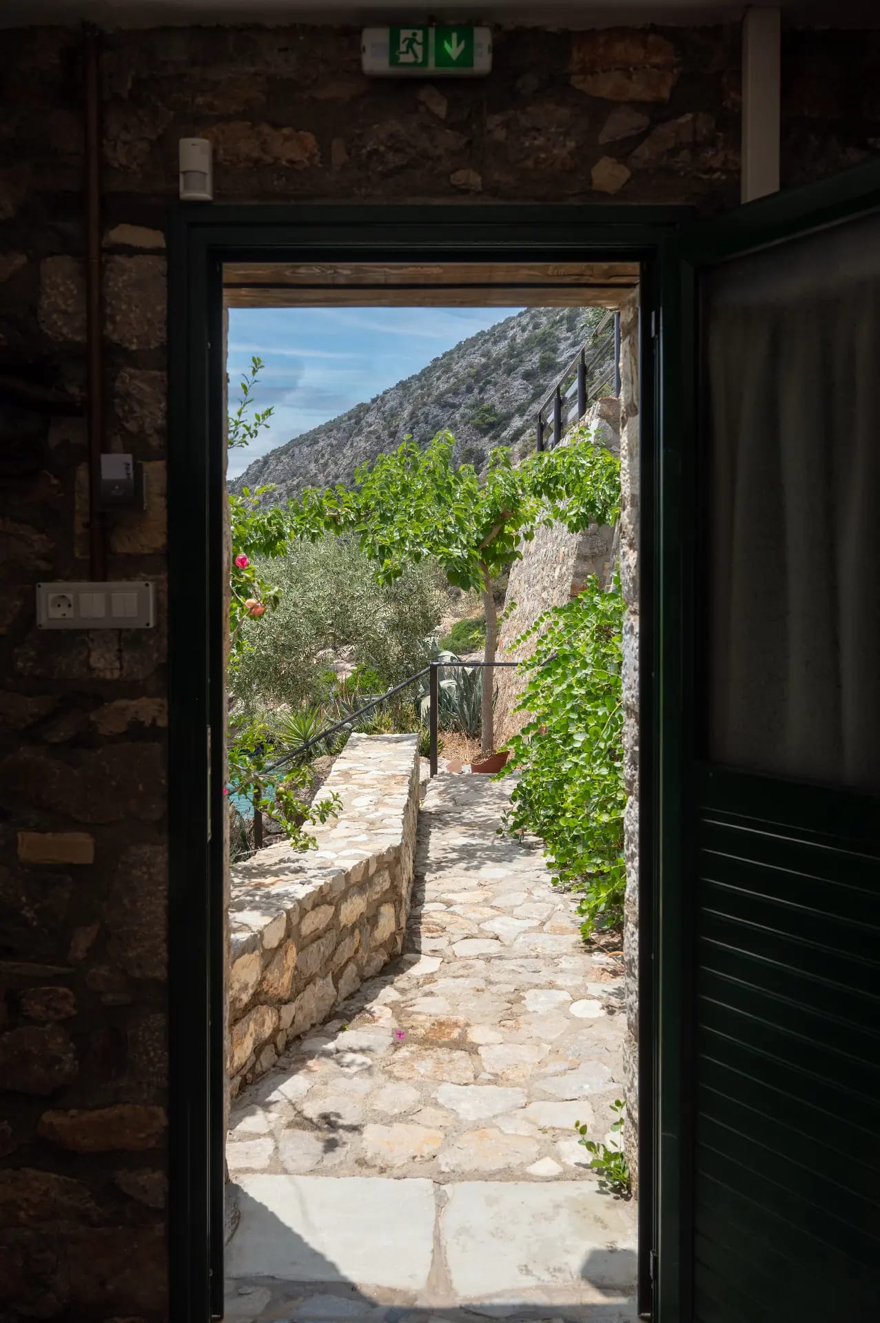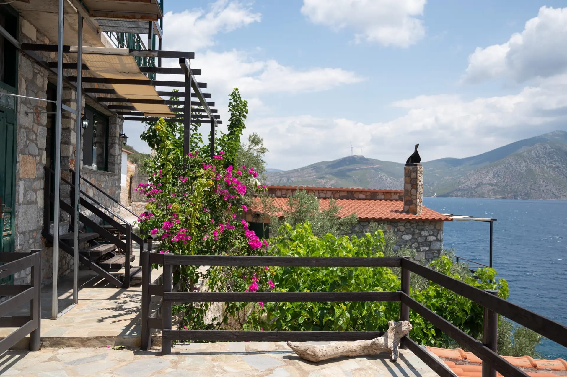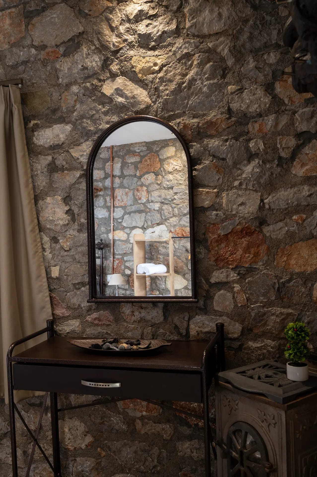It has a single space, with wooden furniture and a double metal bed. Enjoy the view and the sound of the sea from every corner of the room. Equipped kitchen in the open space, which includes a comfortable dining area. Big balcony in the endless blue horizon. The apartment has impressive stone walls with handmade wooden constructions as well as a luxurious bathroom with a shower.