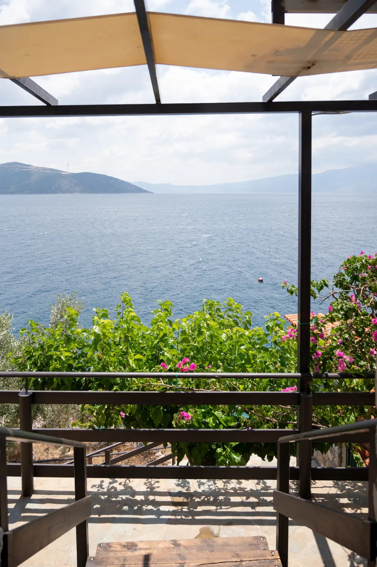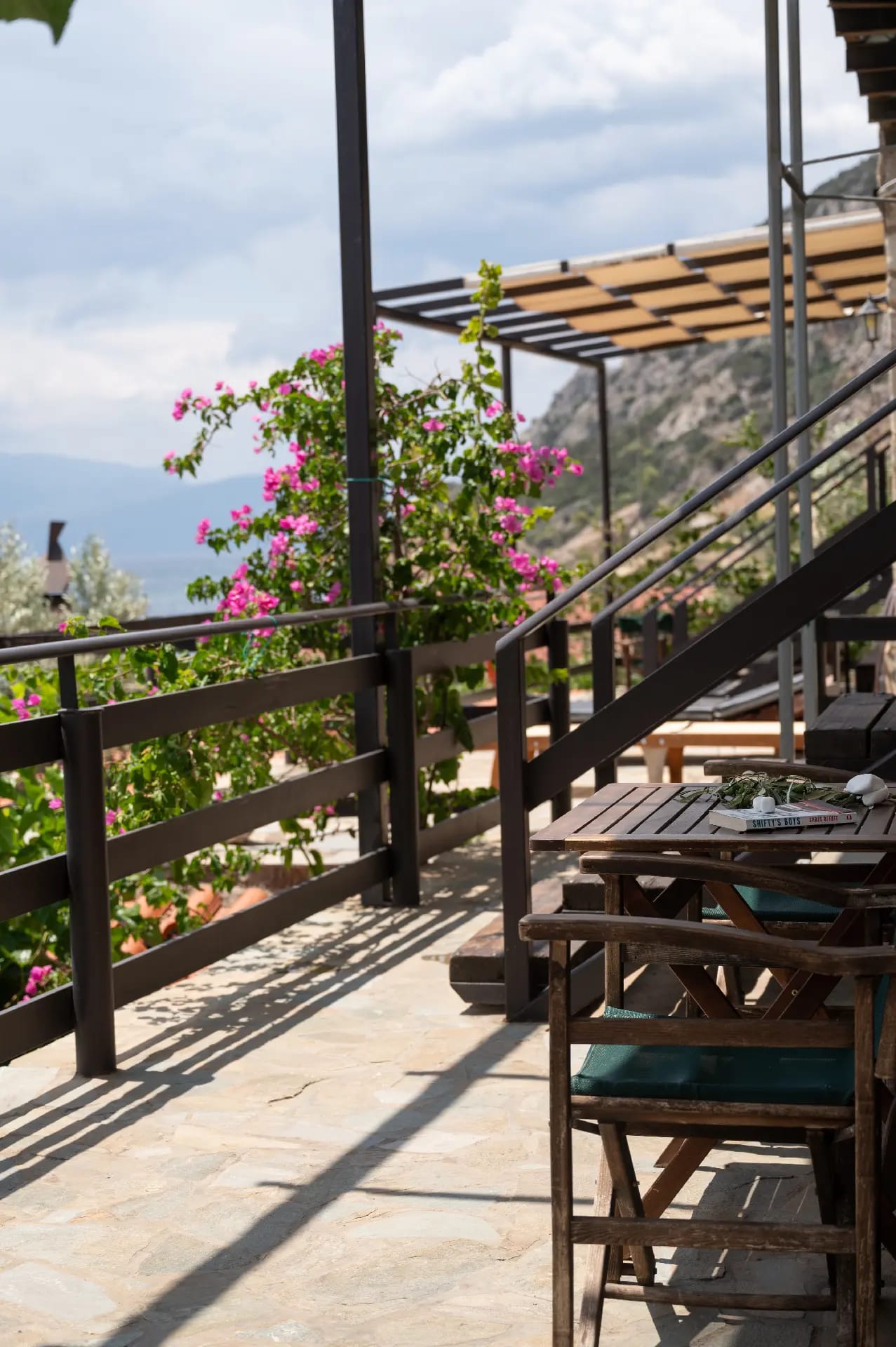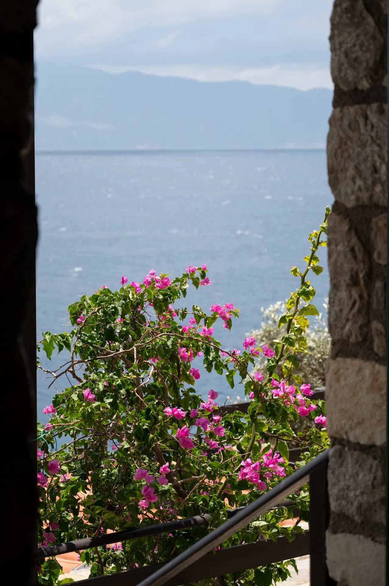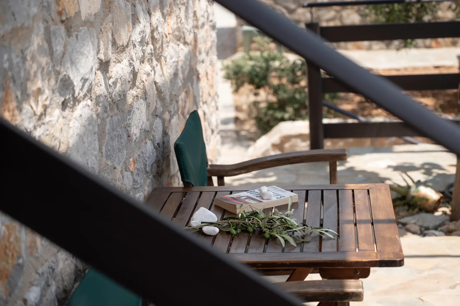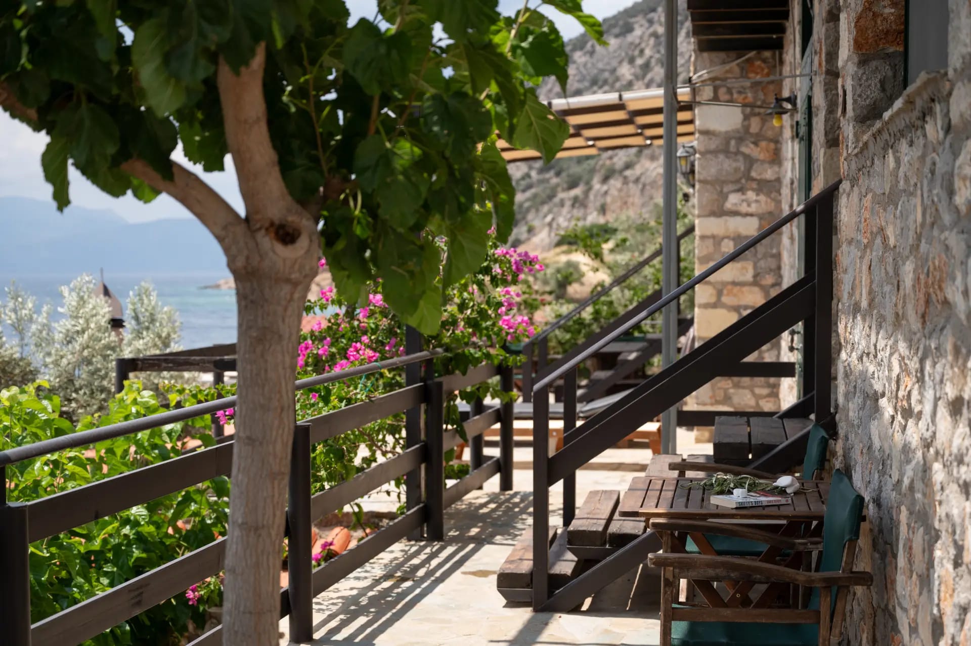 It has a single space, with wooden furniture and a double bed. Enjoy the view and the sound of the sea from every corner of the room. Equipped kitchen in the open space, which includes a comfortable dining area. Big balcony in the endless blue horizon under a tree. The apartment has impressive stone walls with handmade wooden constructions as well as a bathroom with a shower.