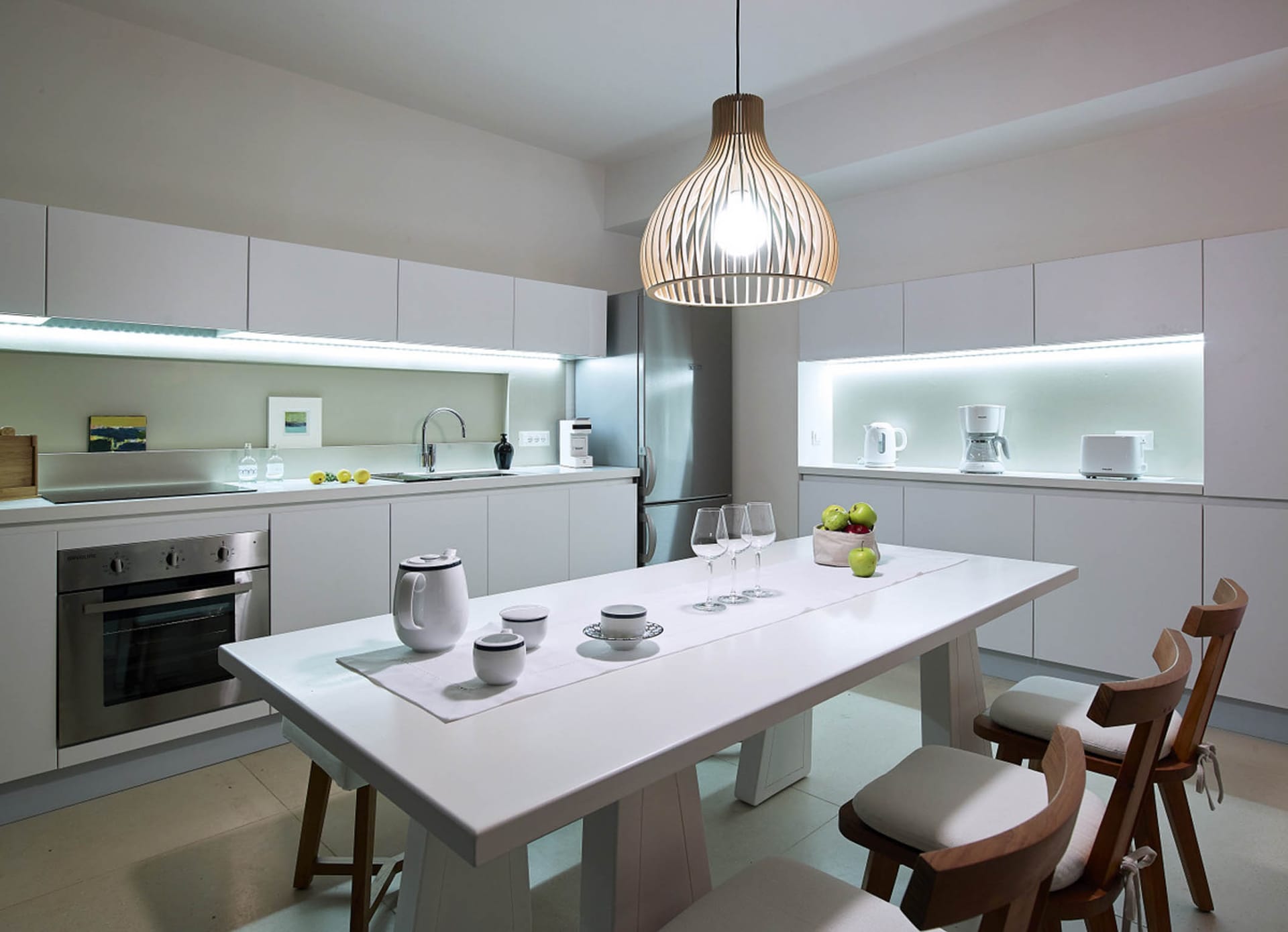 The open-plan layout on the ground floor seamlessly connects the indoor and outdoor areas, creating a bright and airy atmosphere. The fully equipped kitchen, fitted with state-of-the-art appliances, invites guests to indulge in the pleasure of holiday cooking. Adjacent to it, the elegant dining area and cozy living room with a 42’’ satellite LED TV offer the perfect space to relax. Floor-to-ceiling windows allow natural light to flood the interiors while providing uninterrupted views of the surrounding landscape.