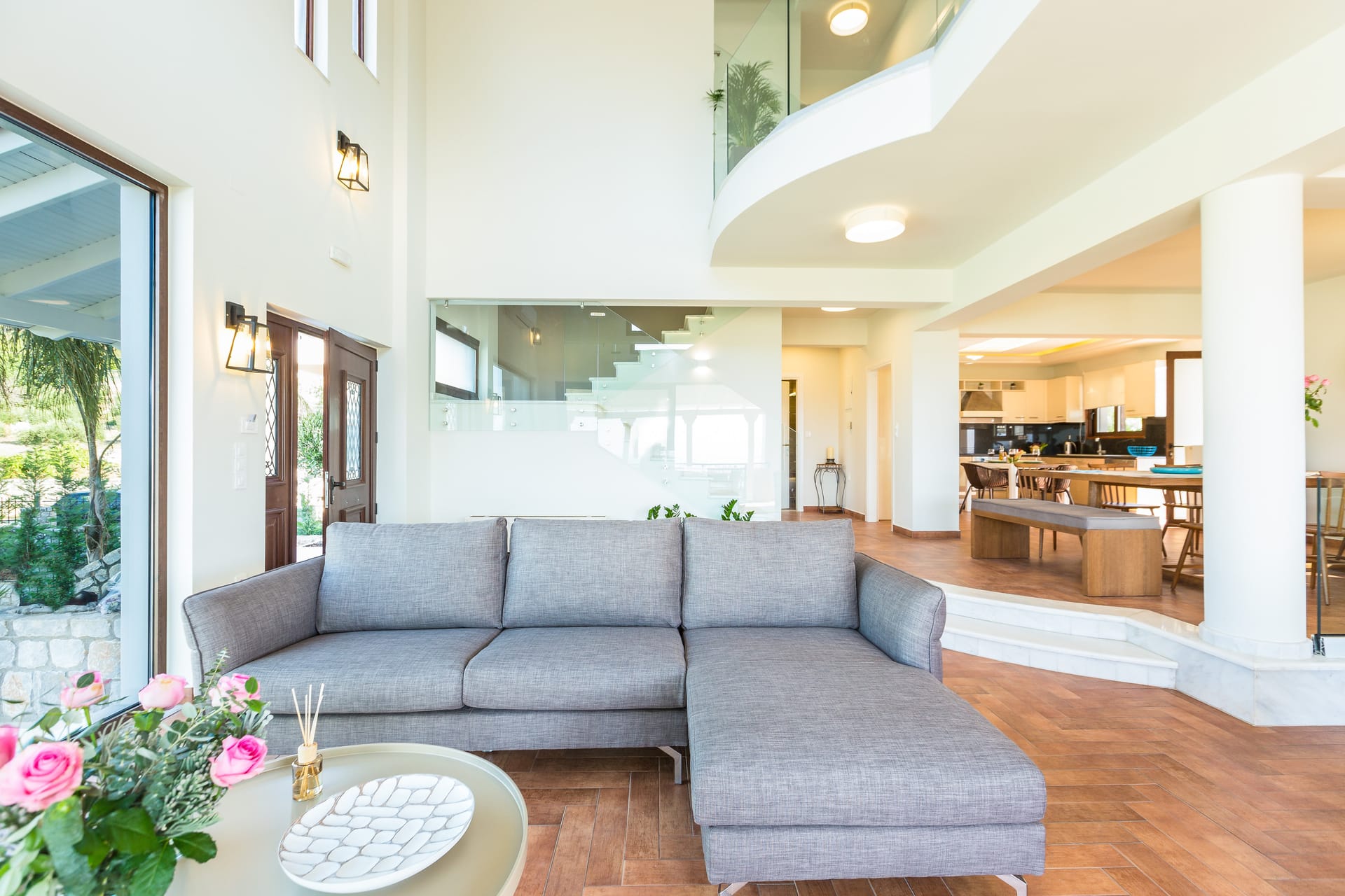Villa Alessandra comfortably sleeps up to 11 guests across five airy bedrooms. The main entrance is on the ground floor, which consists of a fully equipped kitchen with electrical appliances, a dining area, and two living rooms with satellite smart screen TV. On the same floor, there is a bedroom with a double-size bed and a communal bathroom which is suitable for all the guests. A staircase leads you to the first floor with three airy bedrooms, two bedrooms with double-size beds and satellite smart screen TV, and a bedroom also with a smart screen TV with a twin-size bed. Two of them share a bathroom while the other one has an ensuite bathroom. The master bedroom with the king-size bed, in the attic, has an ensuite bathroom with a shower and an exercise machine Seaview & an elliptical cross-trainer.