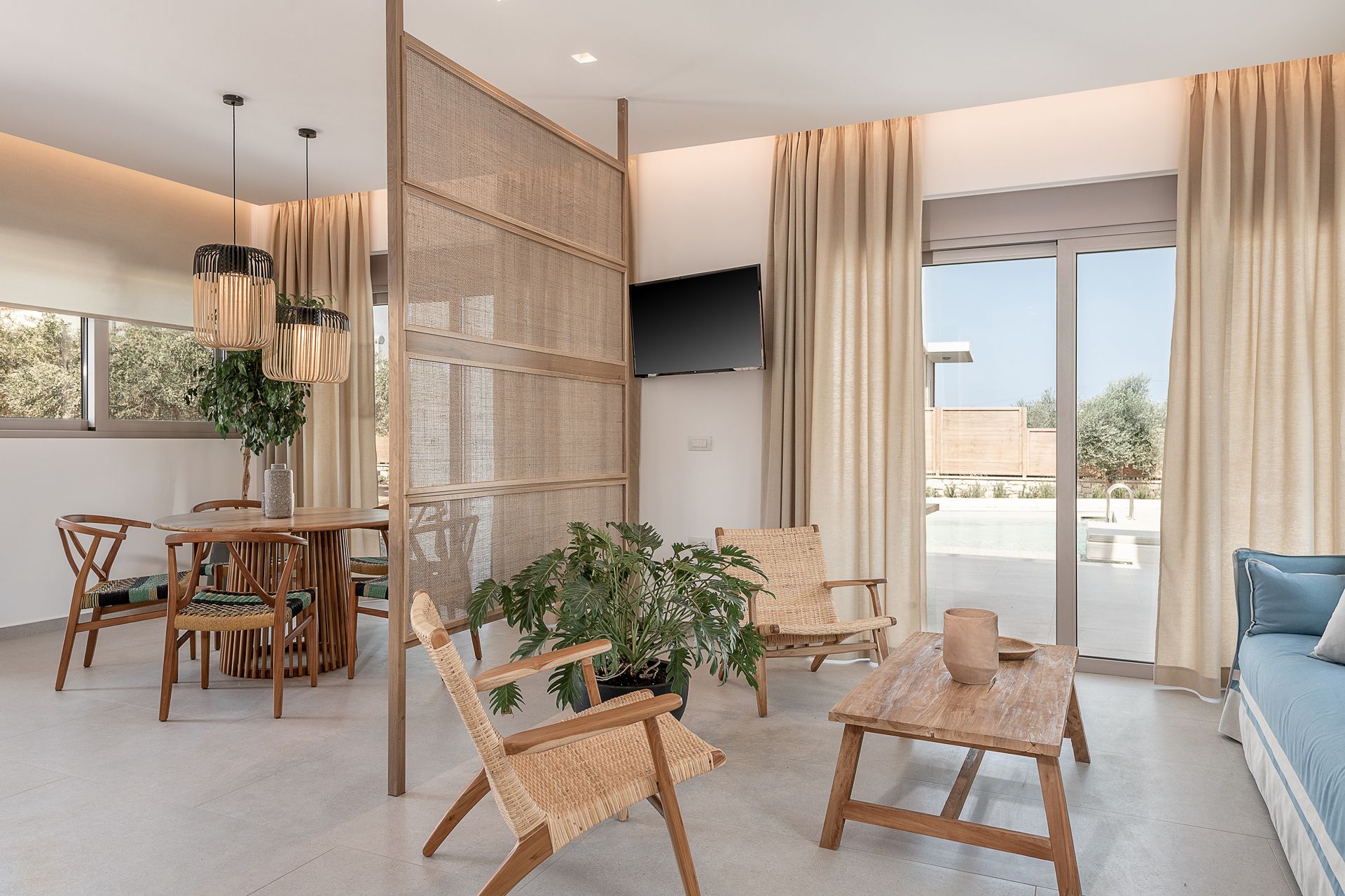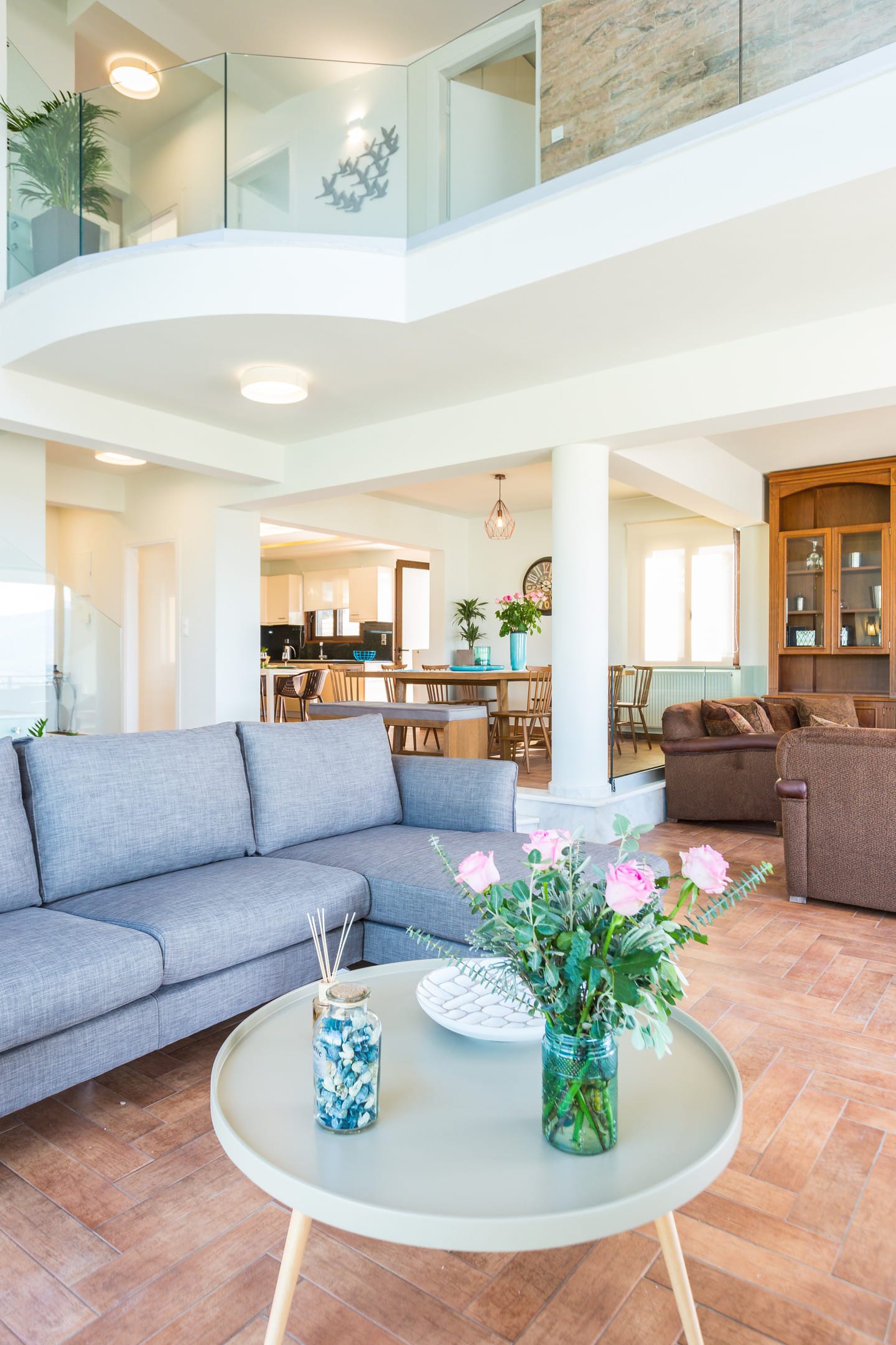 Two living areas with sofas, 60’’ TV, fireplace, balcony with sea view
