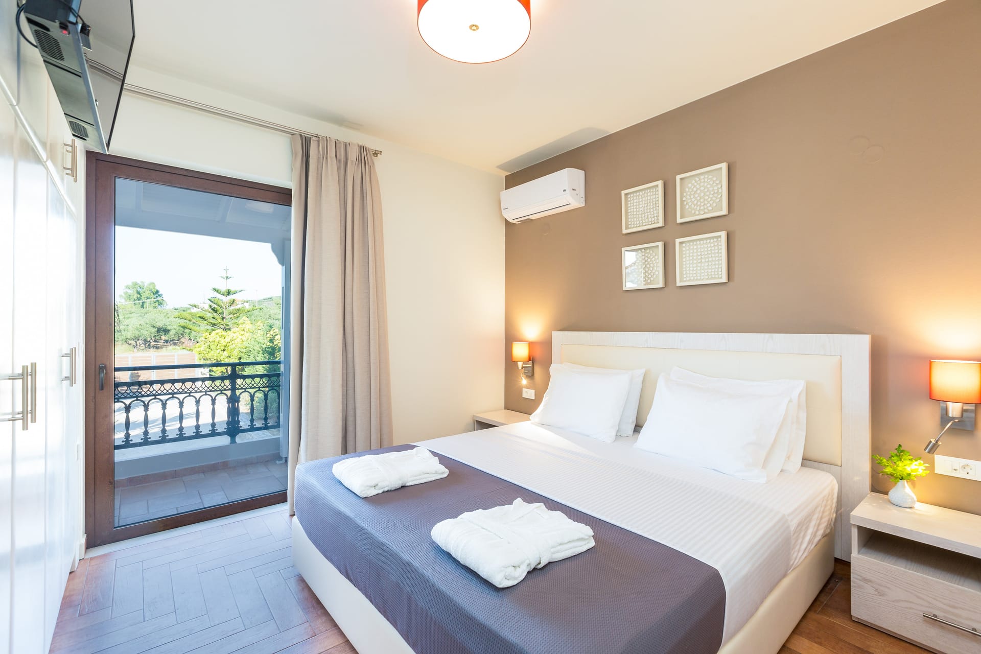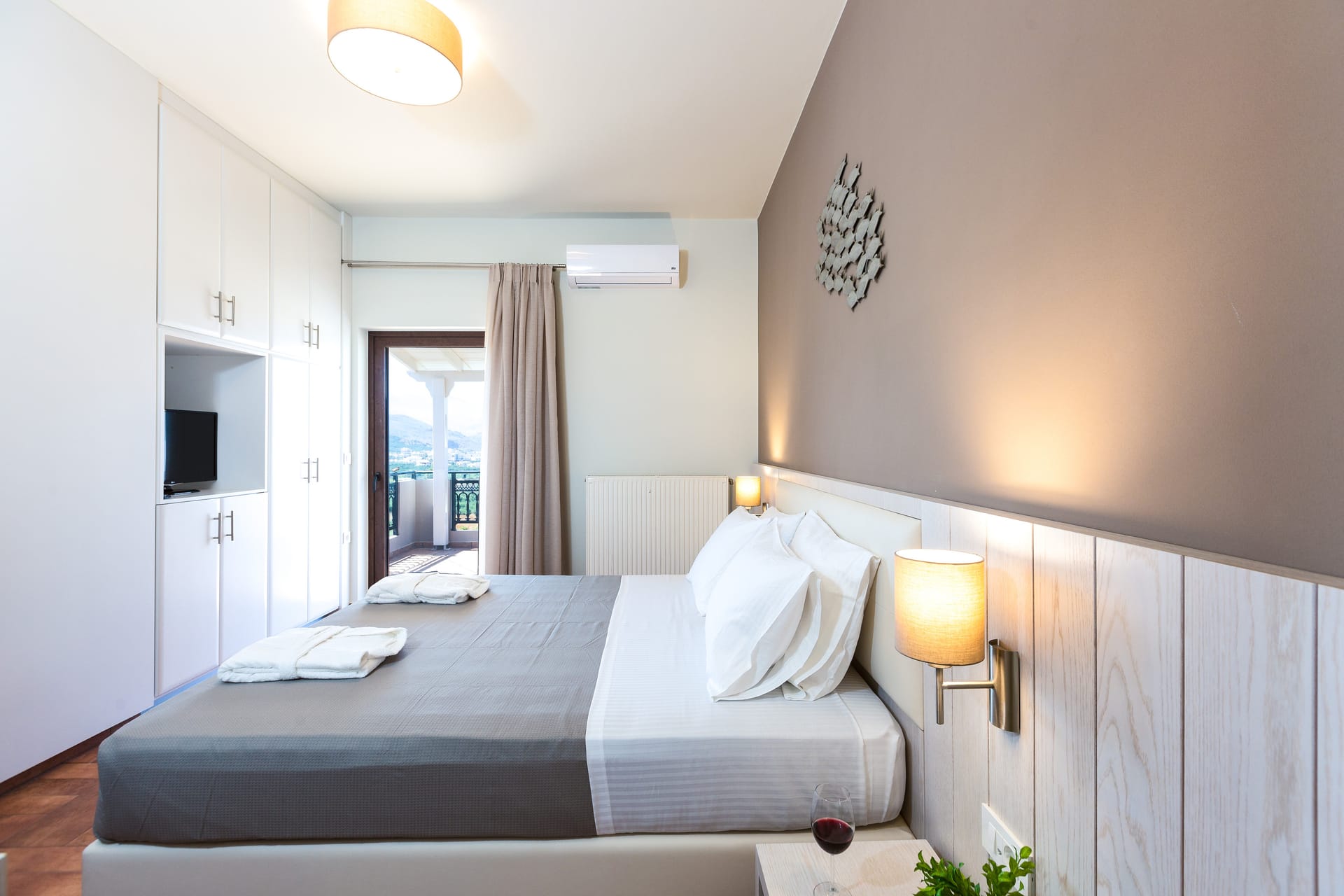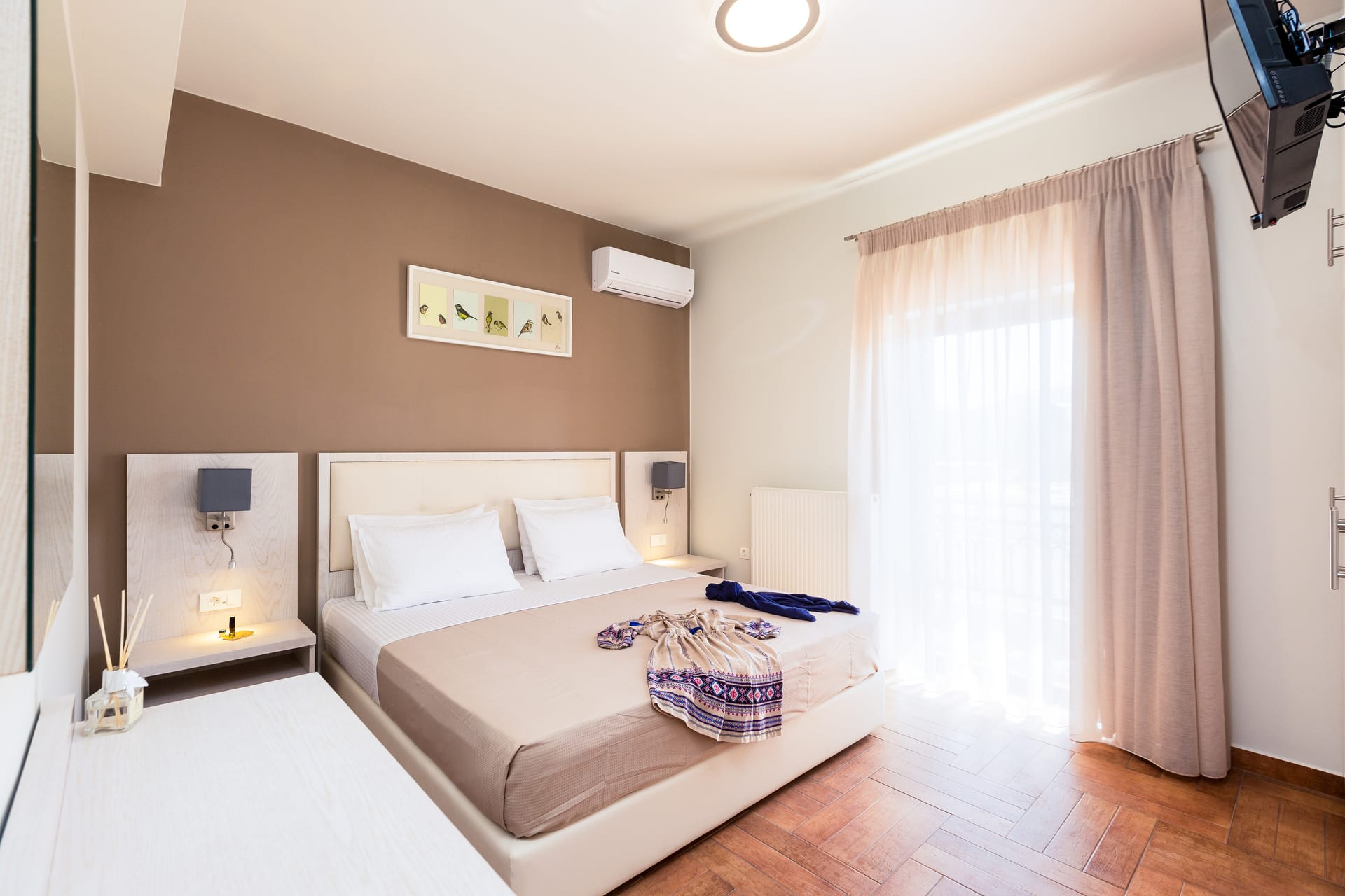 Bedroom 1: Double size bed (1.60x2.00), A/C, 32’’ Satellite TV, balcony