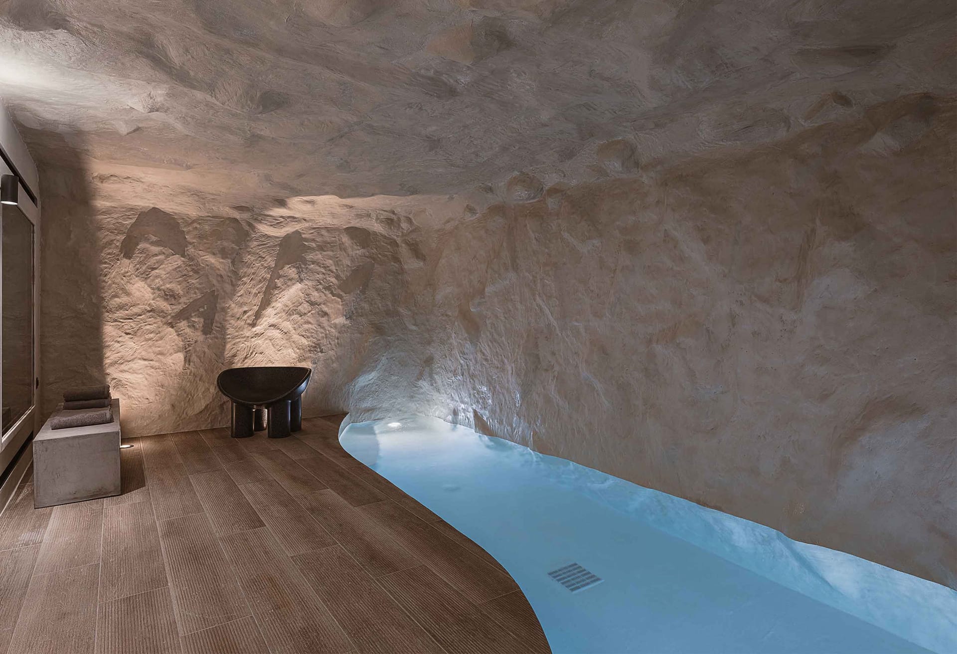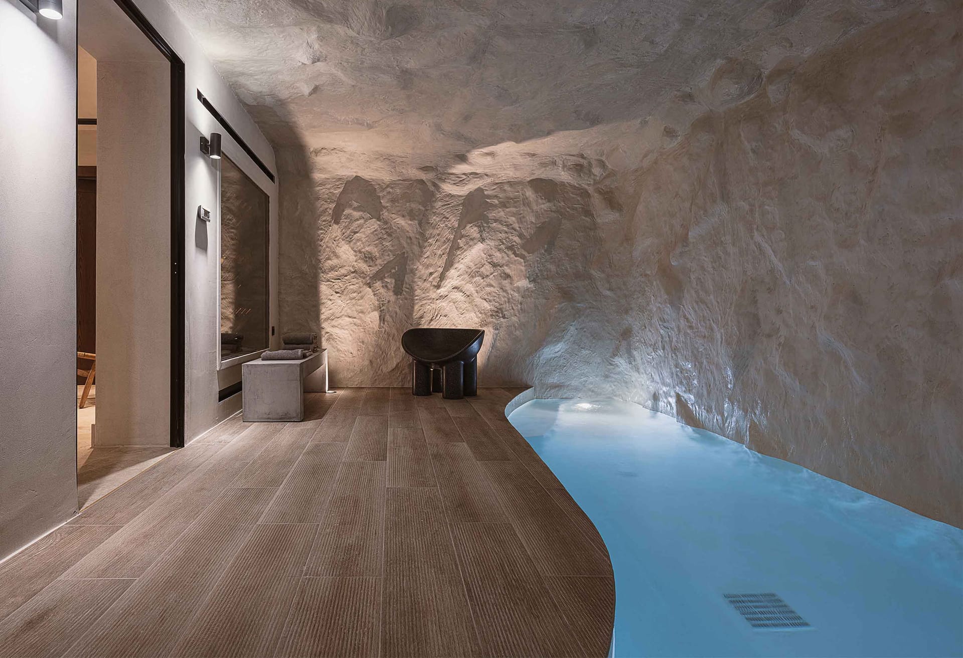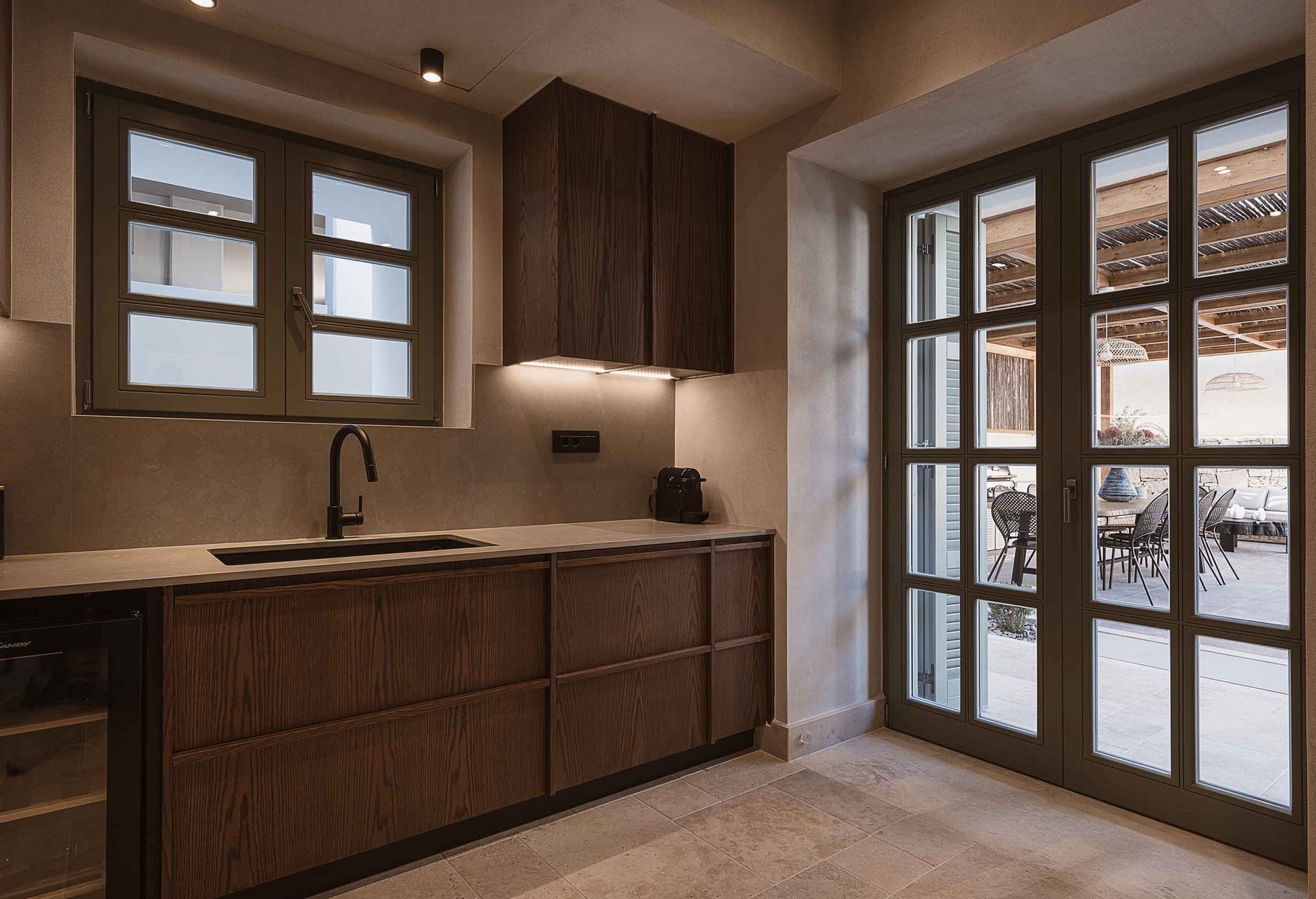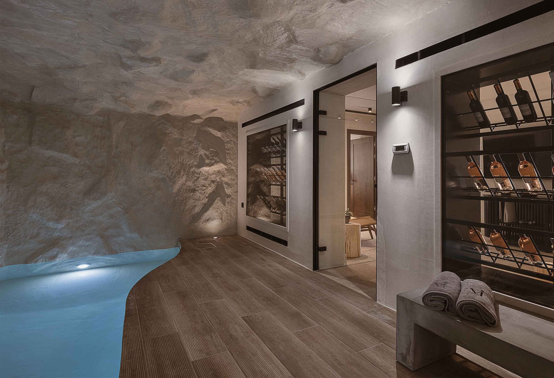 On the lower floor is located an indoor pool that offers the ultimate cosiness and next to the pool there is a stylish cellar with elegant details full of bottles of wine for the connoisseurs who like to enjoy their bottles chilled to the perfect temperature. Next, the dining area is located in a second kitchen with all the necessary appliances and amenities where you can prepare your meal and choose a good glass of wine. Unforgettable moments and carefree days! In both kitchens, there is a wine cooler.