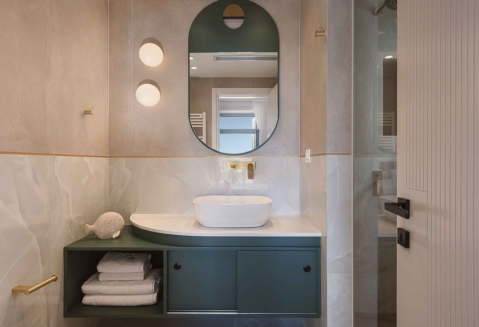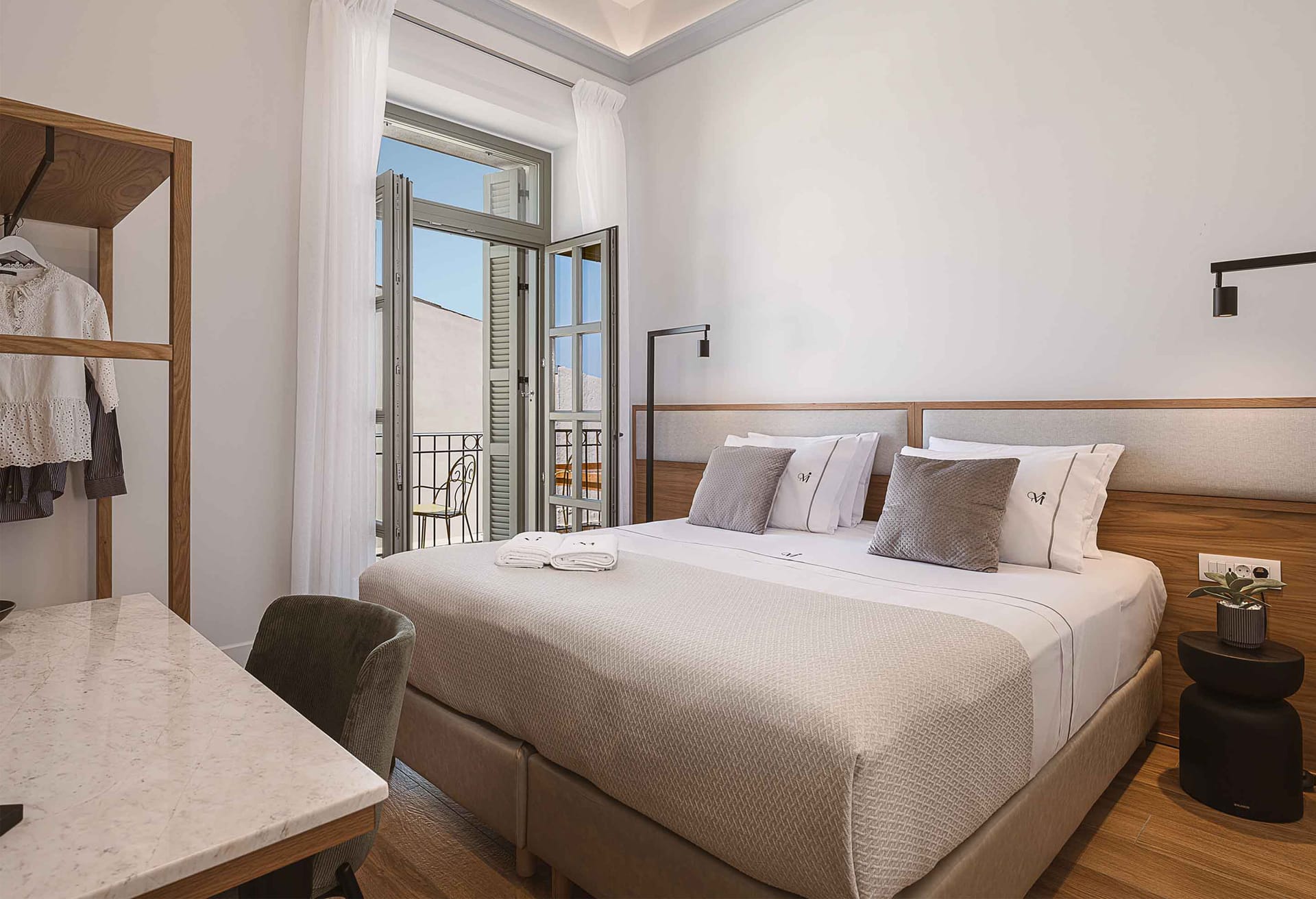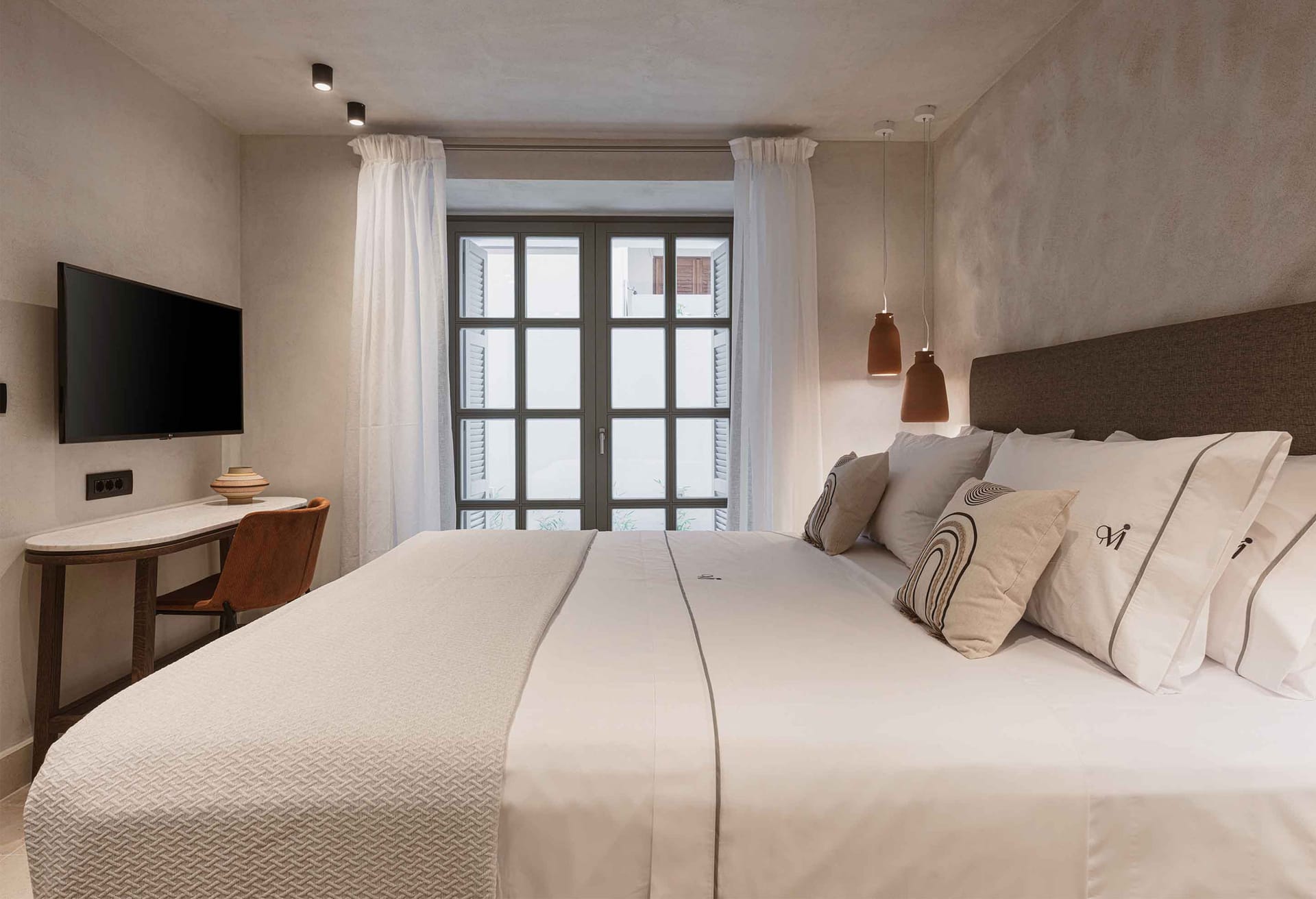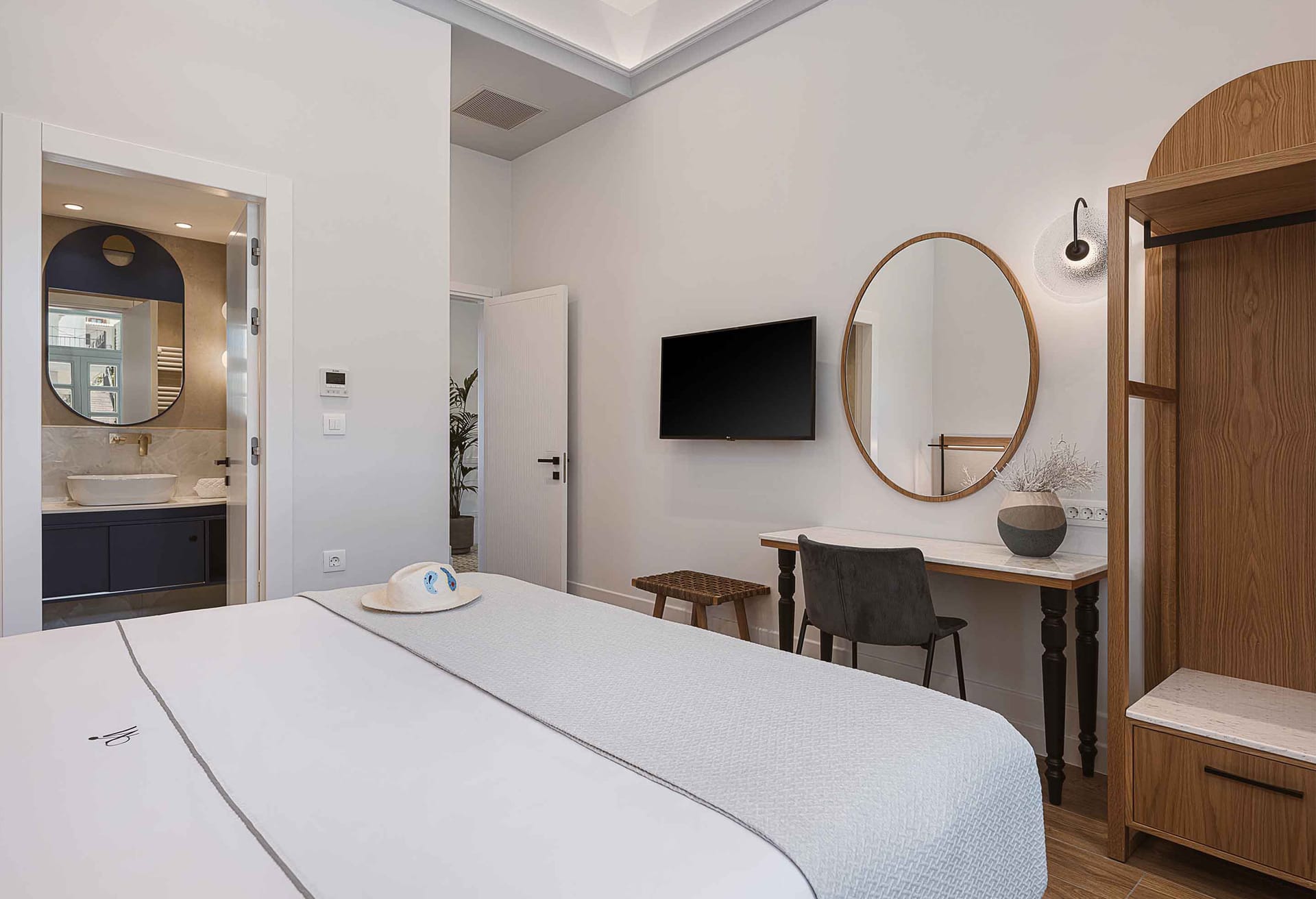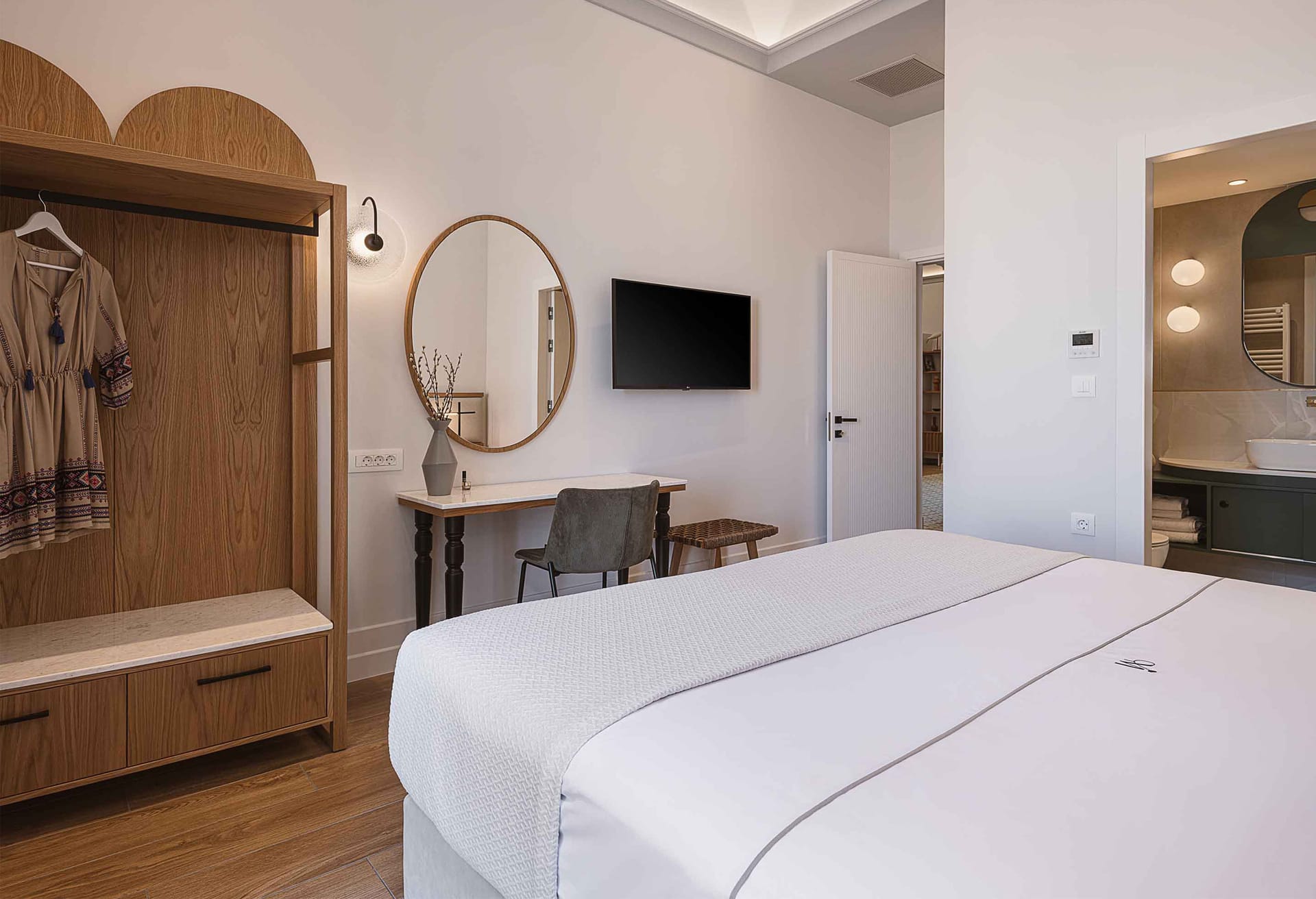 - Bedroom 1: King-size bed (1.80*2.00), A/C, Smart Satellite TV, access to the outdoor terrace, ensuite bathroom with shower