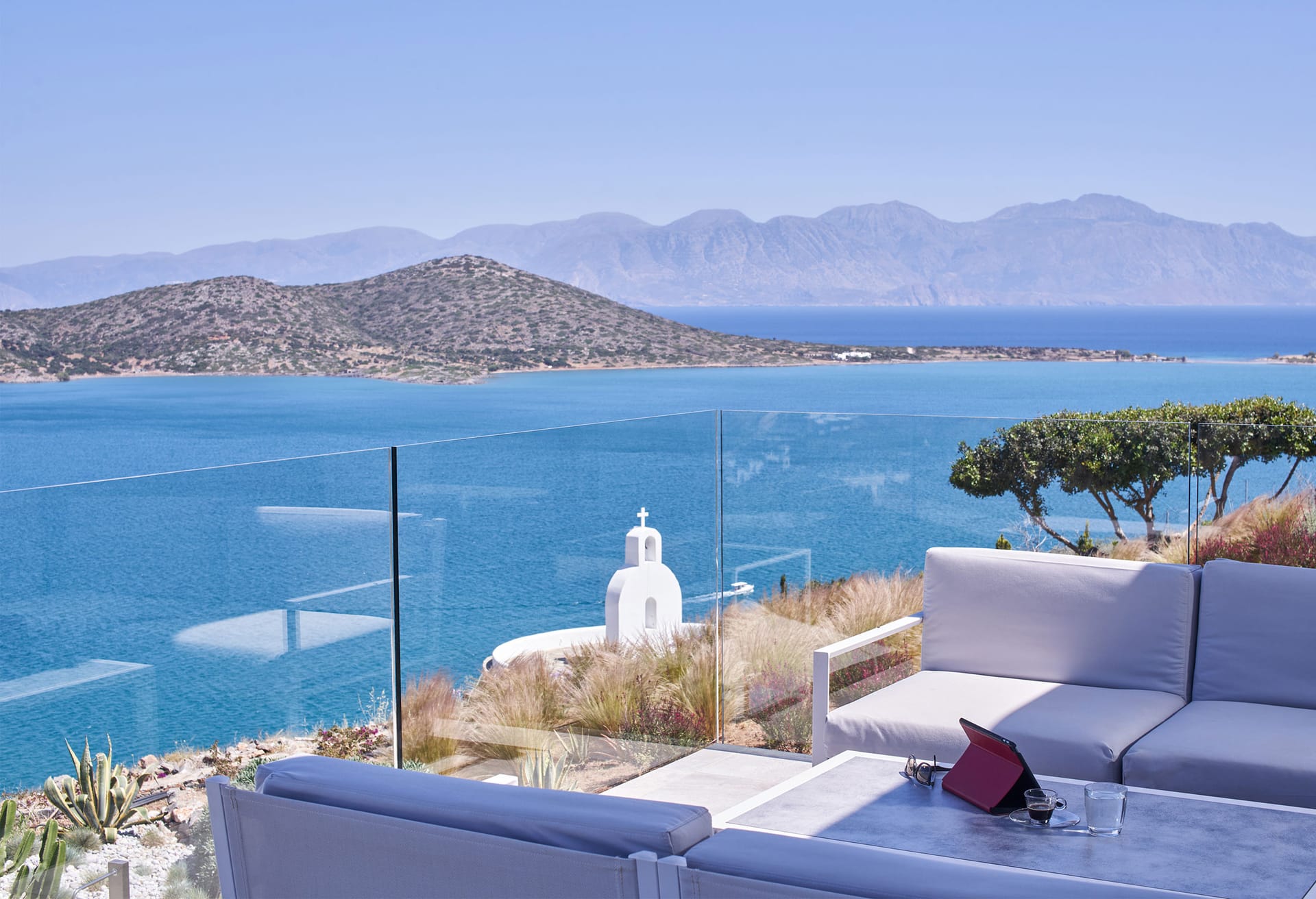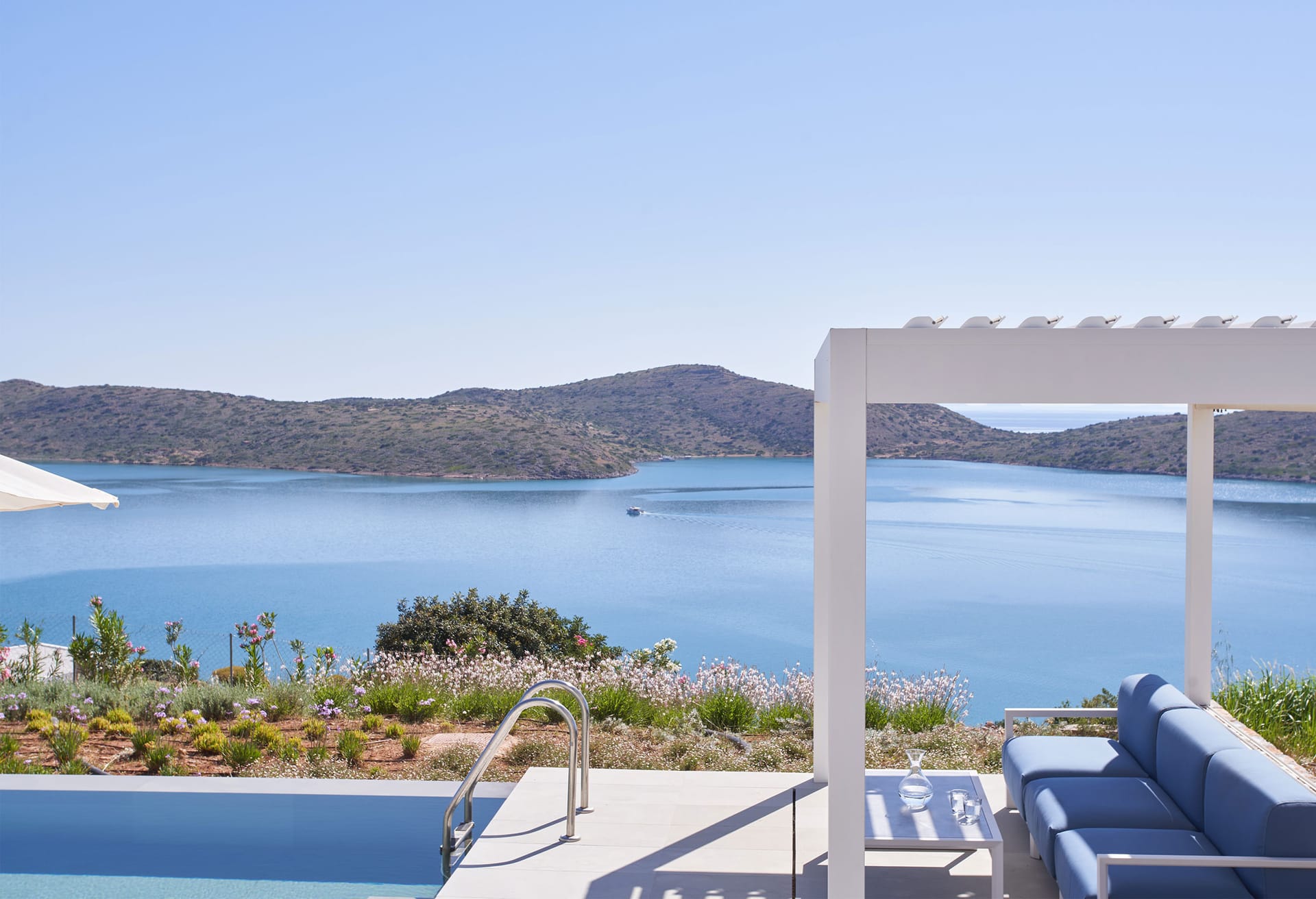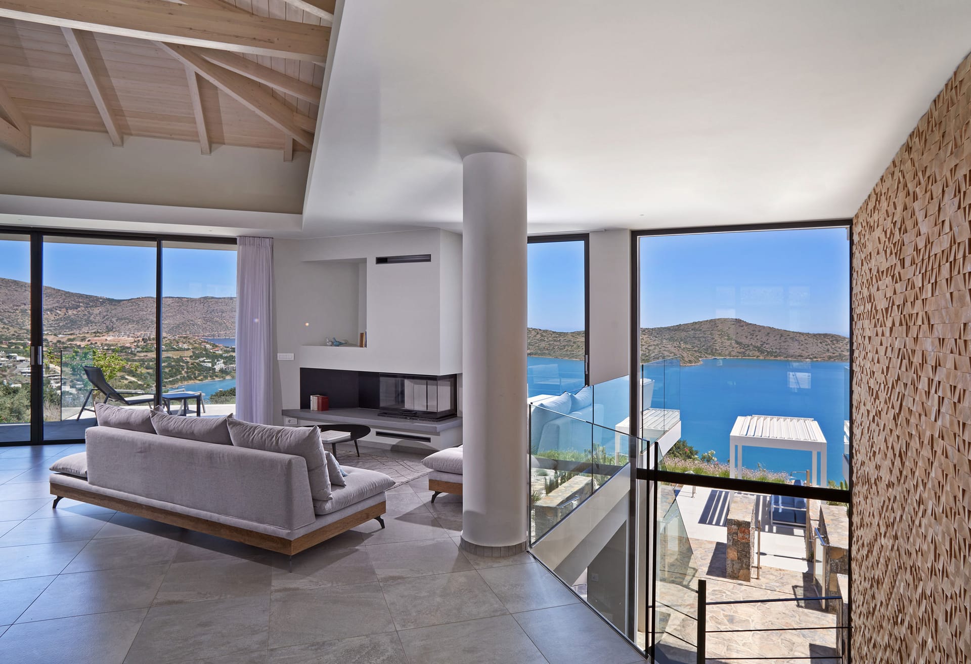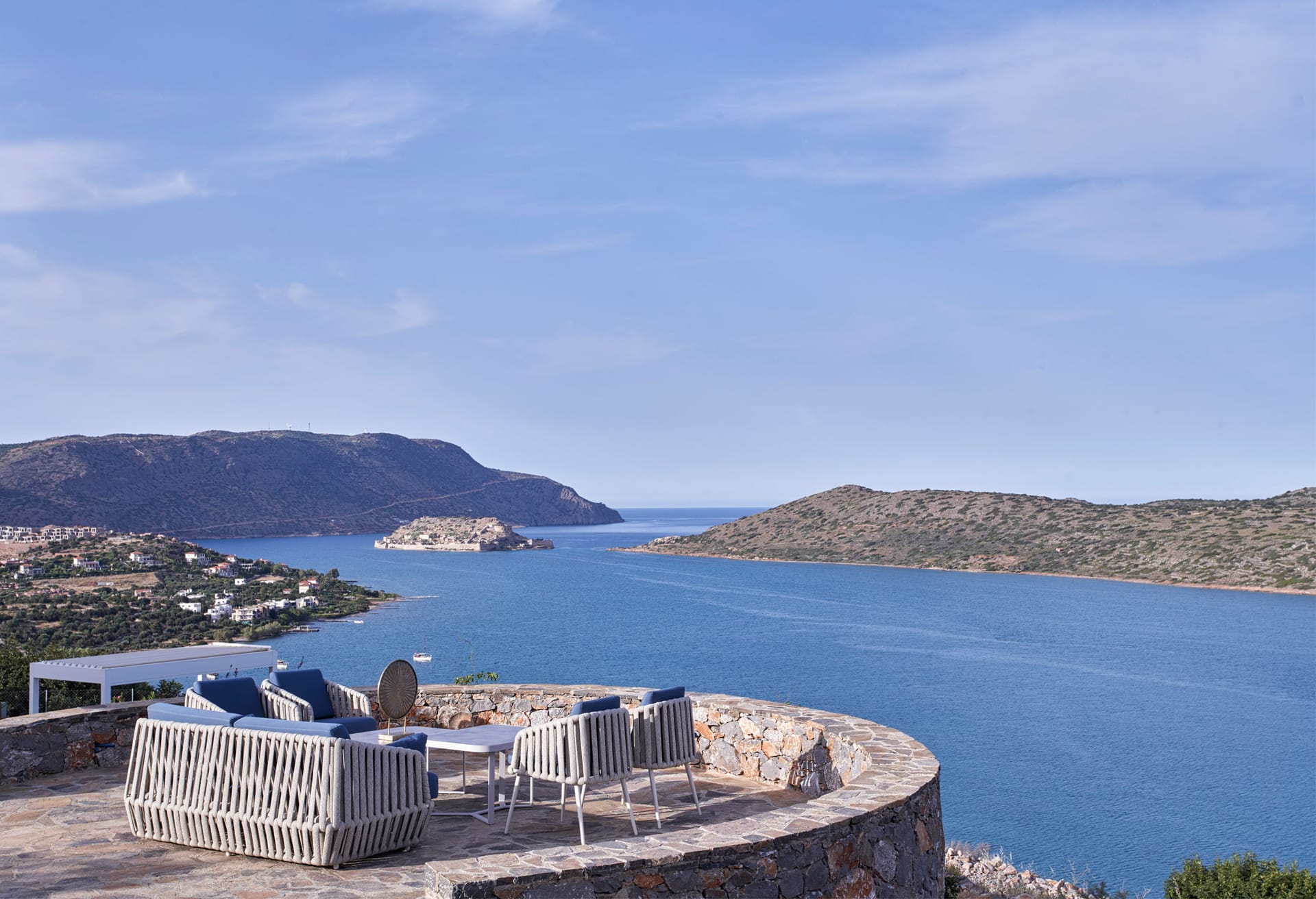 Step into this refined six-bedroom villa seamlessly integrated into the Cretan landscape, and be mesmerized by the awe-inspiring vistas of Mirabello Bay, visible from your infinity private heated pool as well as through the expansive floor-to-ceiling glass windows both inside and outside the villa.