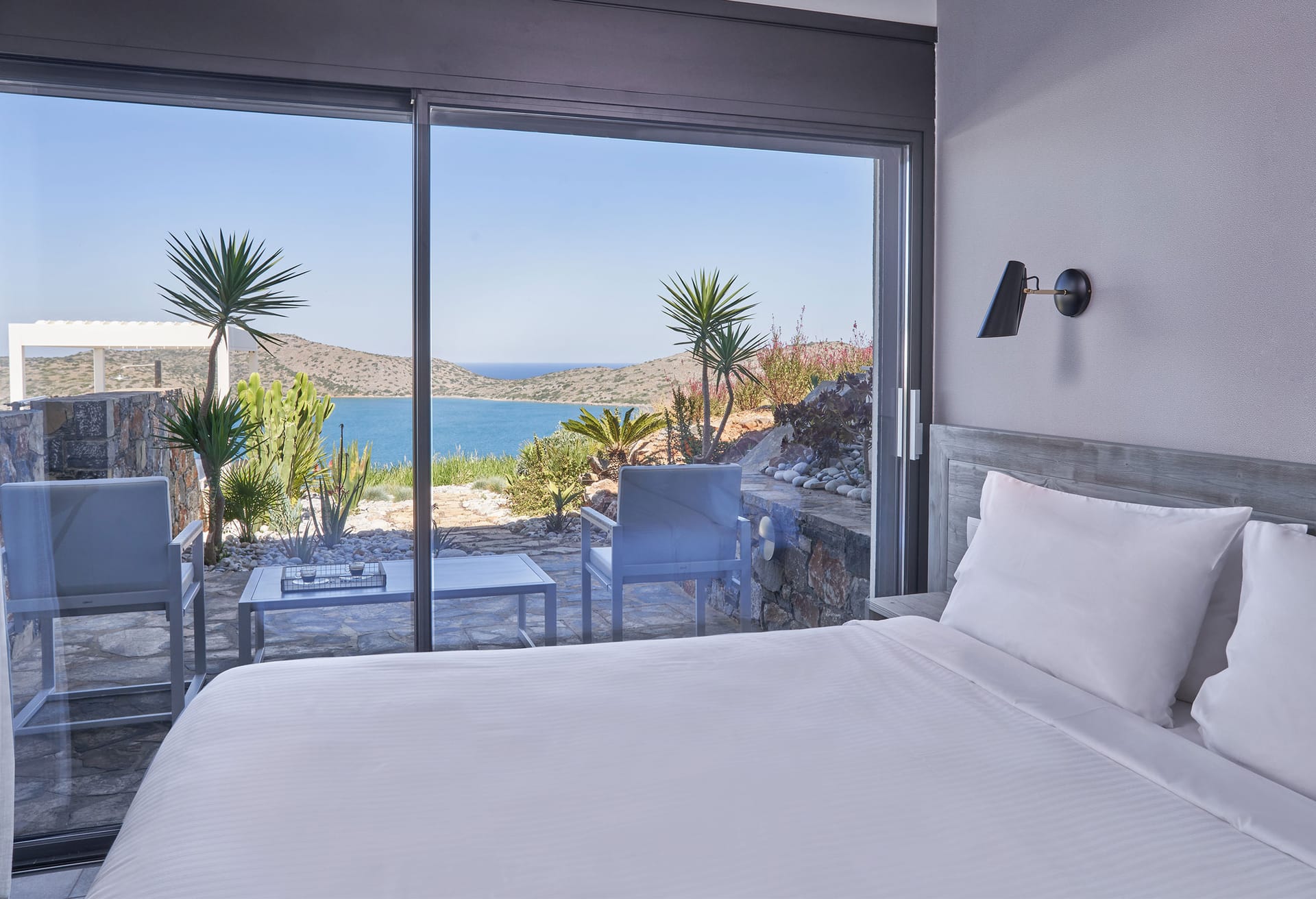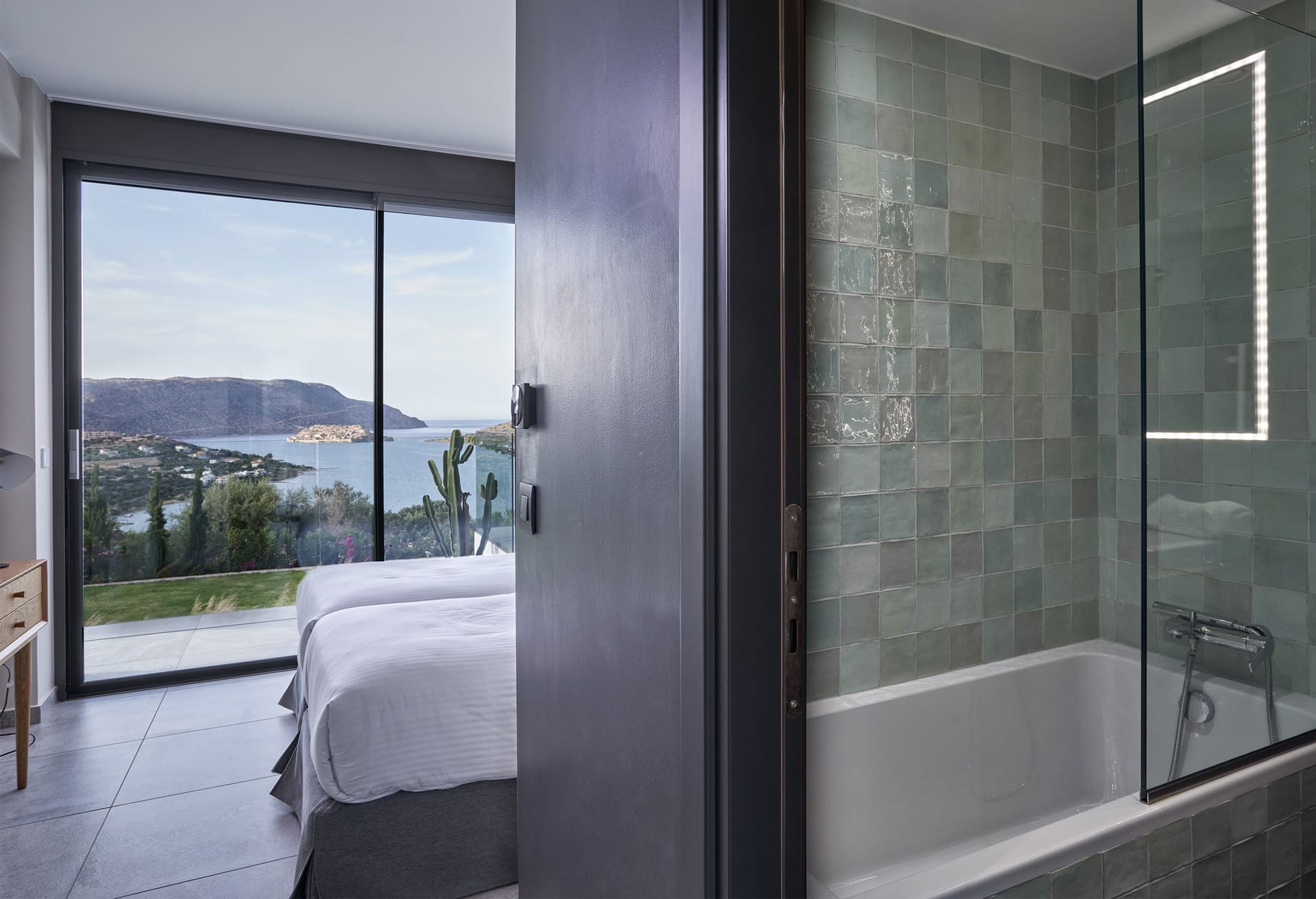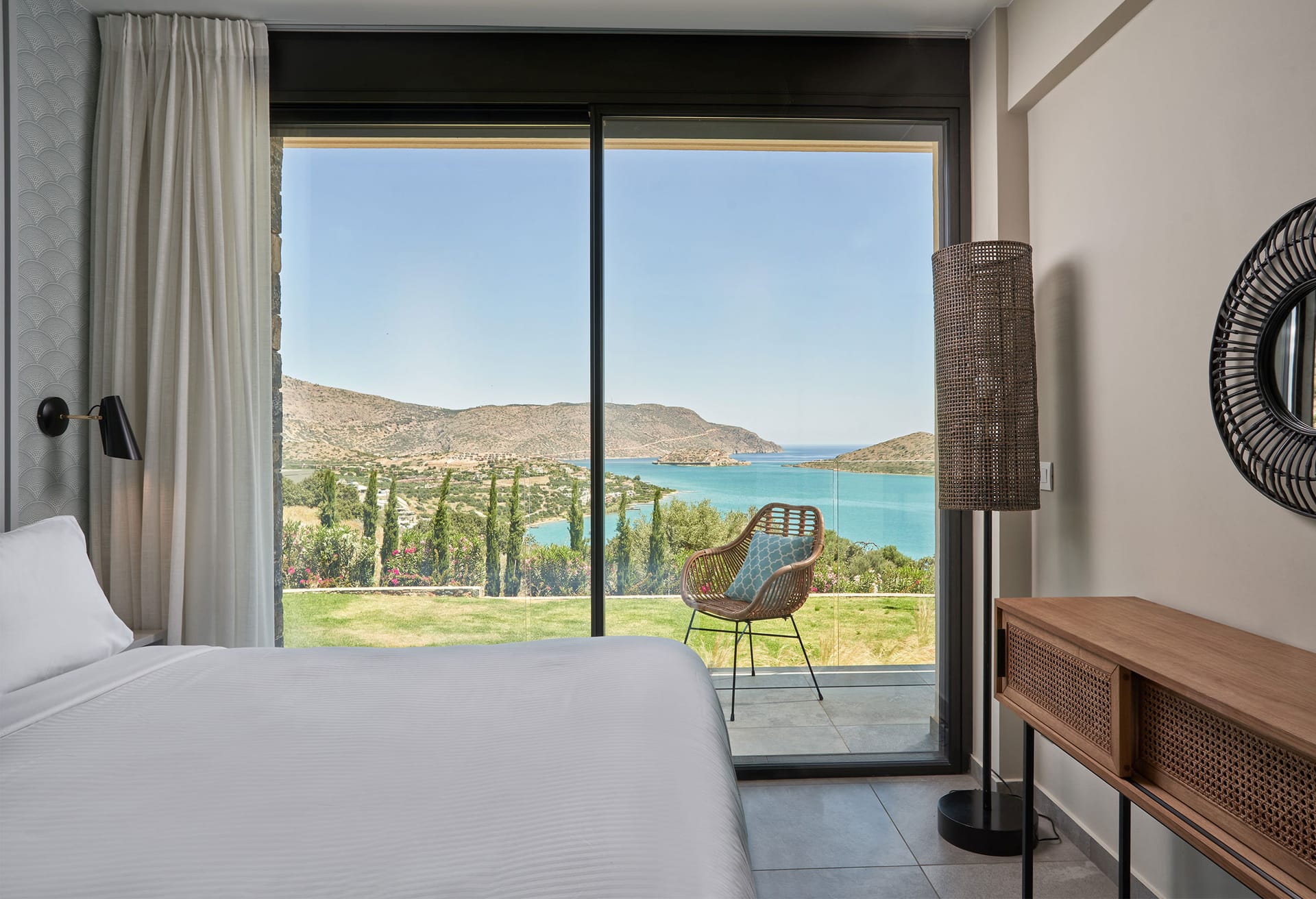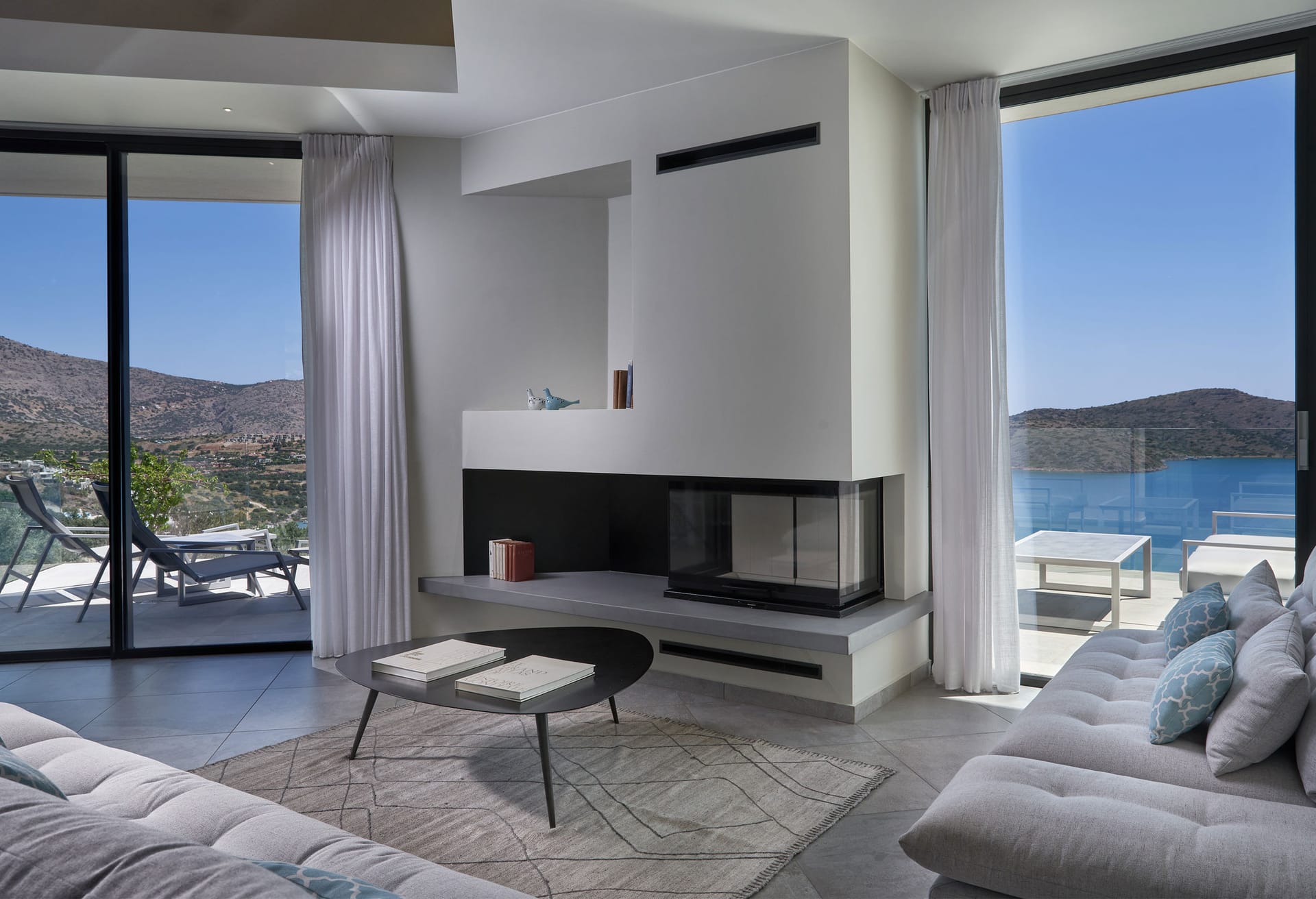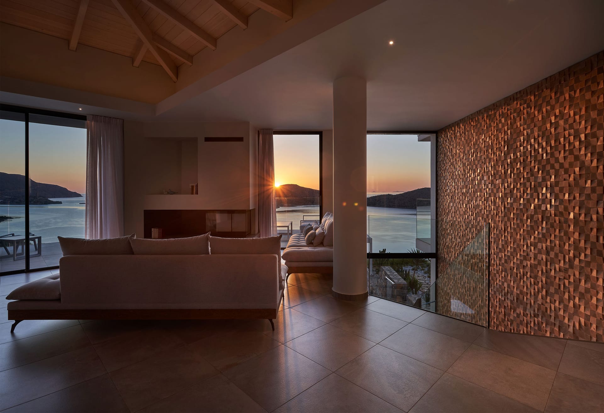 Step into this refined six-bedroom villa seamlessly integrated into the Cretan landscape, and be mesmerized by the awe-inspiring vistas of Mirabello Bay, visible from your infinity private heated pool as well as through the expansive floor-to-ceiling glass windows both inside and outside the villa.