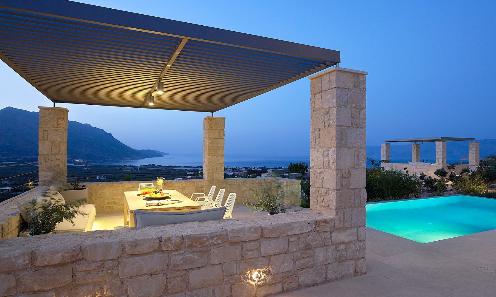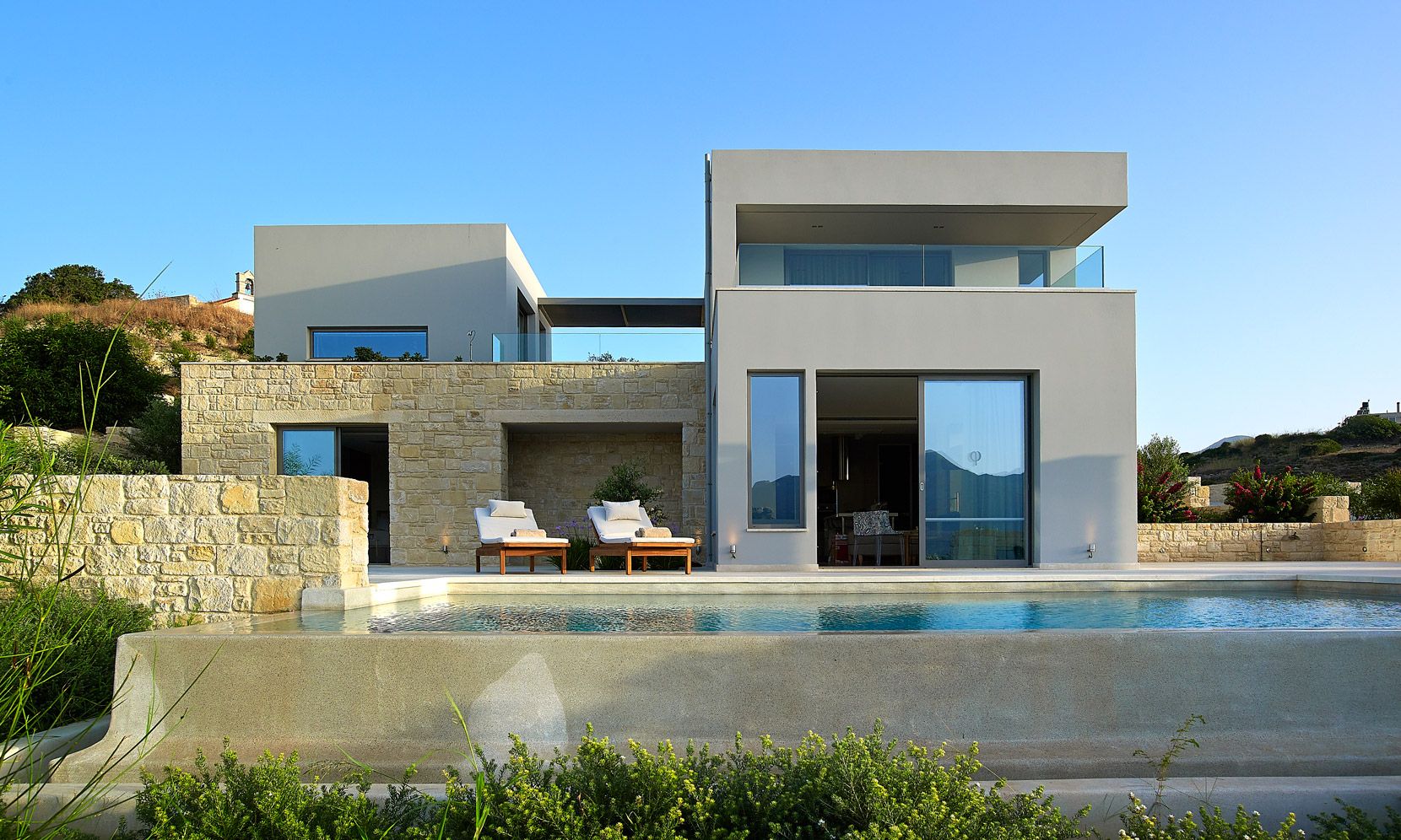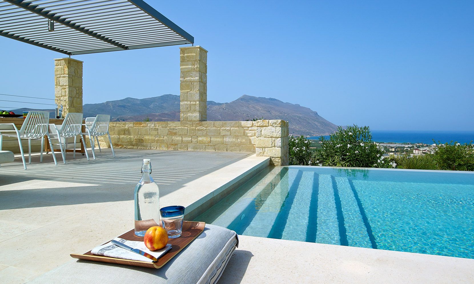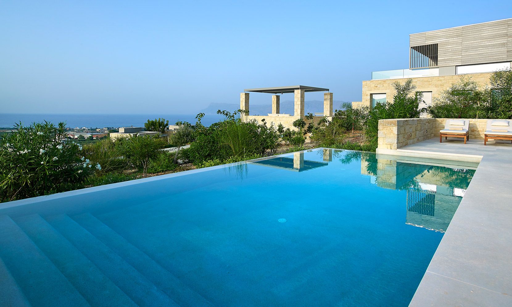 With a natural stone terrace which fronts of the property, the villa enjoys a private infinity pool plastered with a characteristic Cimentogonia surface and full-width Roman steps.