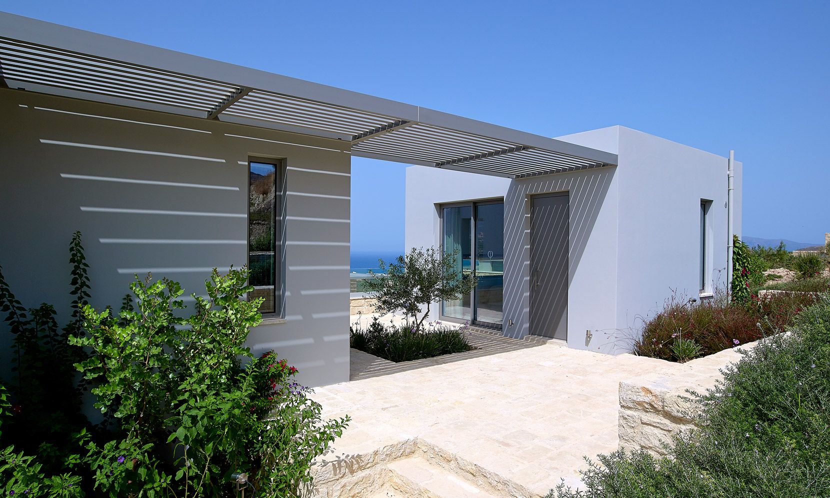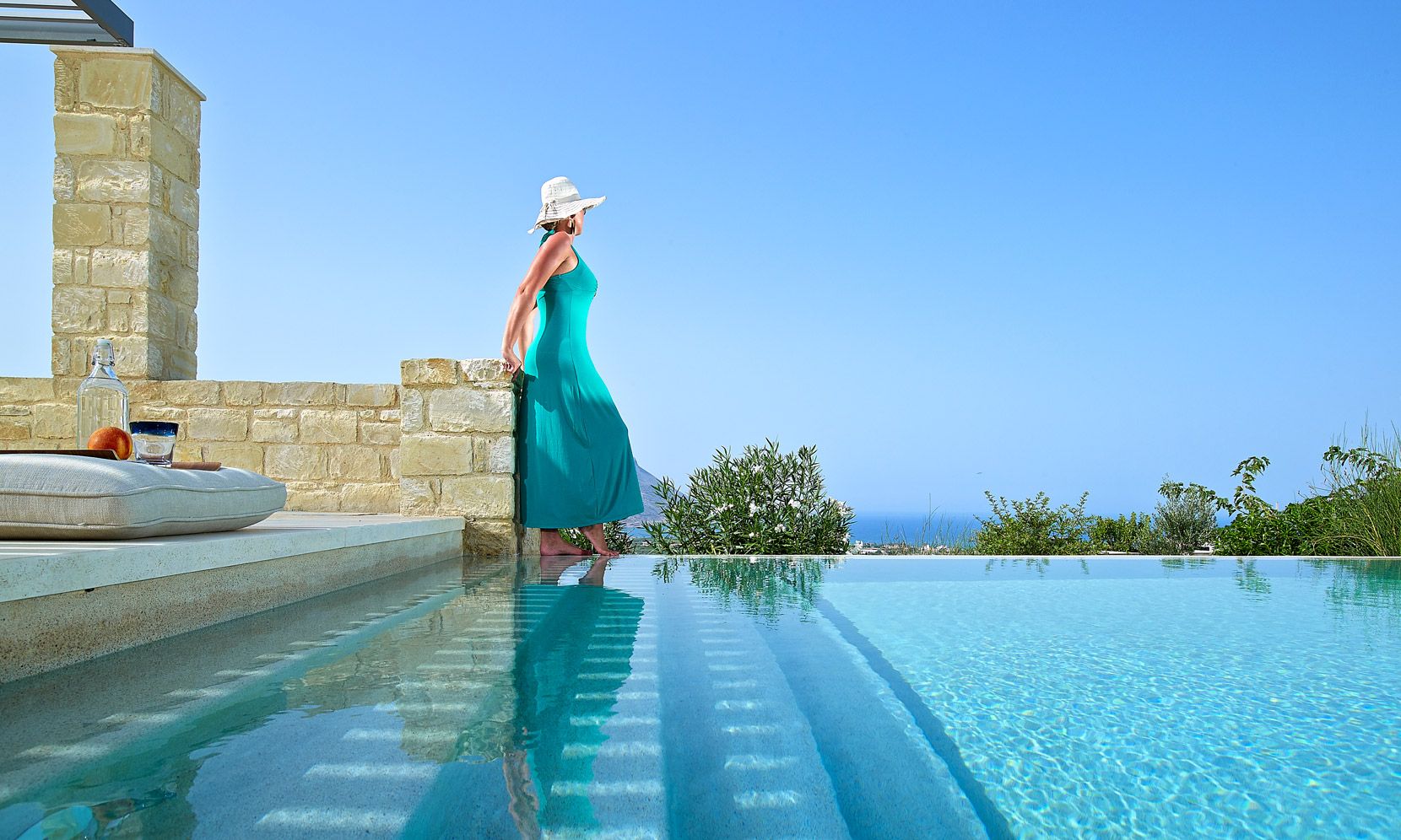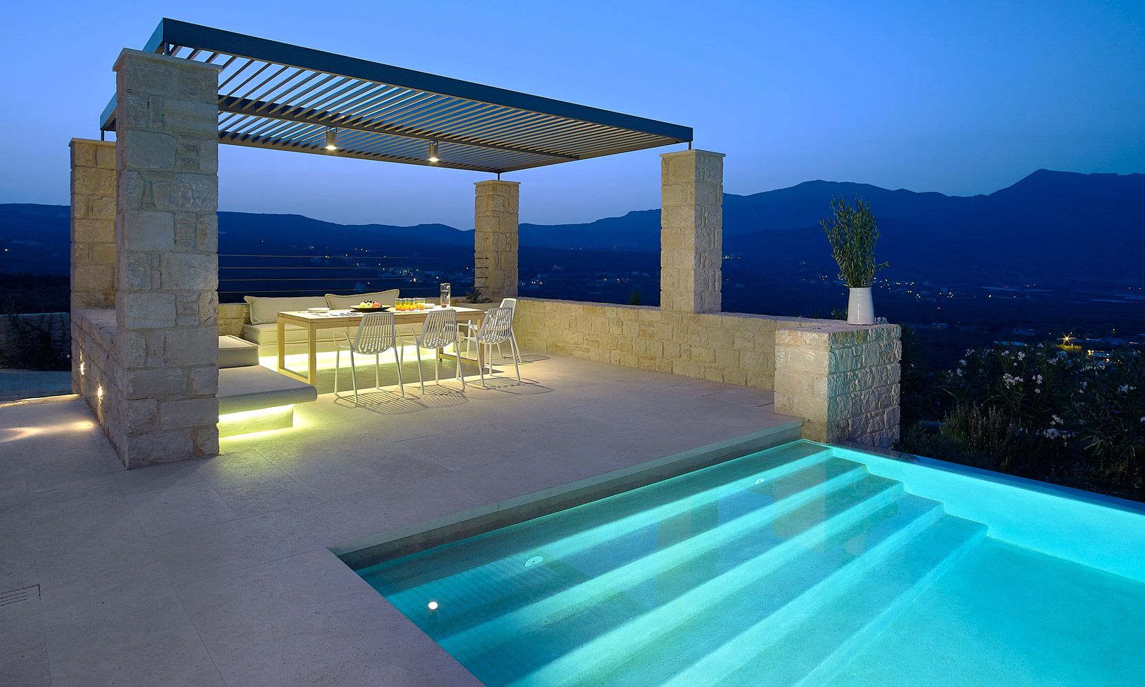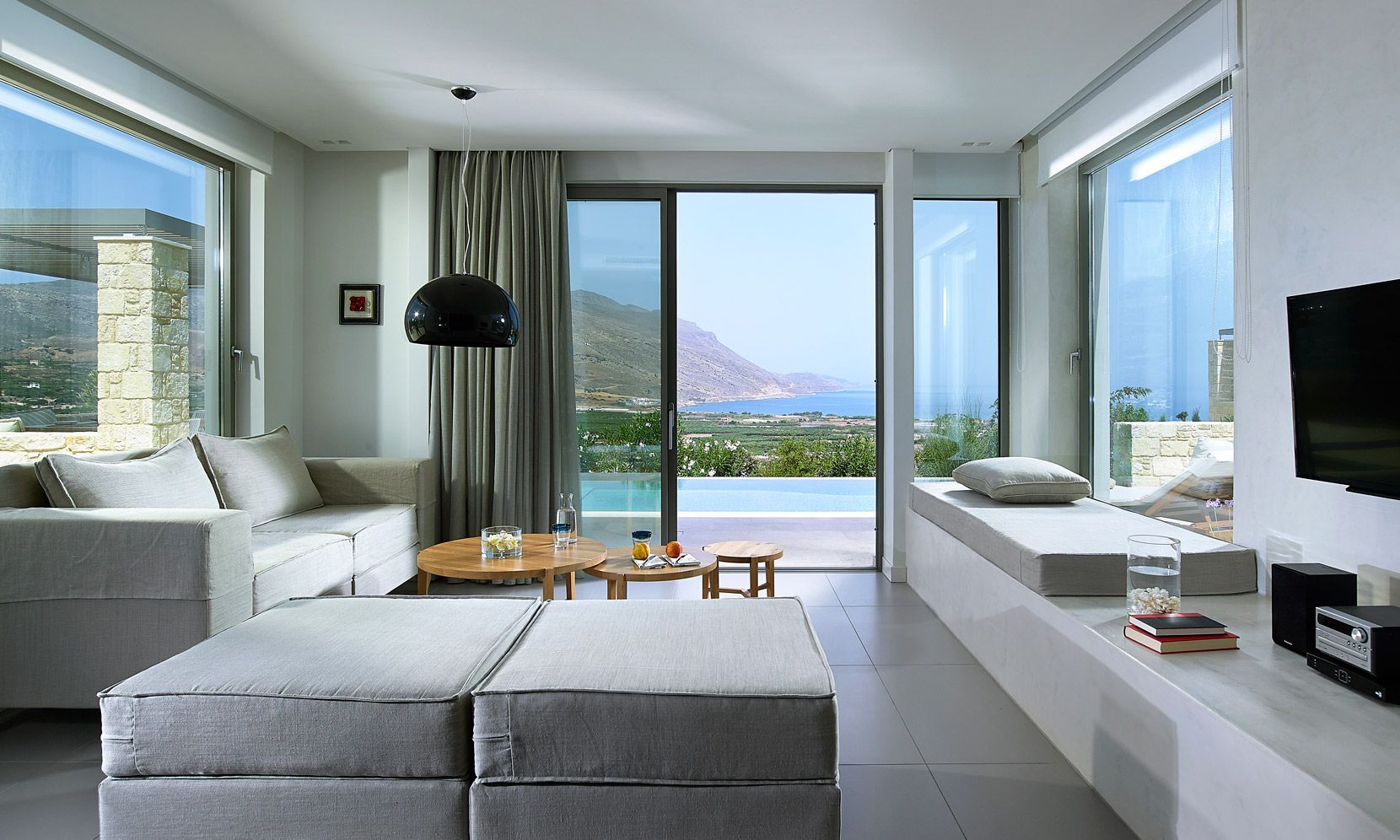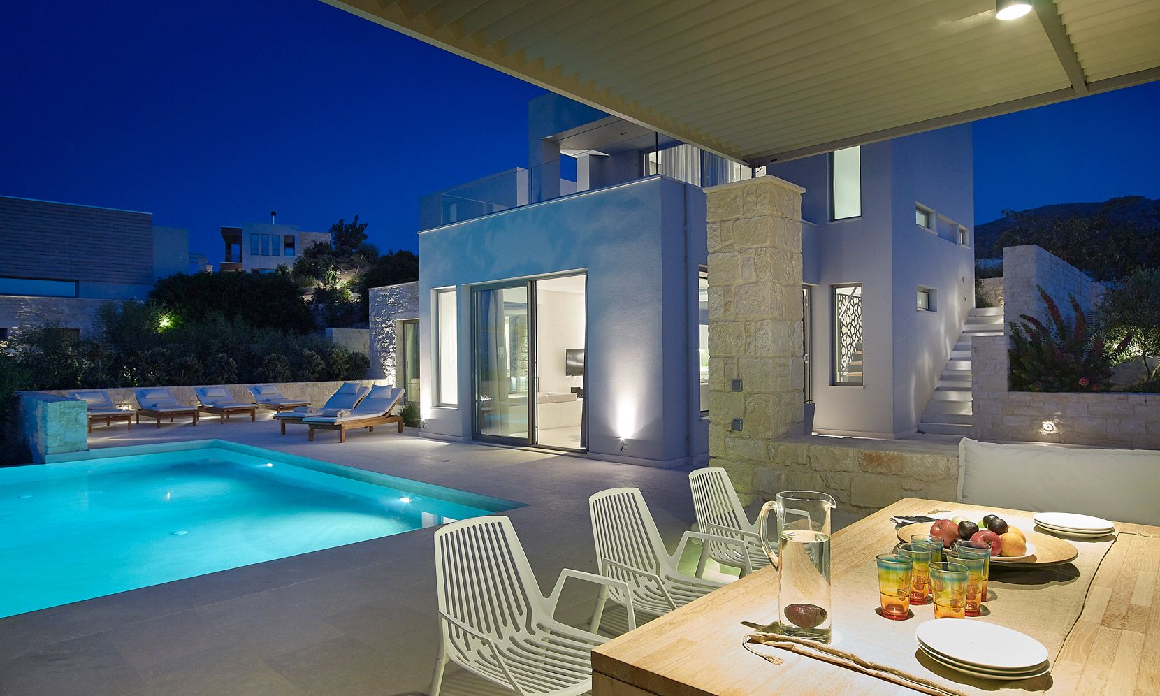 With a natural stone terrace which fronts of the property, the villa enjoys a private infinity pool plastered with a characteristic Cimentogonia surface and full-width Roman steps.