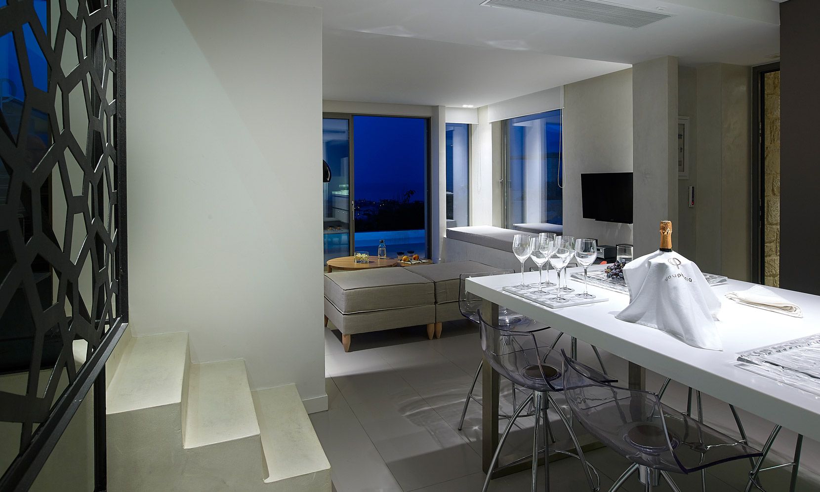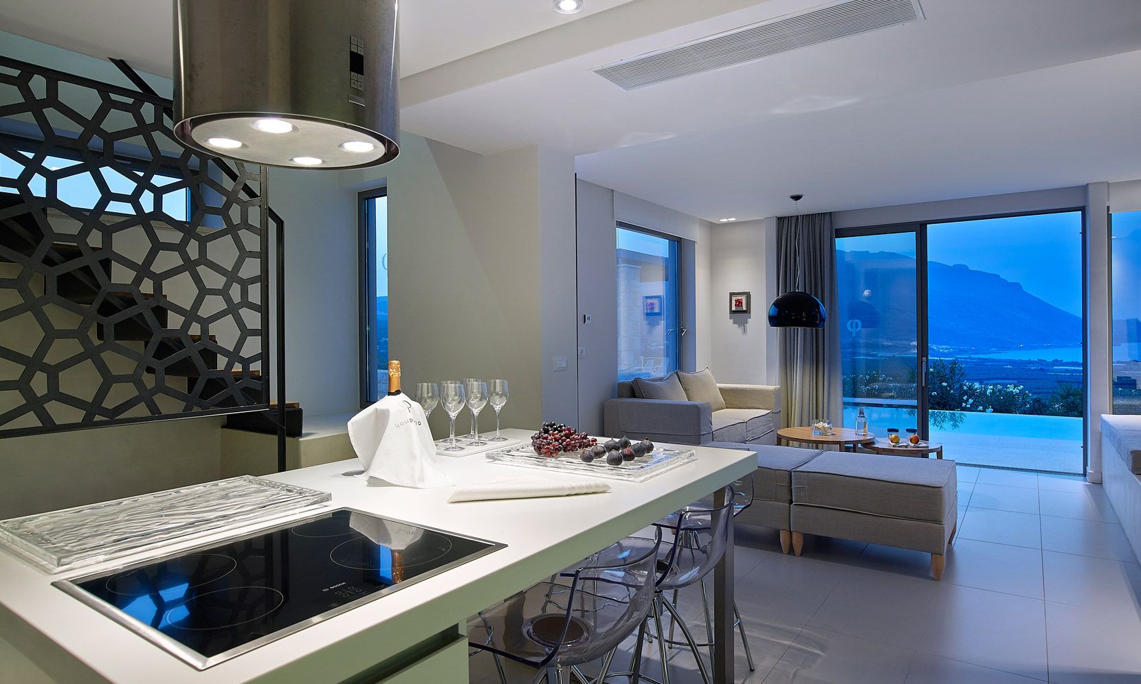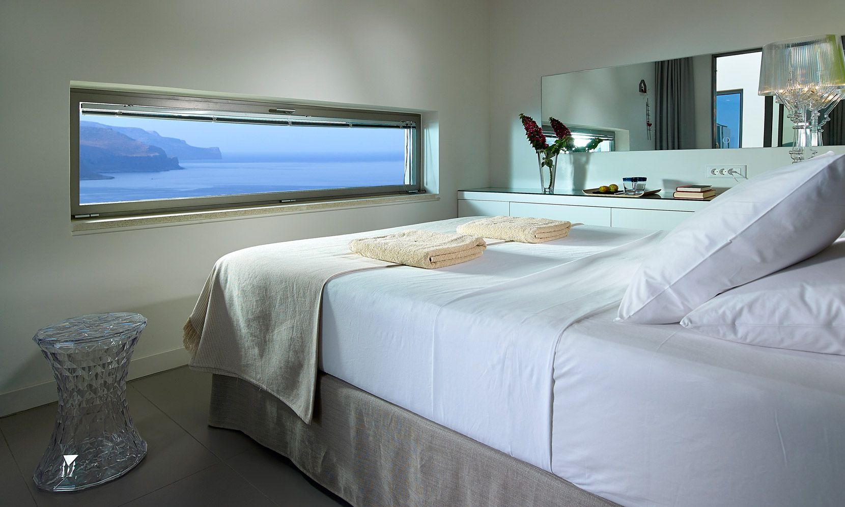 Structured over two distinct floors, with large windows maximizing the natural light, a free-standing metal staircase leads to the master bedroom anden-suite bathroom with bath. Wall-to-wall windows offer uninterrupted views of the Aegean Sea along with the additional feature of a large balcony and outdoor seating space.
