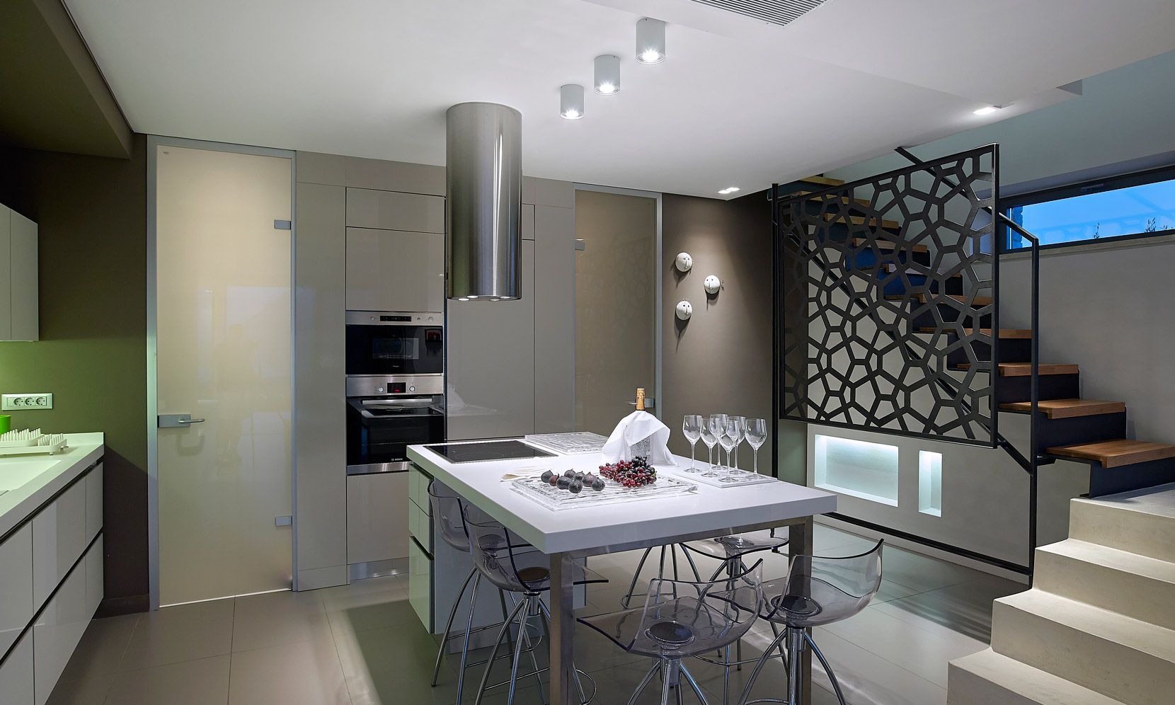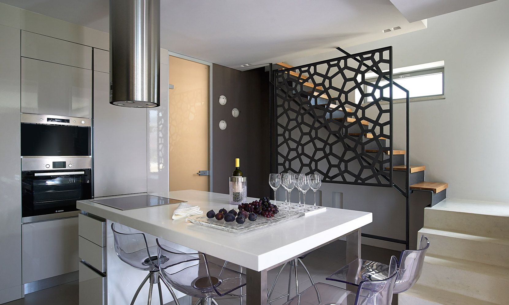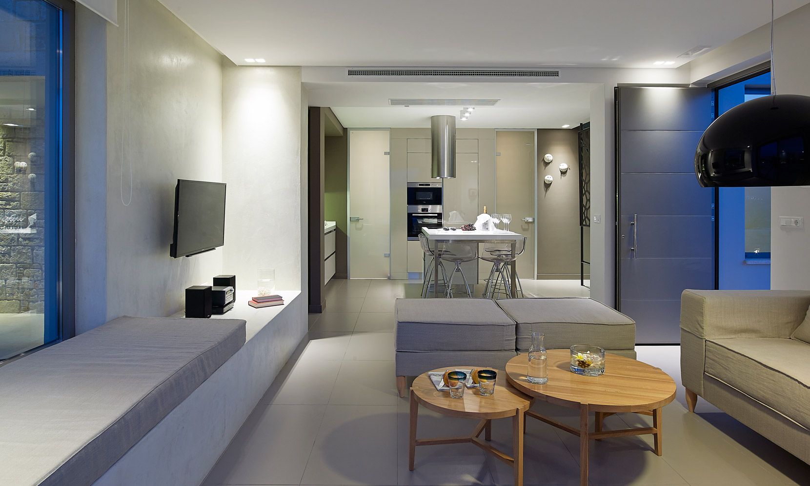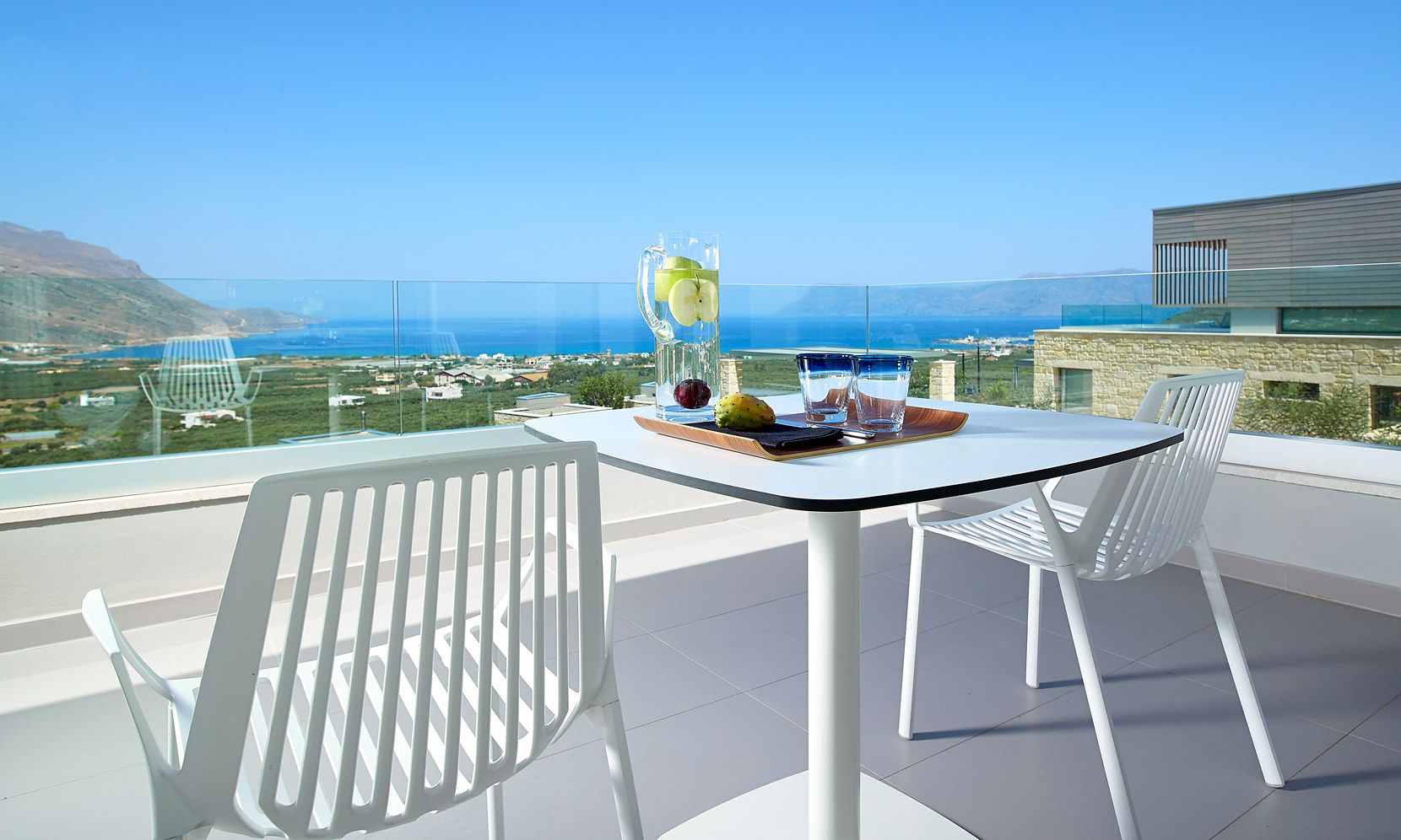 Structured over two distinct floors, with large windows maximizing the natural light, a free-standing metal staircase leads to the master bedroom anden-suite bathroom with bath. Wall-to-wall windows offer uninterrupted views of the Aegean Sea along with the additional feature of a large balcony and outdoor seating space.