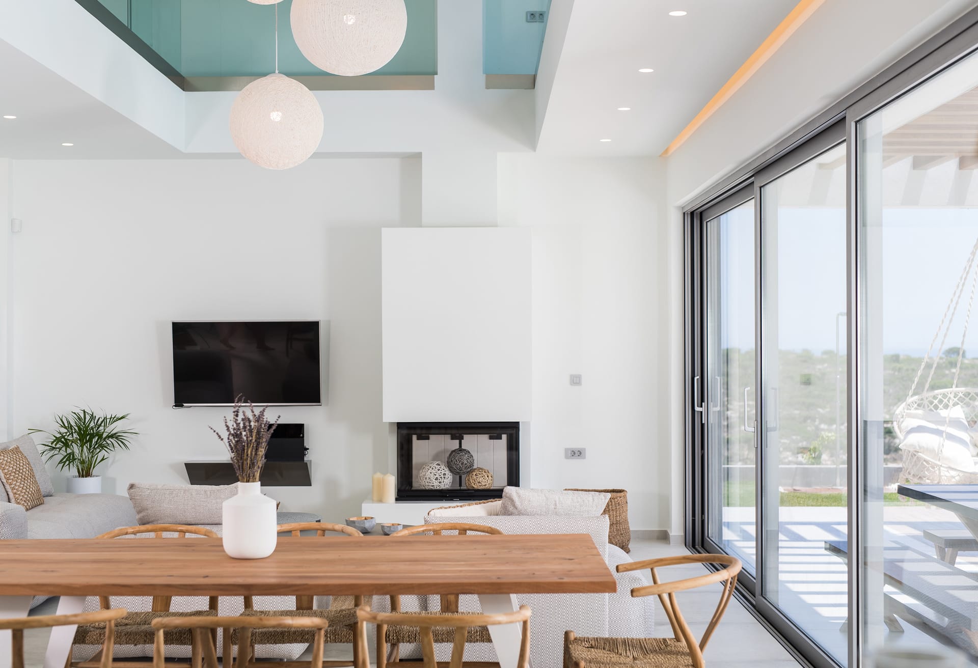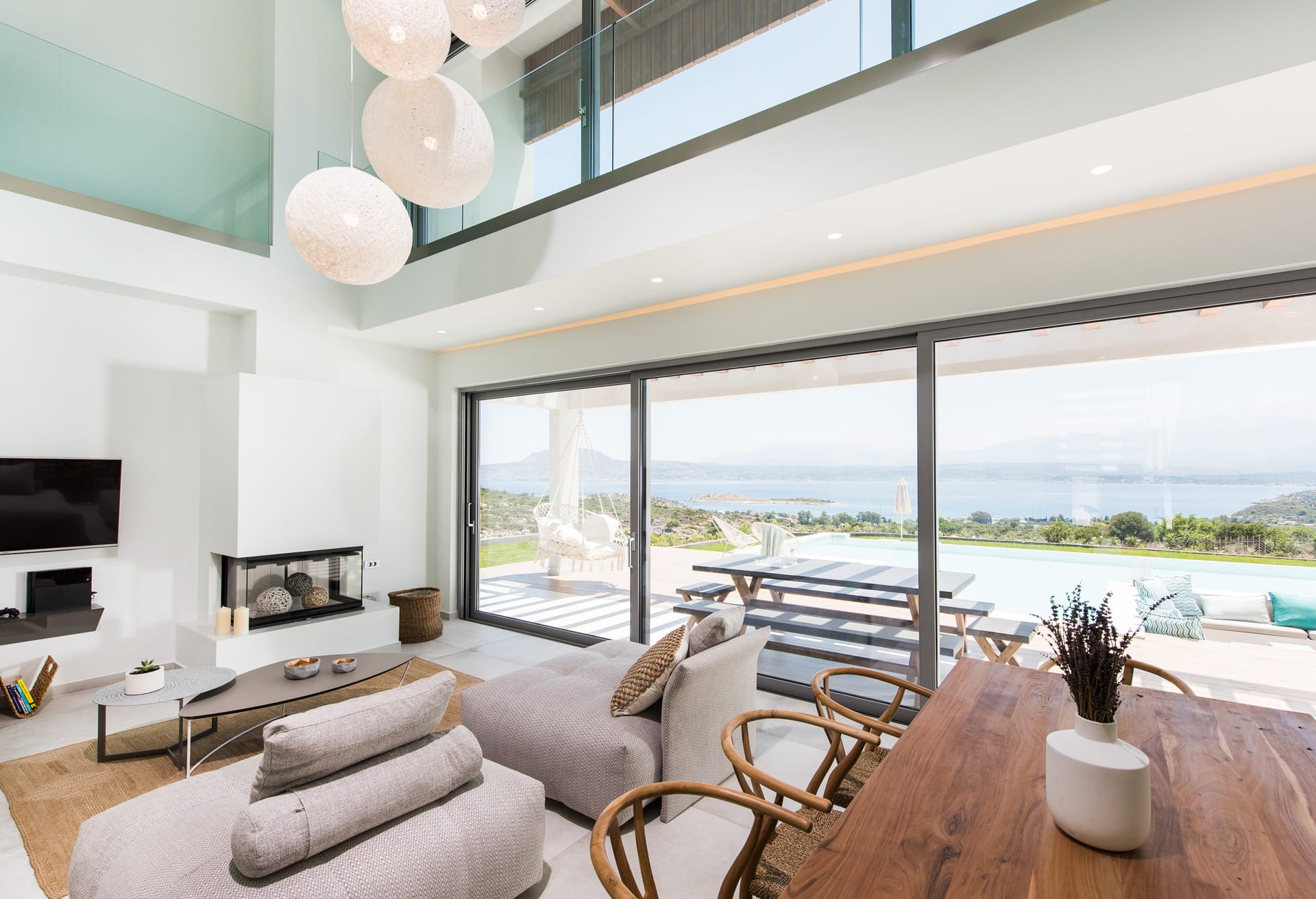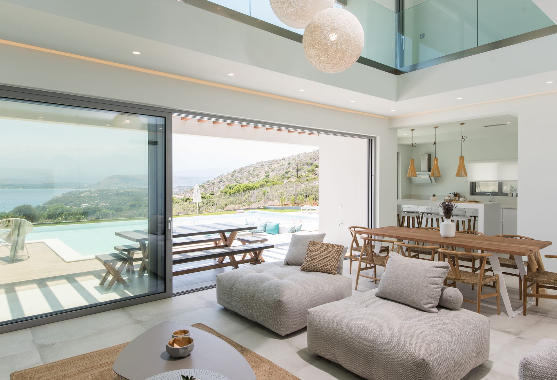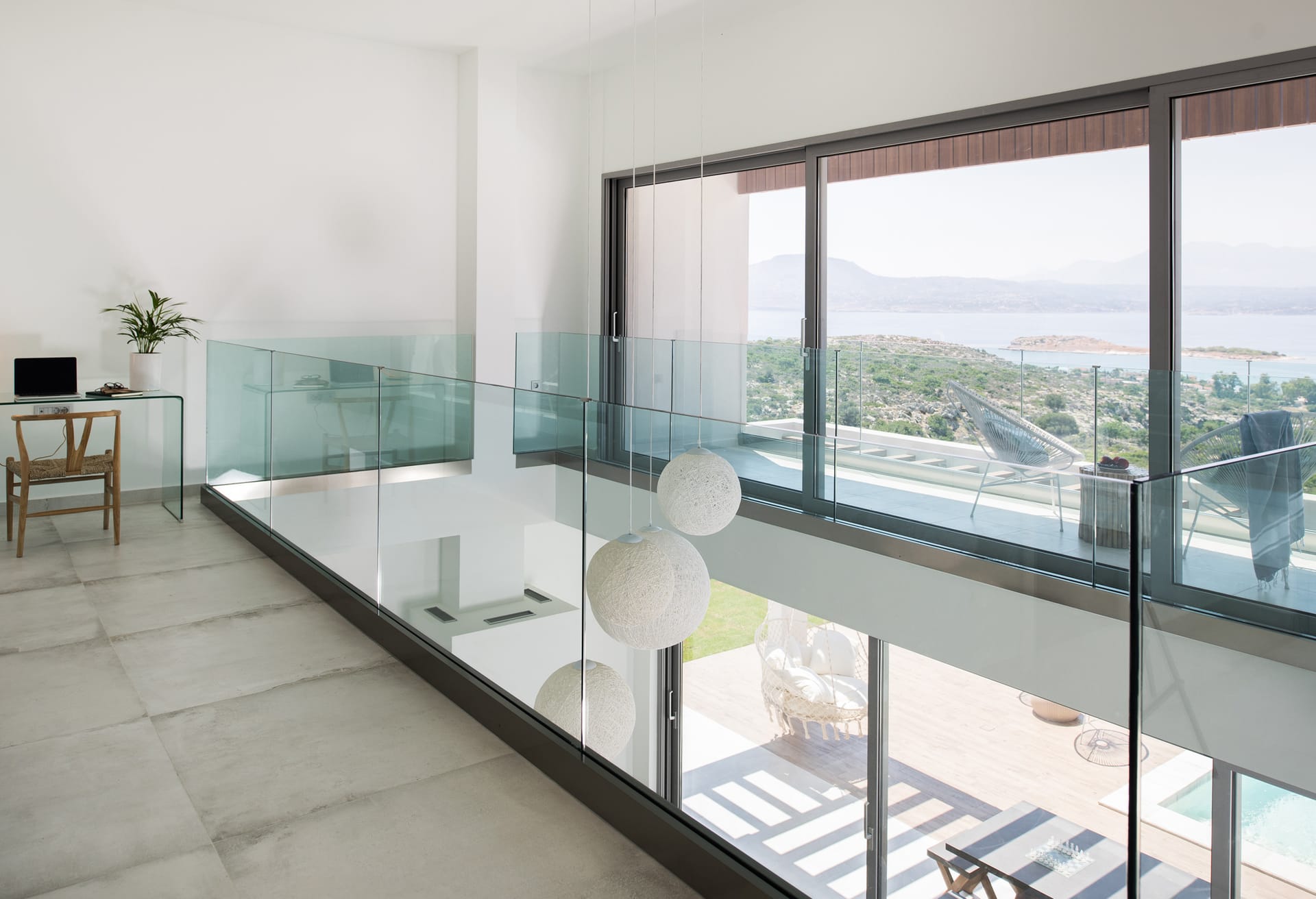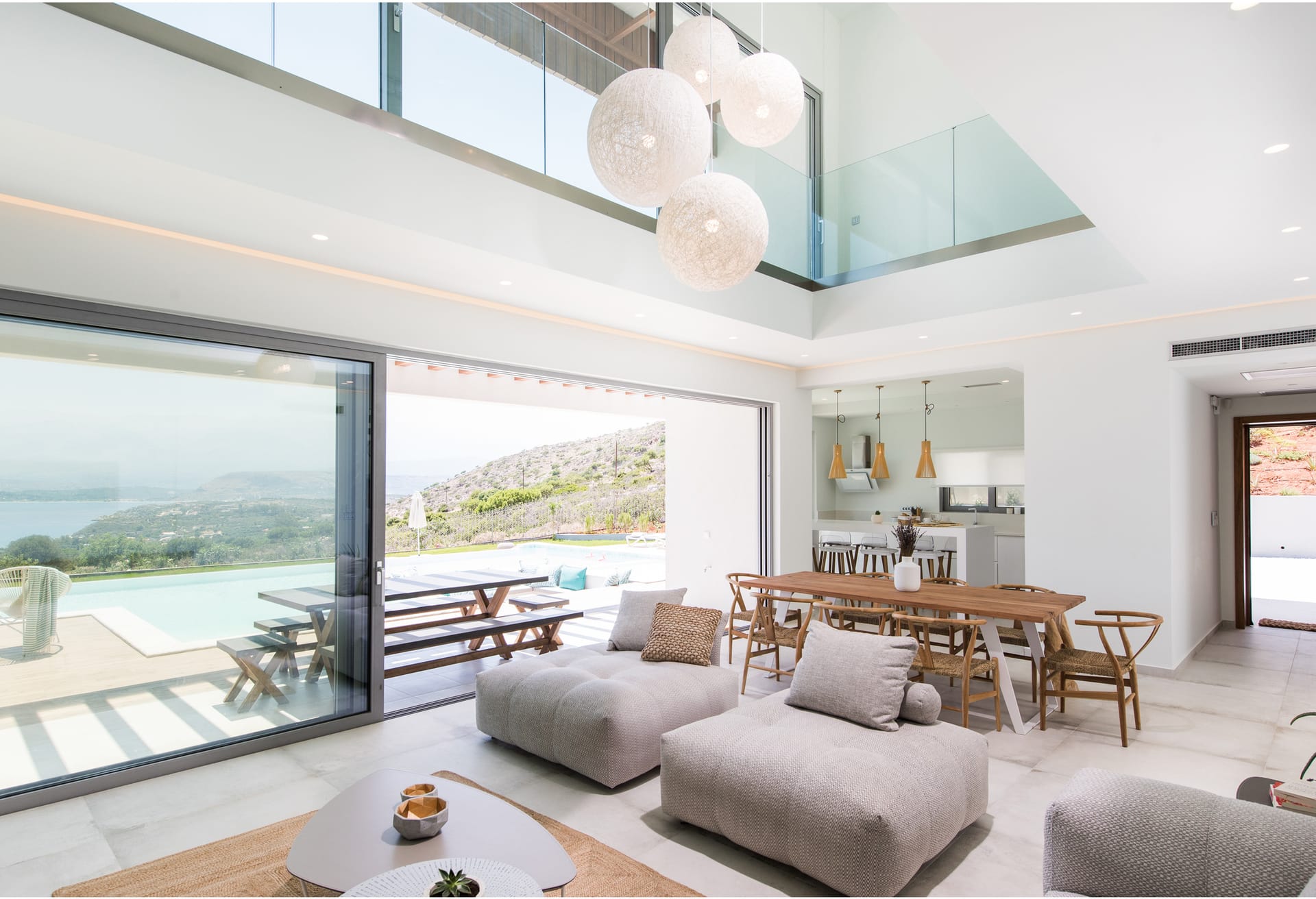 Crete Villa Dalia bathed in natural light and exudes an aura of cool sophistication, this functional haven beckons with its crisp white walls and lofty ceilings, casting a timeless charm complemented by the ever-sparkling sea view. The expansive use of glass throughout captures the calming sea vista, a remedy for urban stress.