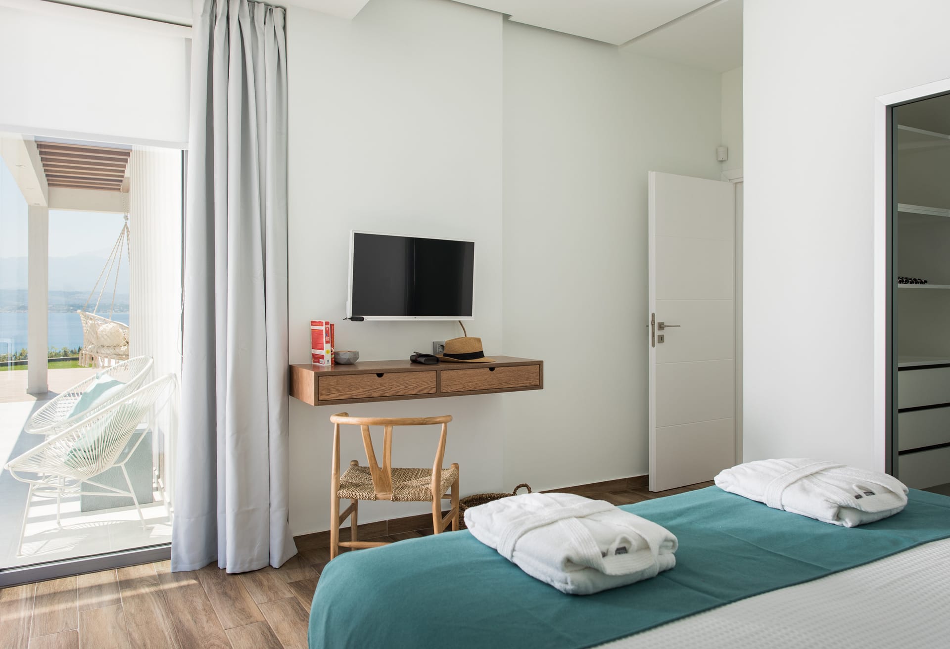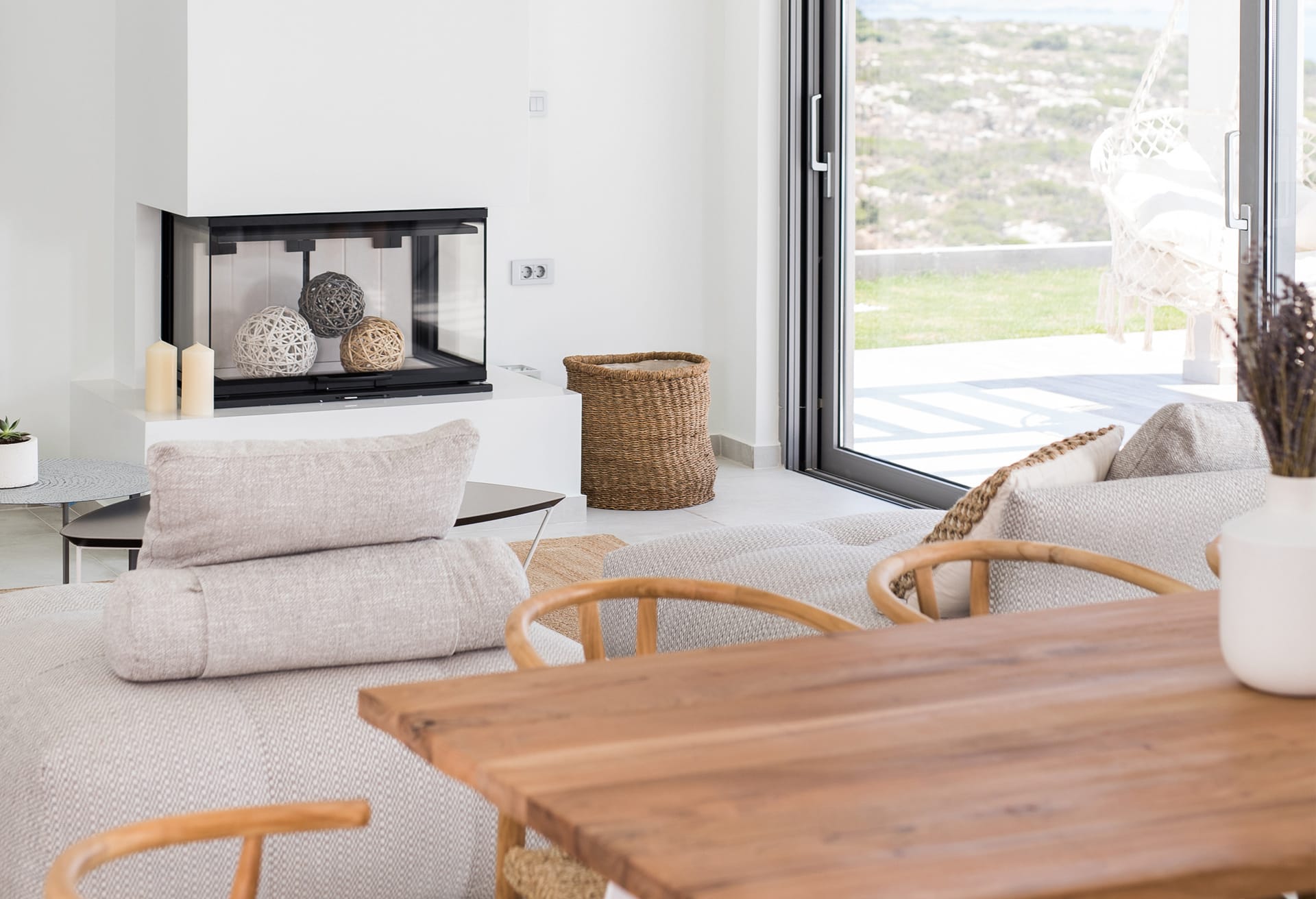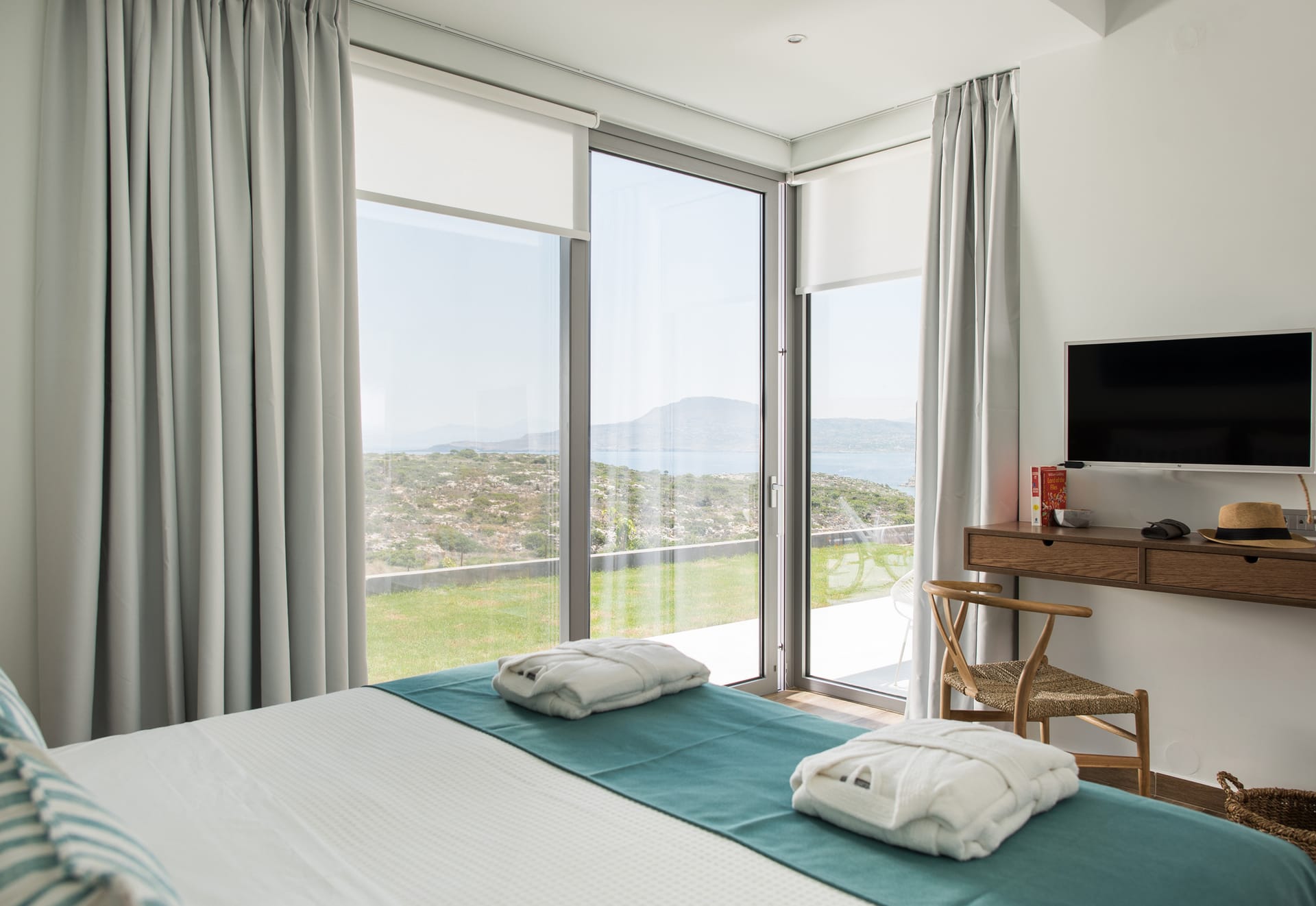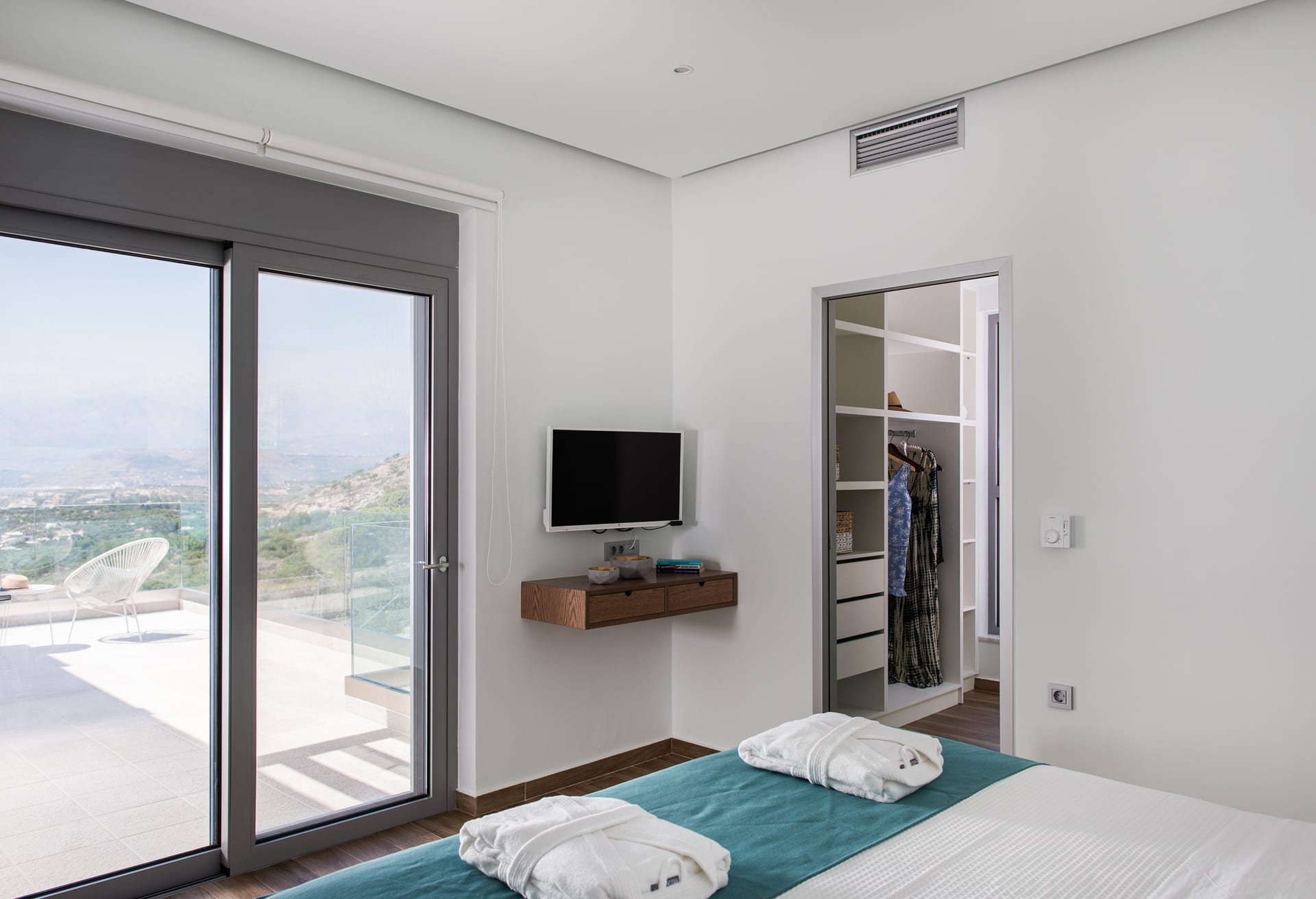 Crete Villa Dalia bathed in natural light and exudes an aura of cool sophistication, this functional haven beckons with its crisp white walls and lofty ceilings, casting a timeless charm complemented by the ever-sparkling sea view. The expansive use of glass throughout captures the calming sea vista, a remedy for urban stress.