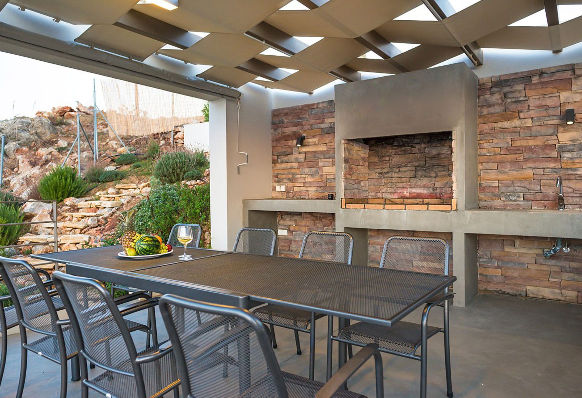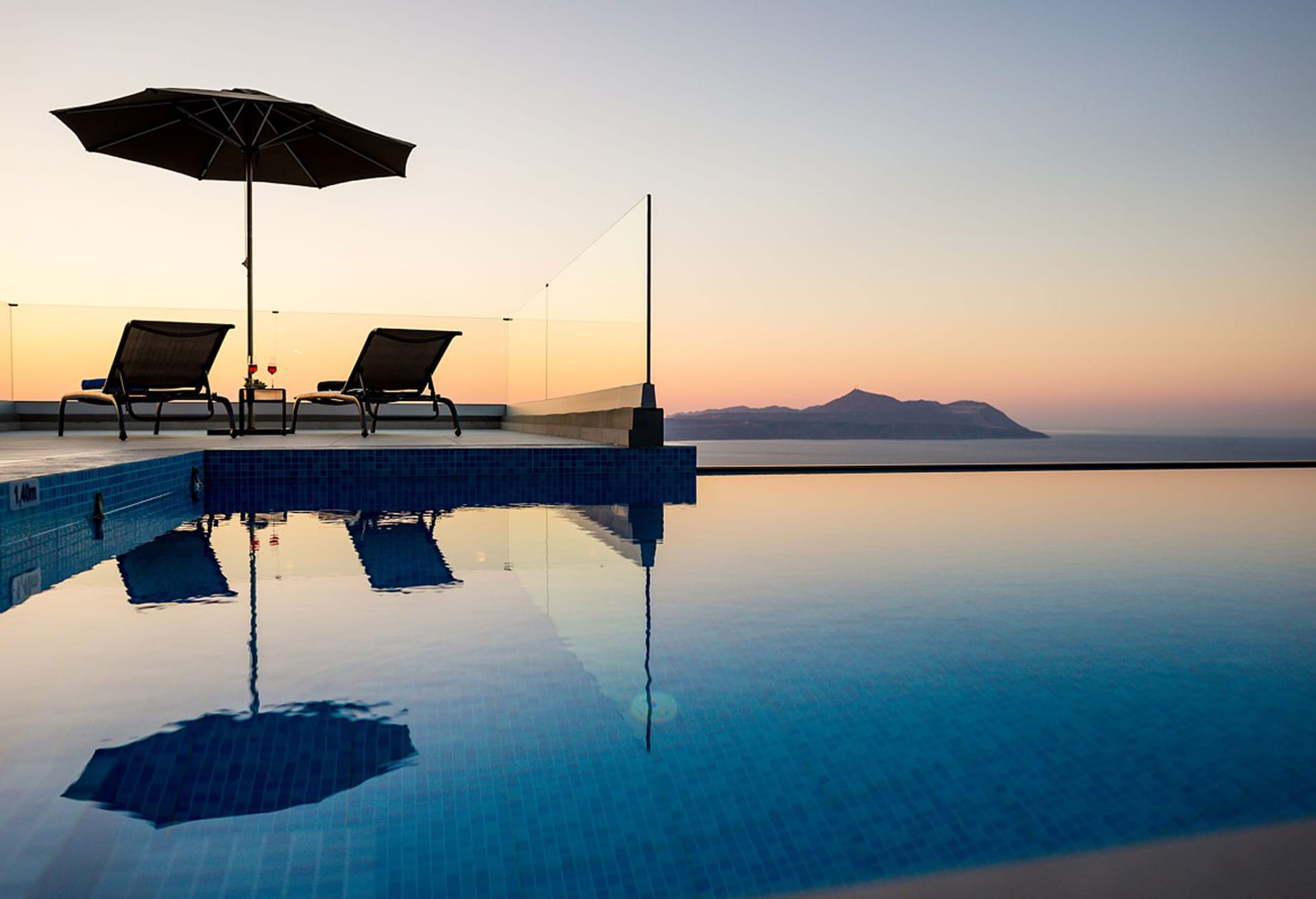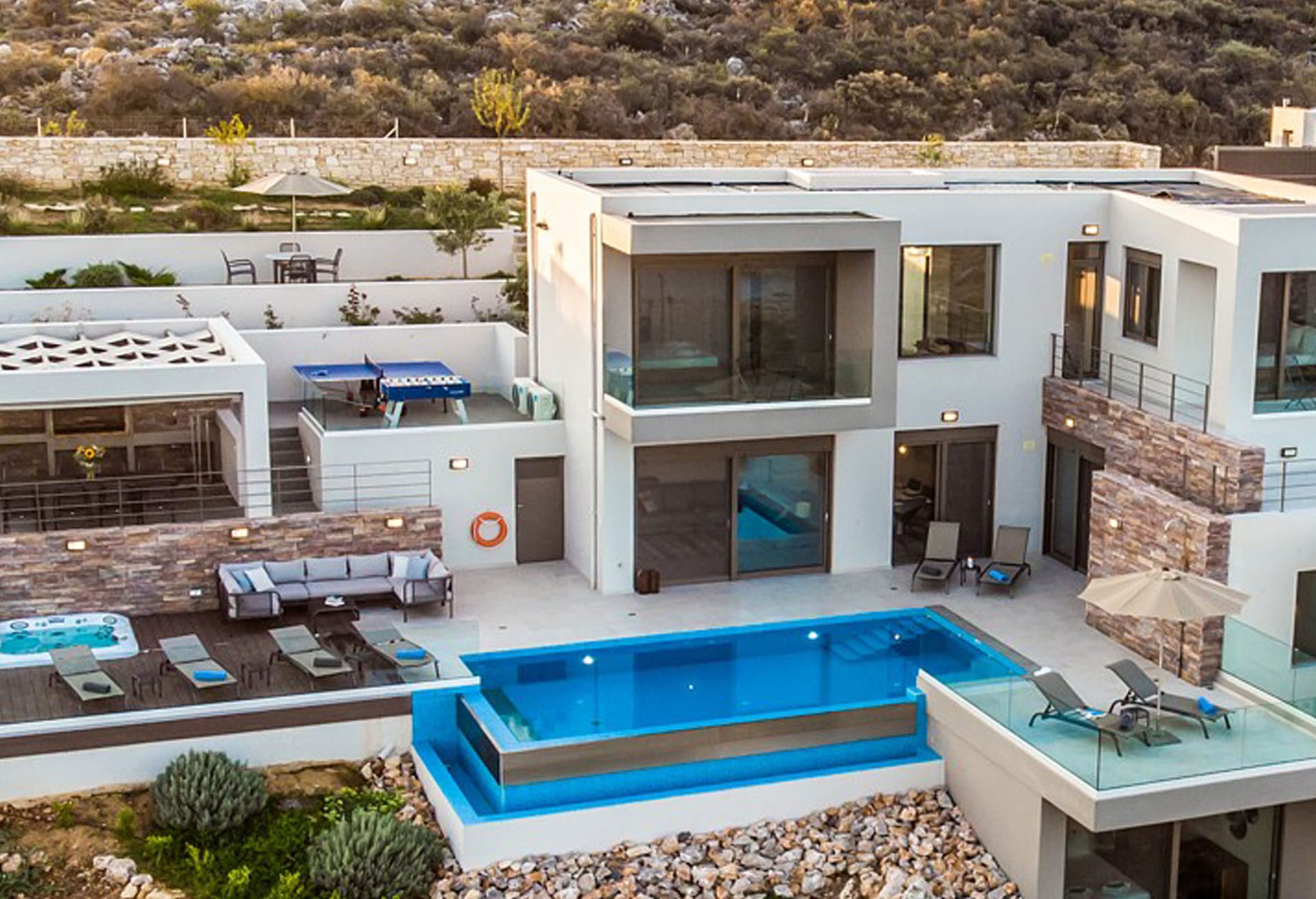 Outside, the Crete Villa Edge is surrounded by landscaped gardens with a solar panel-heated infinity pool and a hot tub offering panoramic sunset views. The pool has a cover for retaining heat, and the hot tub features illuminated headrests and 40 jets. An outdoor dining area with a built-in BBQ, fridge, and sink is perfect for al fresco meals. Enjoy outdoor games with table football and a ping pong table, and find multiple terraces, balconies, and sunbathing areas.