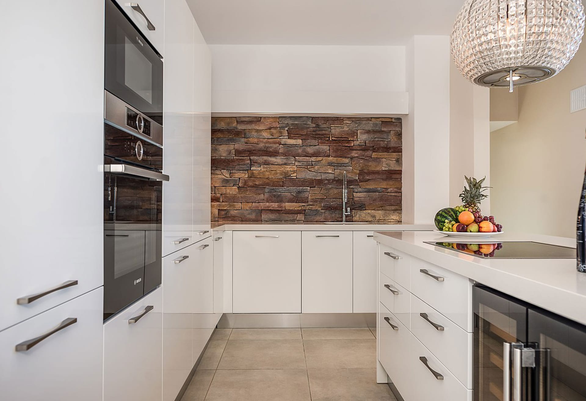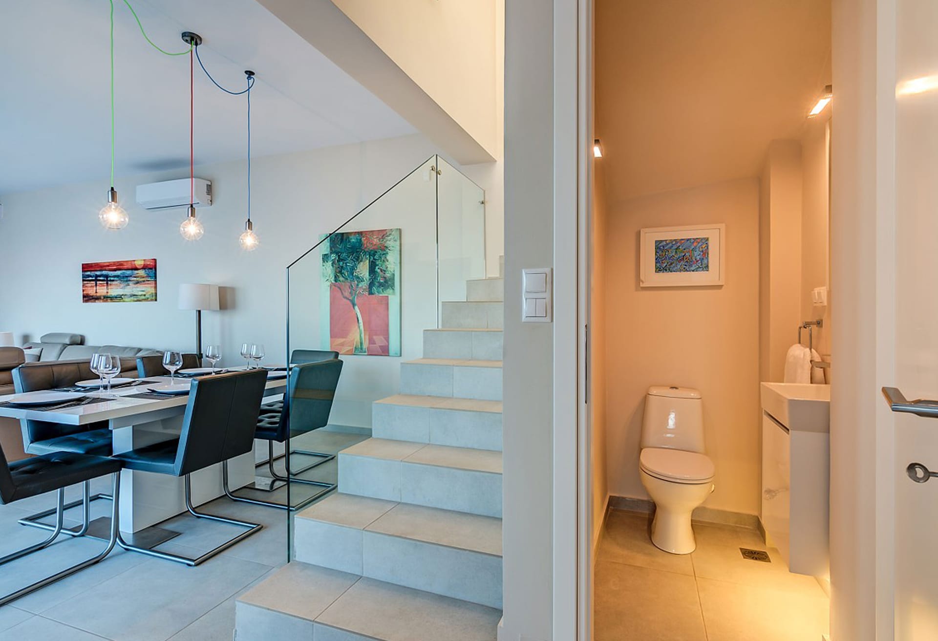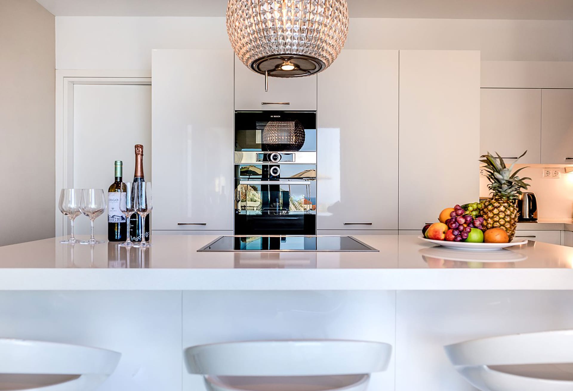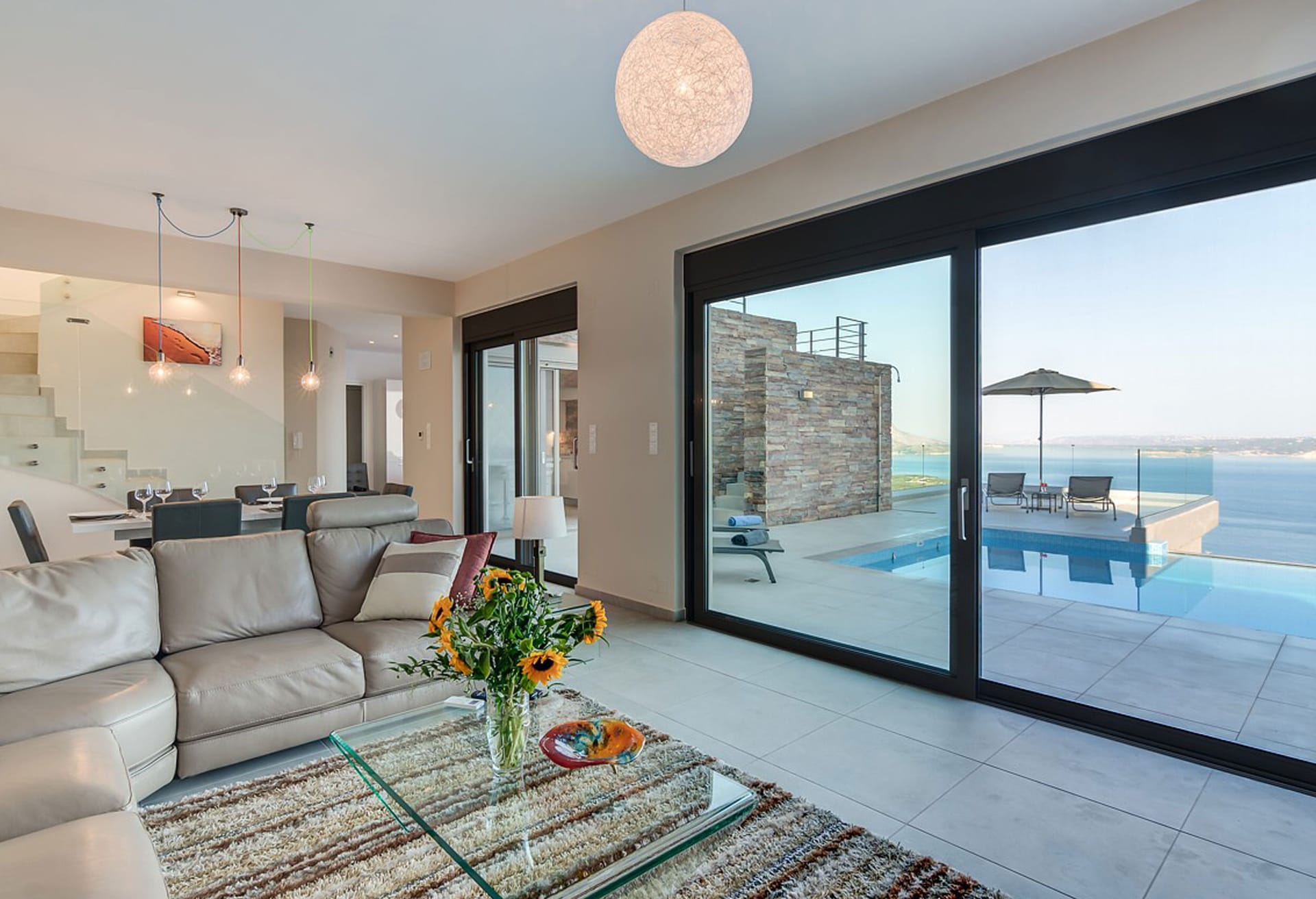 The main living area, located on the pool level, boasts a leather corner sofa, a dining table for 8, a 49-inch TV, and a Sonos Bluetooth music system. The Italian kitchen is fully equipped with high-end appliances, and there's a separate utility room with laundry facilities.