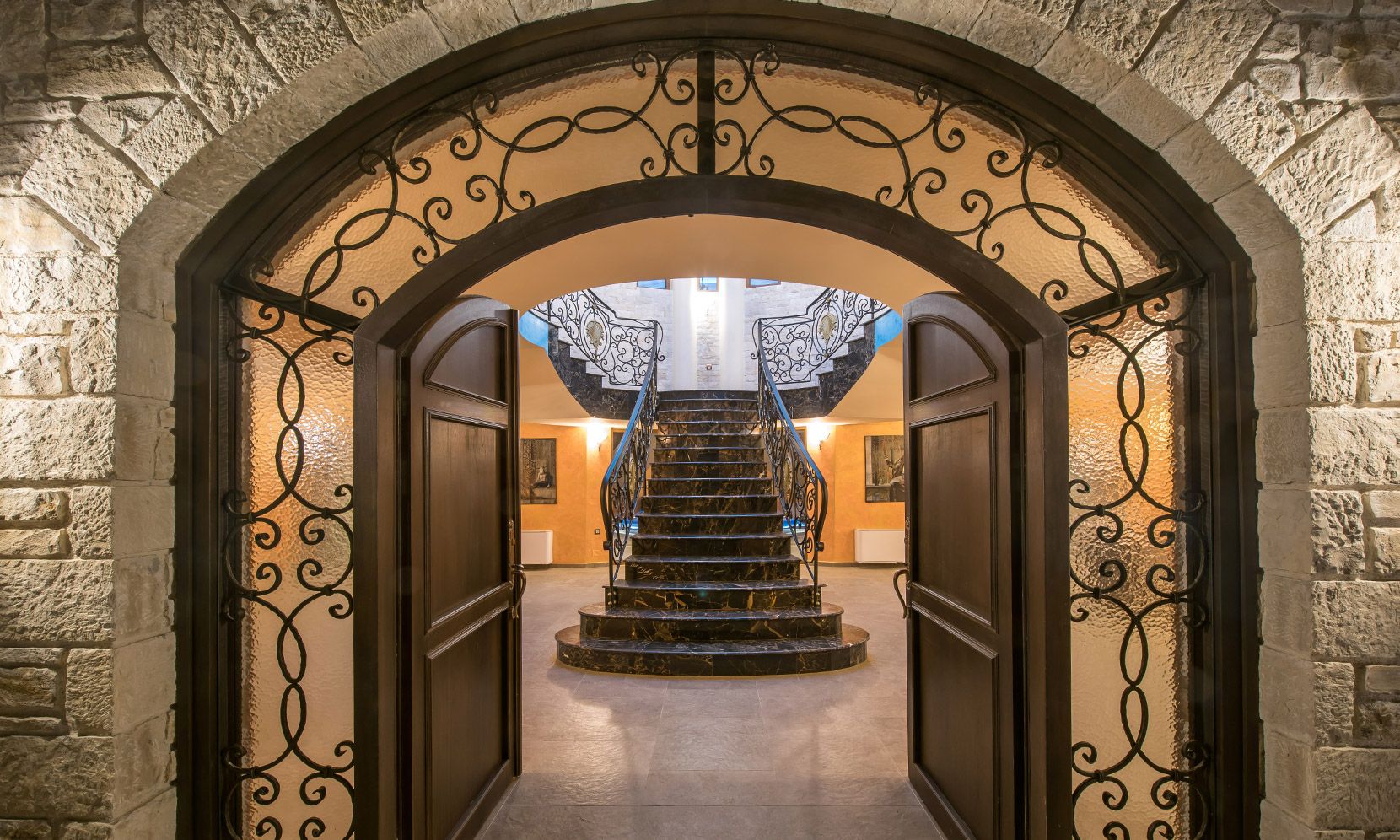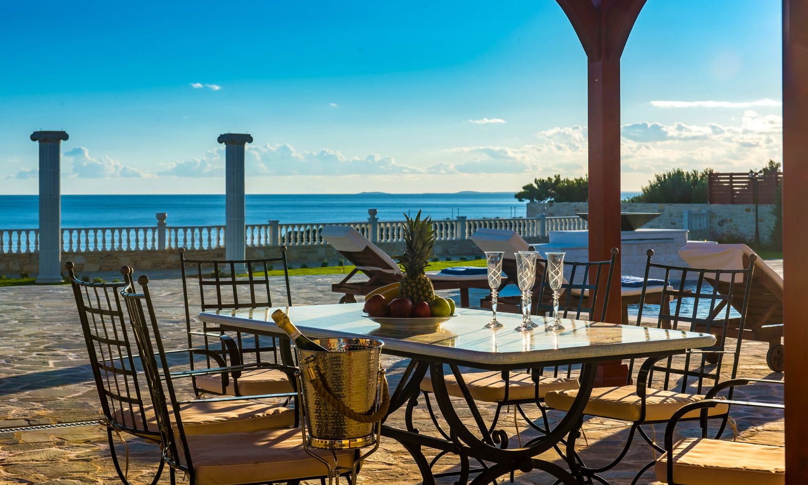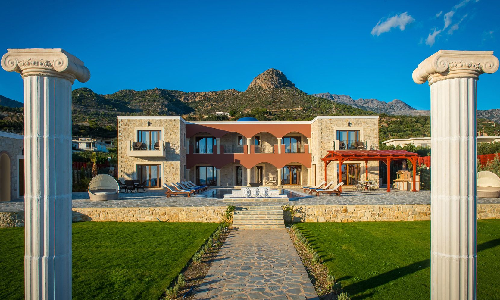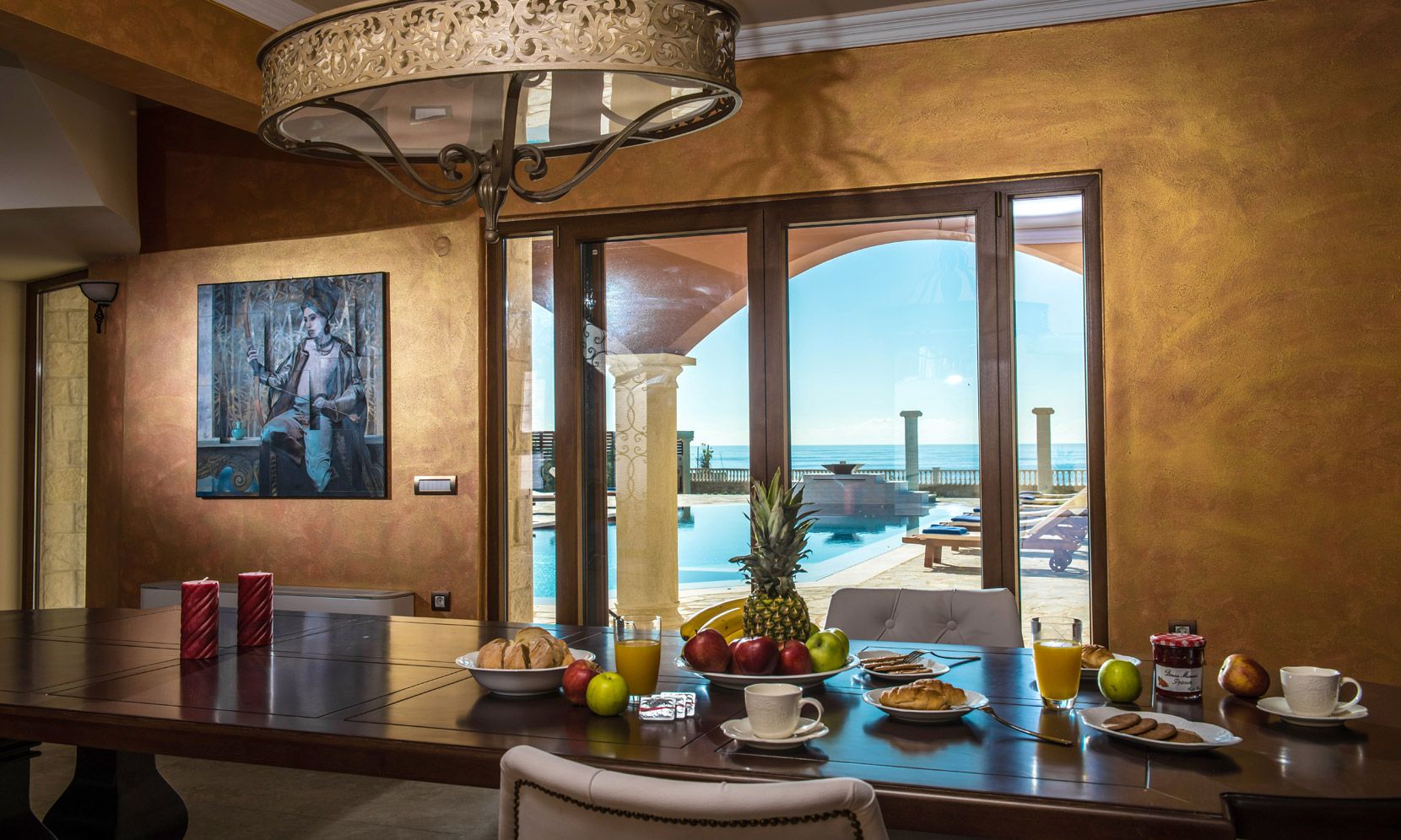 Villa Kalliste sits at the edge of Ferma Beach, a gorgeous cove-like shore with crystalline blue water. Villa Kalliste is just outside of the seaside village of Ferma, which is home to many excellent small tavernas and restaurants. After a short drive down the main road in town, visitors will turn into a beautifully gated private driveway, gazing up at Mediterranean palatial splendor.