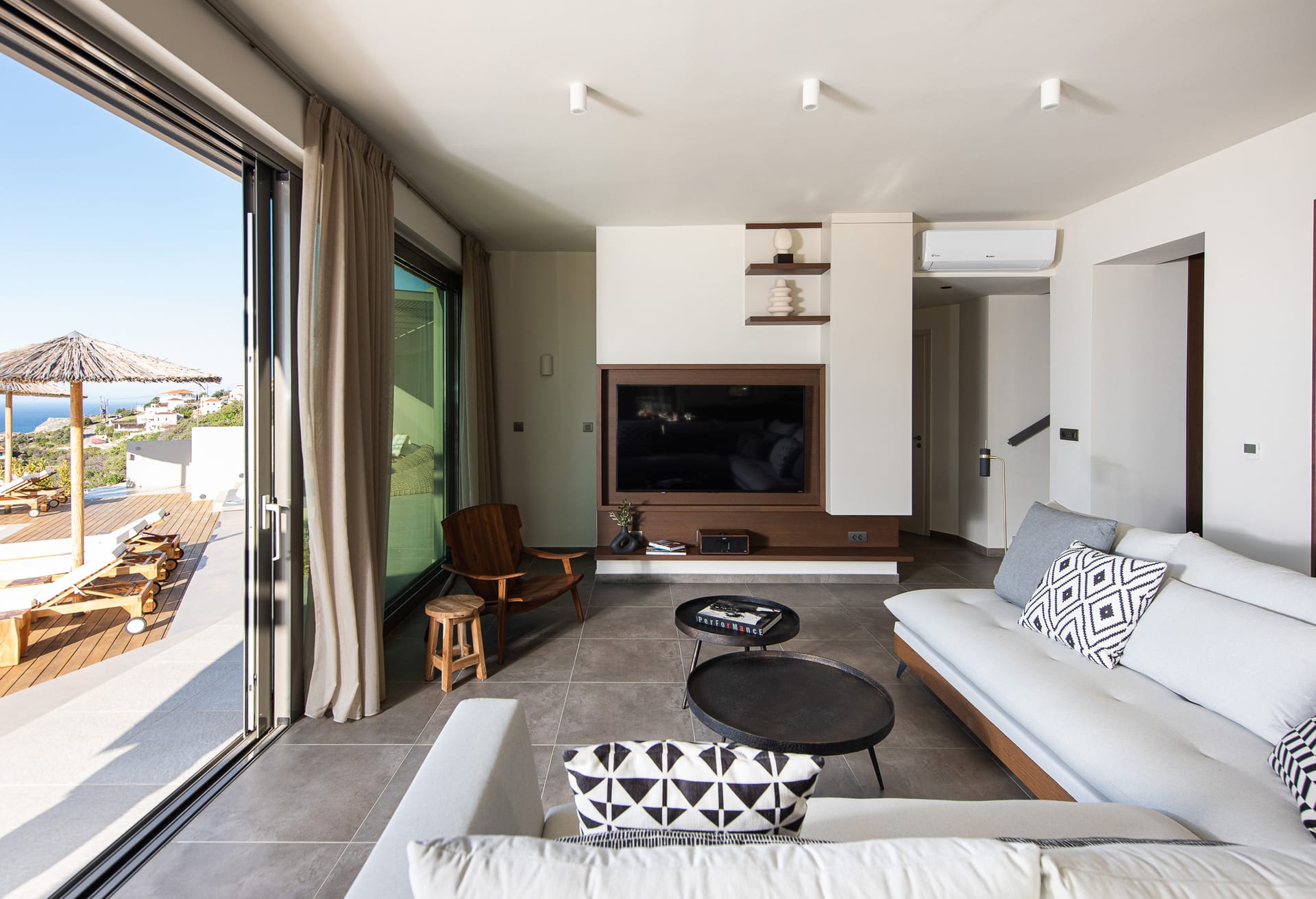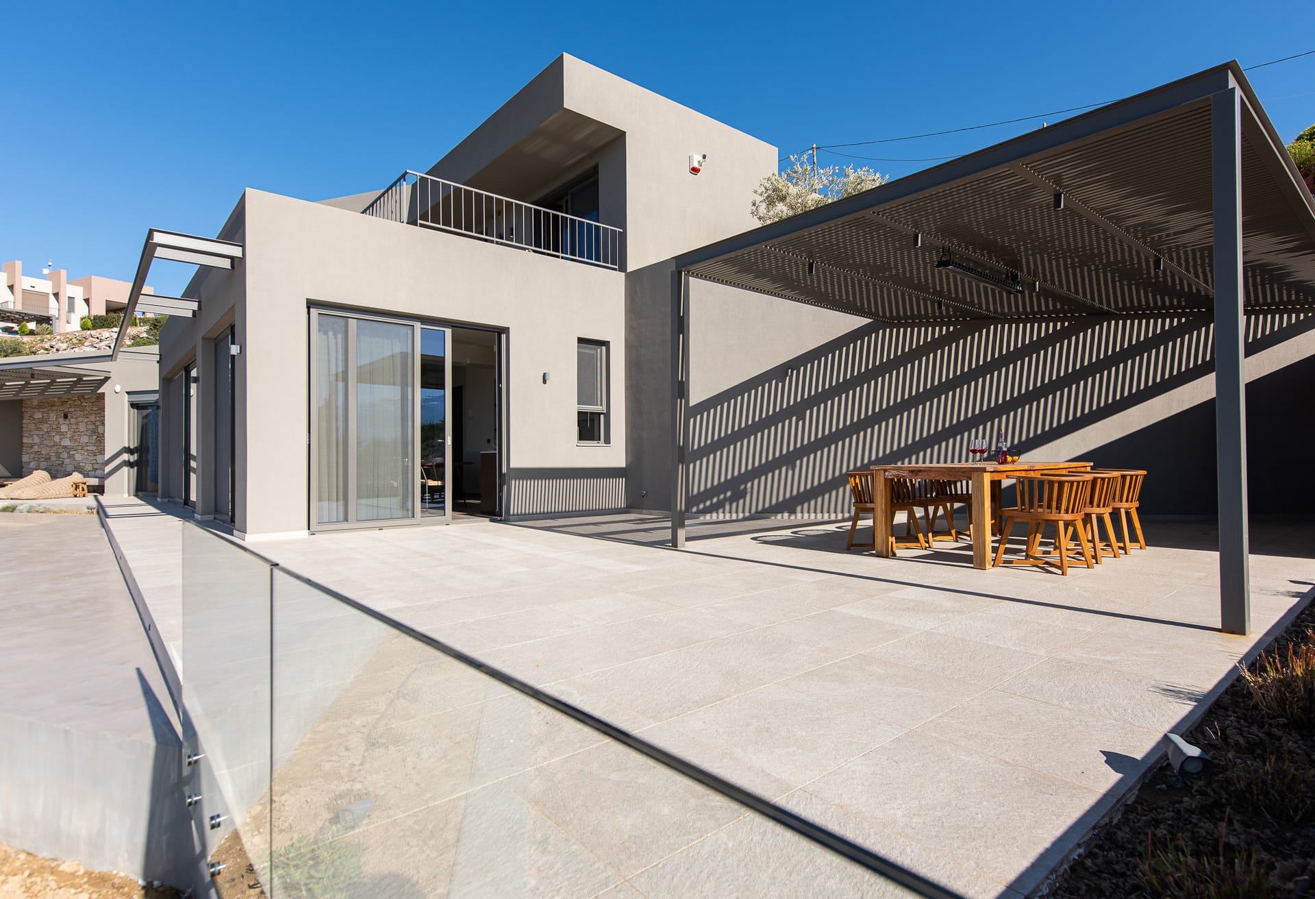 The villa's design seamlessly blends functionality with aesthetics, featuring multiple balconies and terraces that offer both privacy and panoramic views. Inside, a spacious open-plan kitchen, dining, and lounge area provide a communal space for gatherings and relaxation.