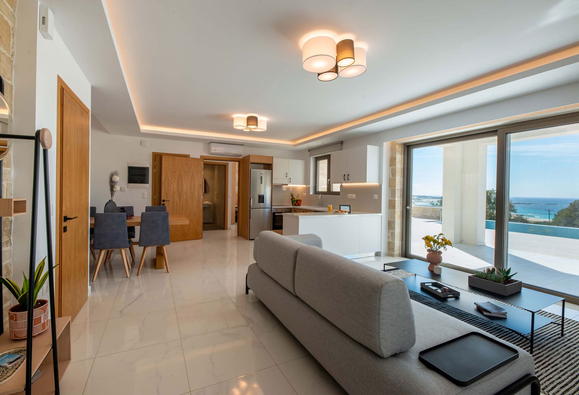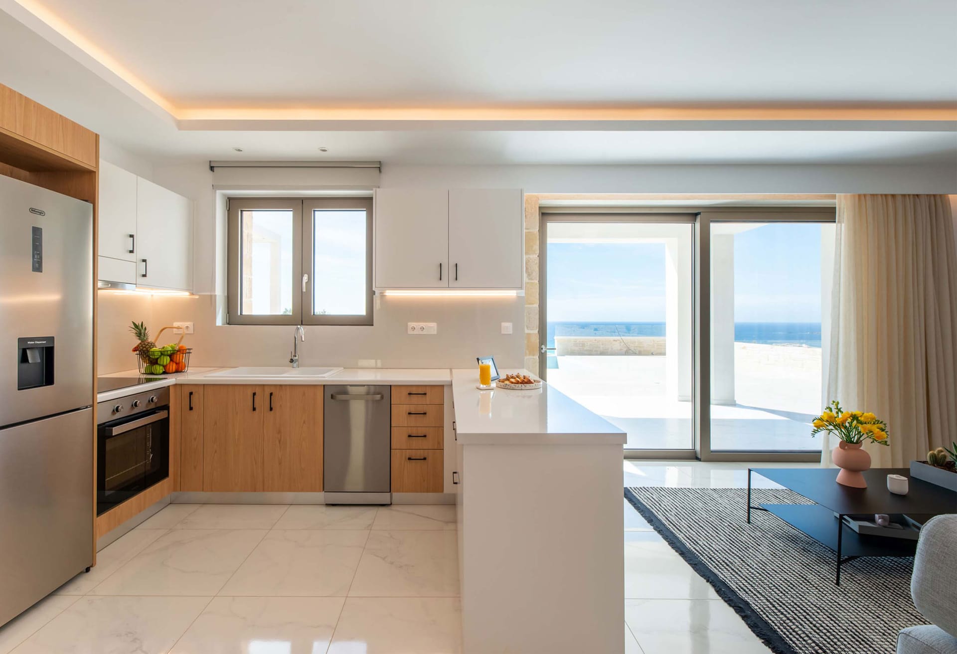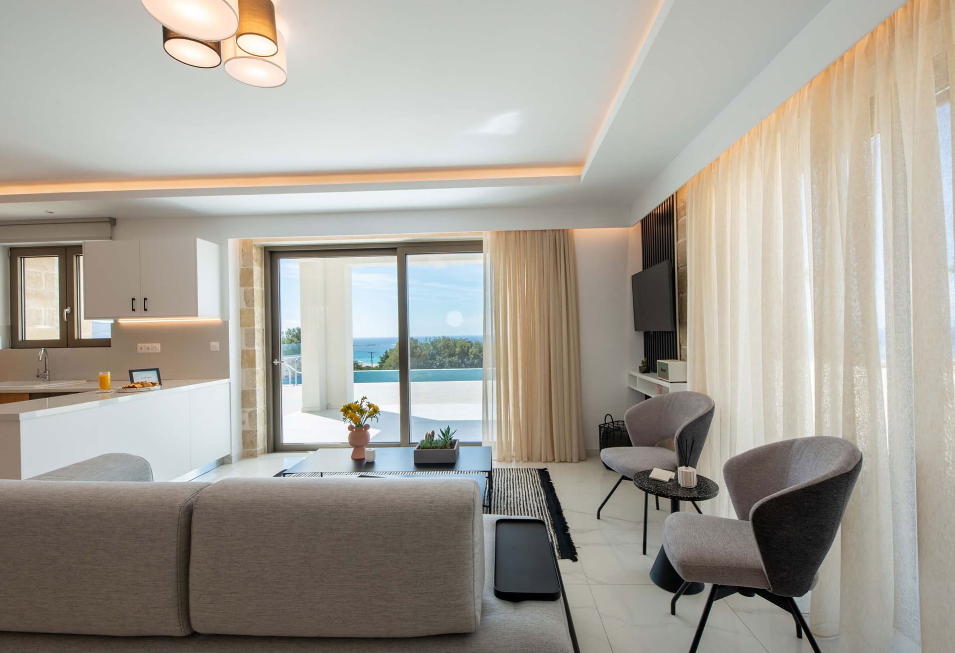 - Living area with sofa, 43’’ satellite Smart TV, access to the pool terrace, sea view