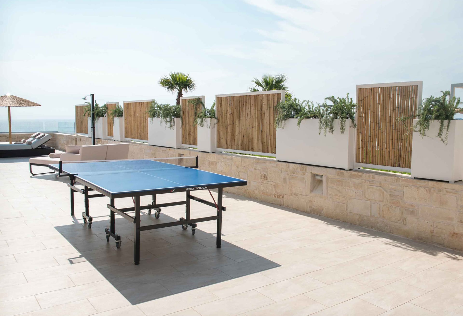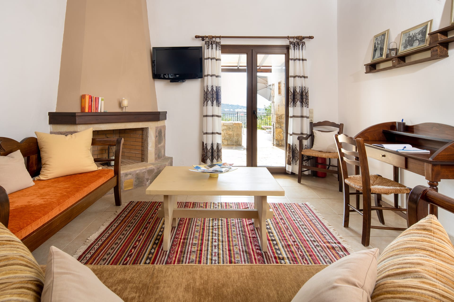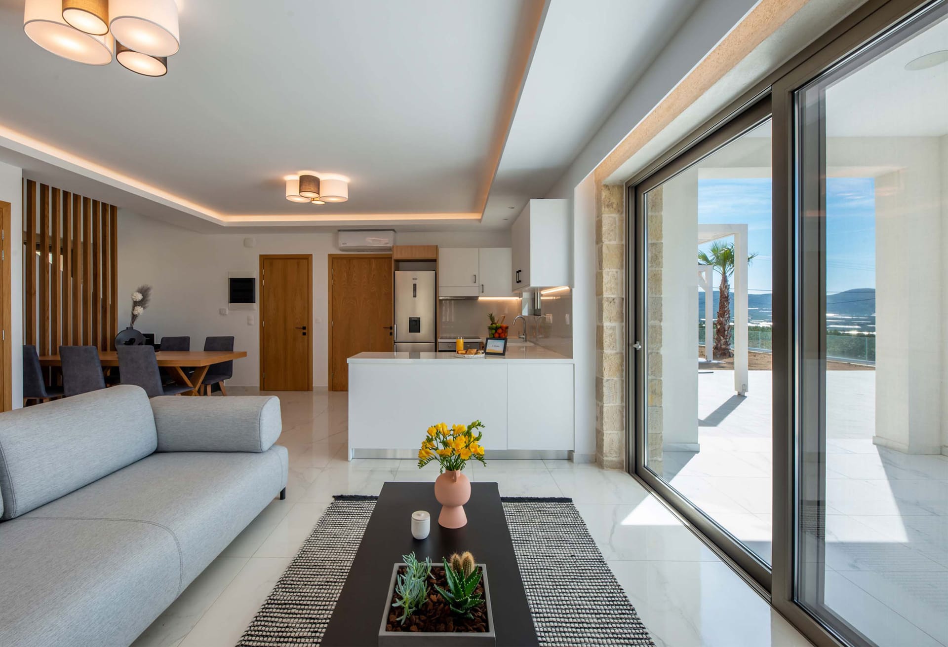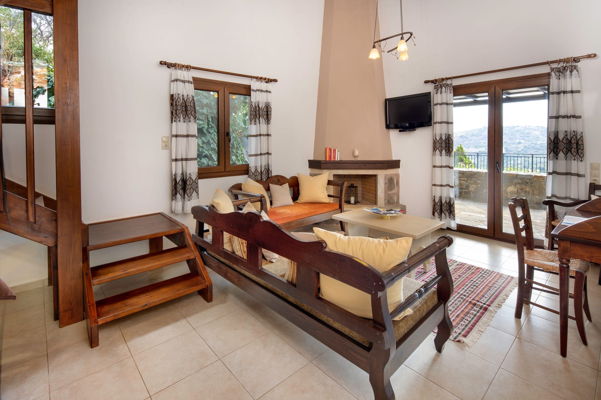 - Living area with sofa, 43’’ satellite Smart TV, access to the pool terrace, sea view