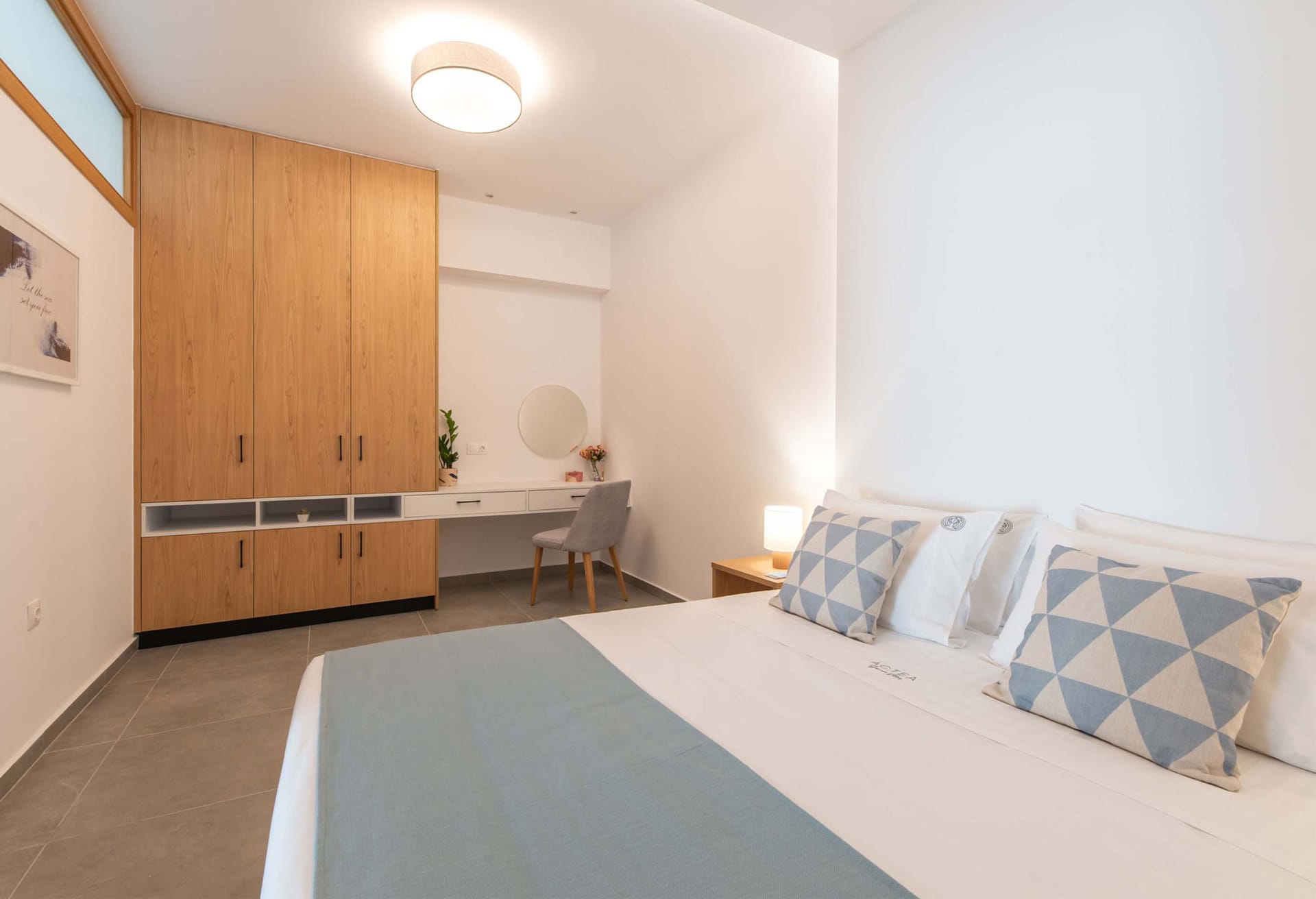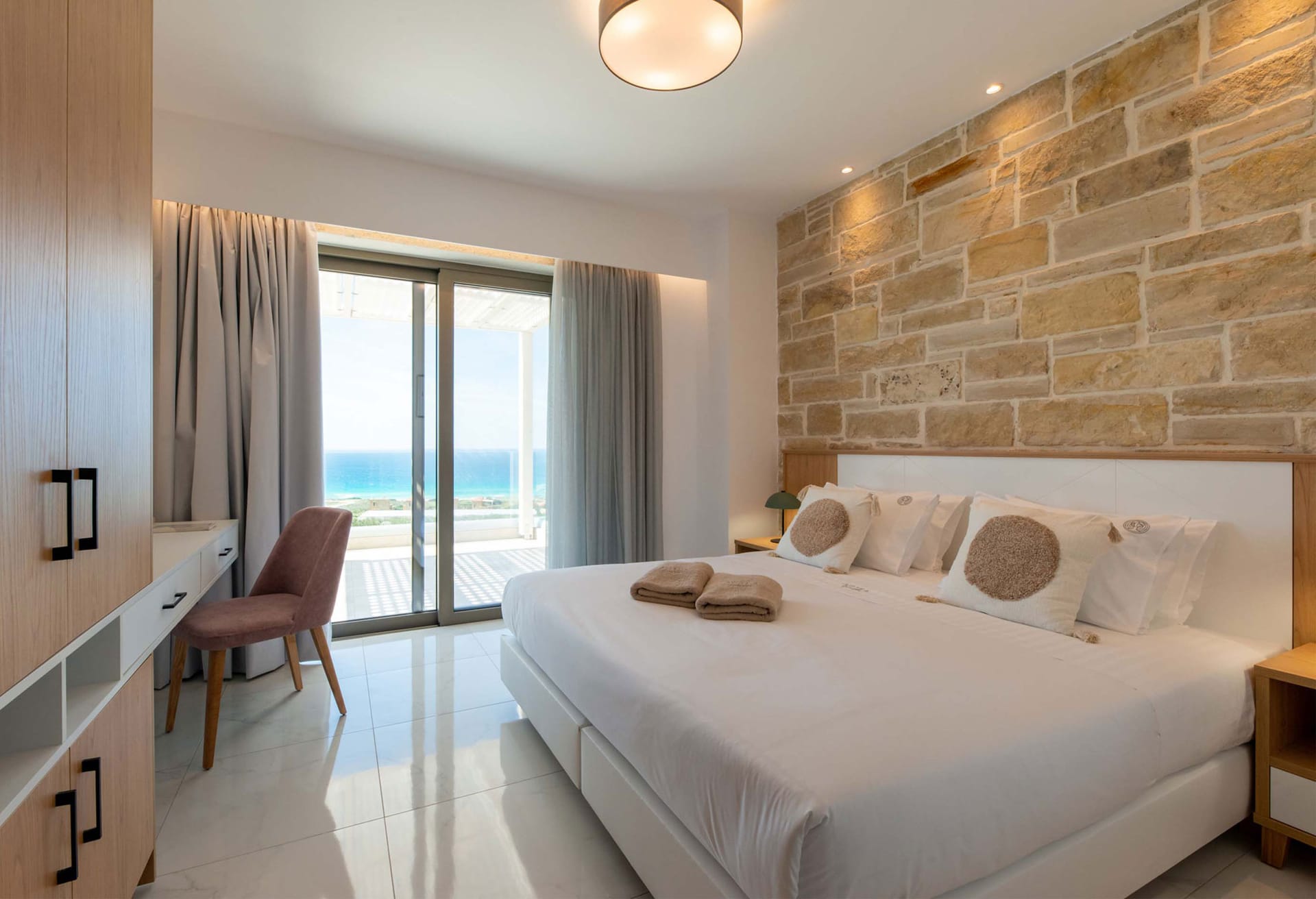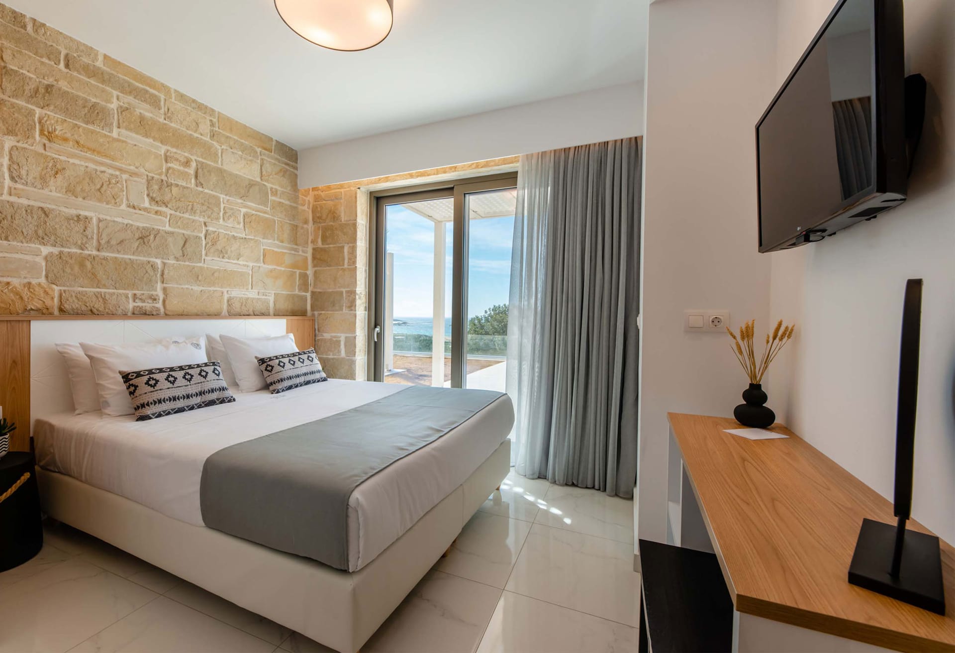 - Bedroom 1: Queen-size bed (1.60x2.00), A/C, 32’’ Smart Satellite TV, ensuite bathroom with shower suitable for guests with mobility needs, hairdryer, pool access, sea view