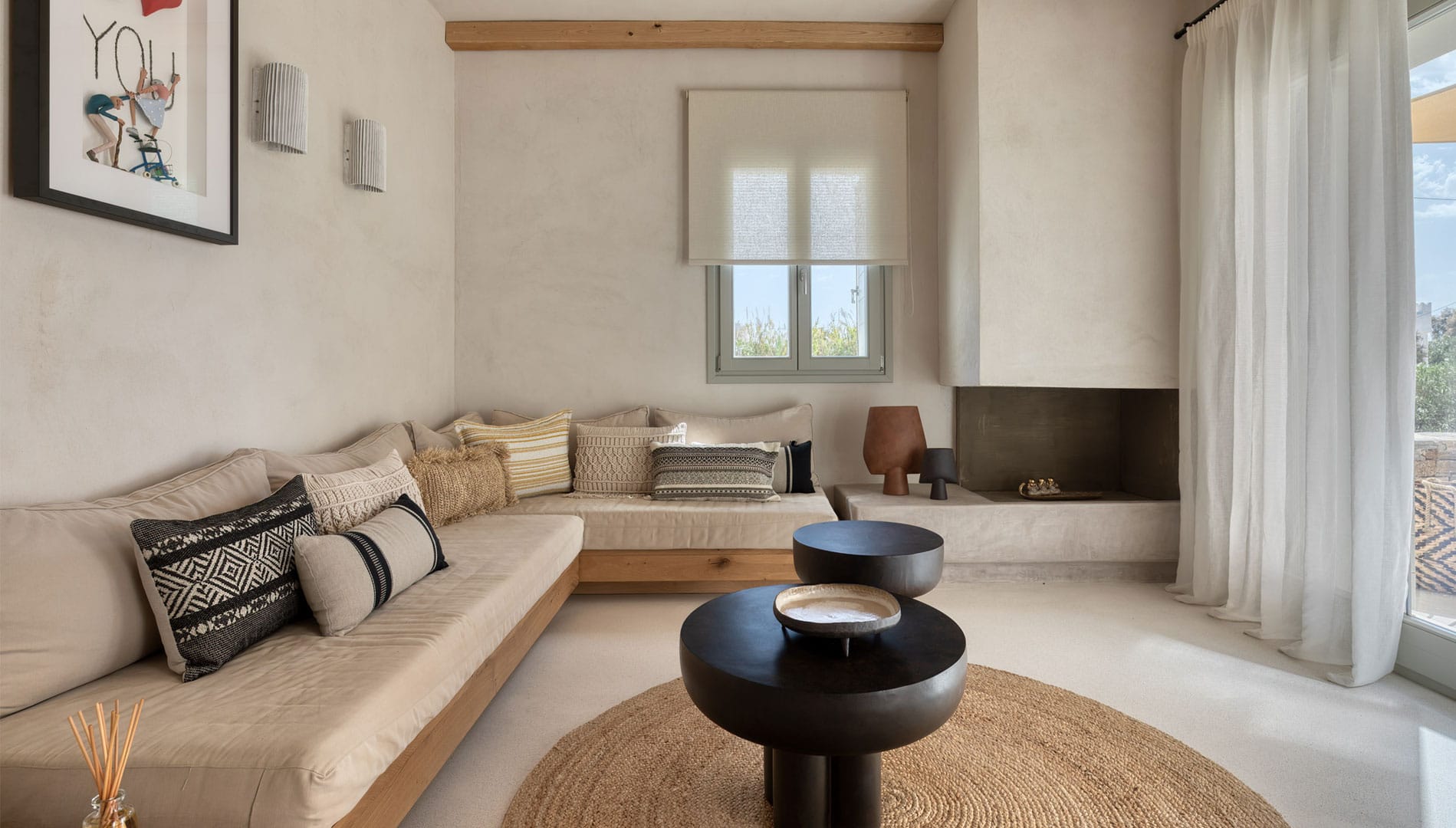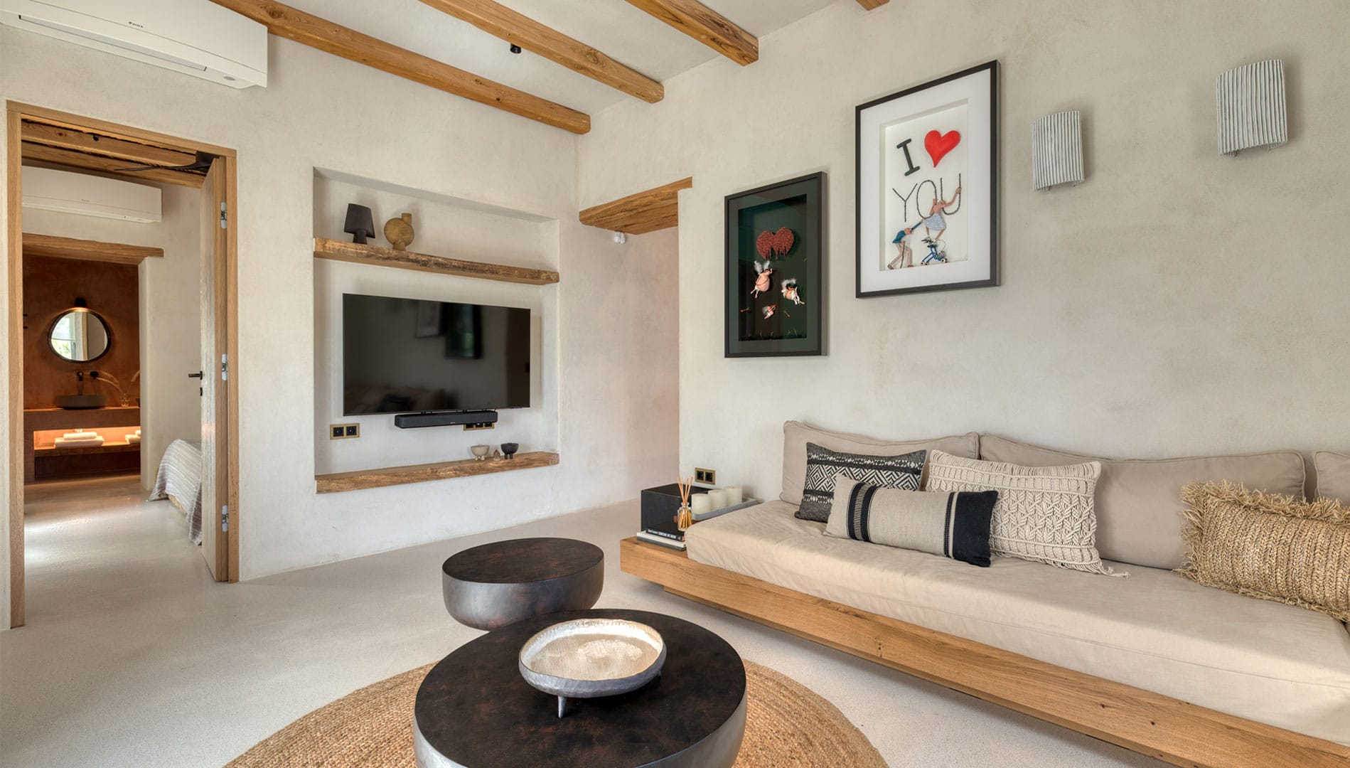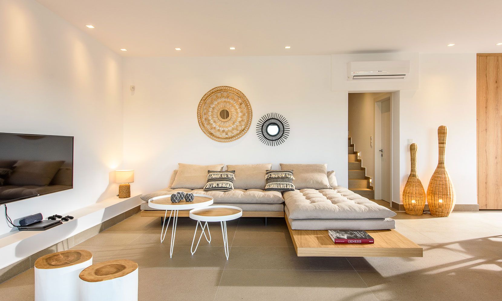 The minimal and bright decor follows a modern concept that seamlessly integrates with the local rocky surroundings. The outdoor is built around the swimming pool area with chill-out spots and dinning facilities. Inside, the decoration is minimal with modern appliances, an open plan kitchen area and a cozy sofa.
