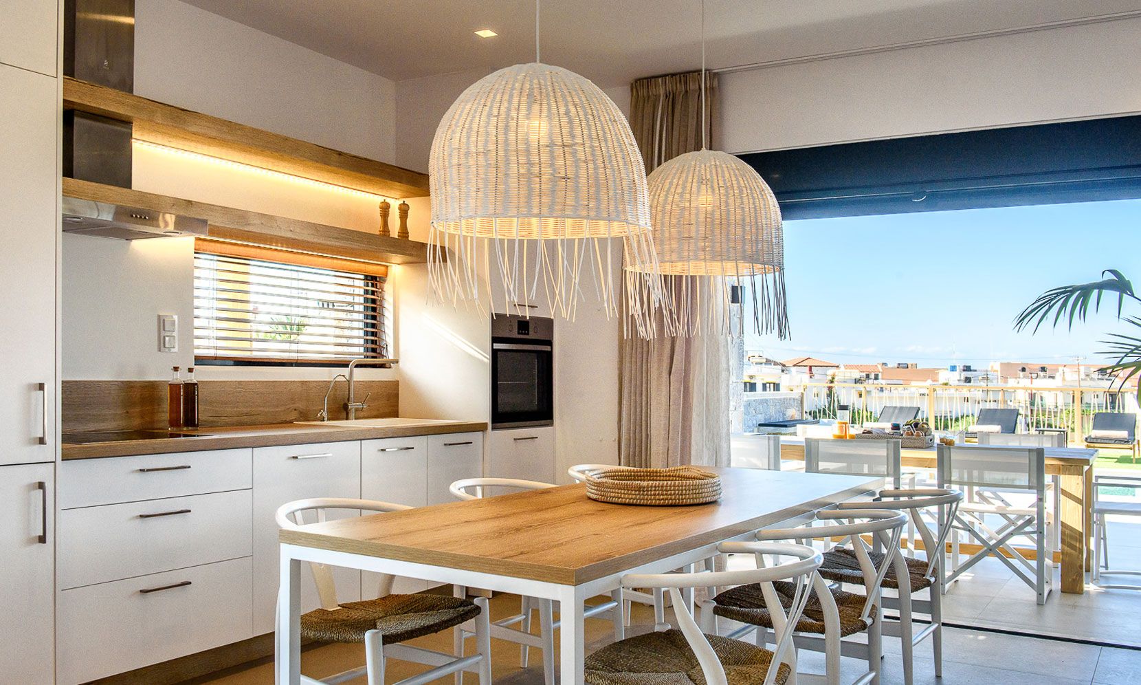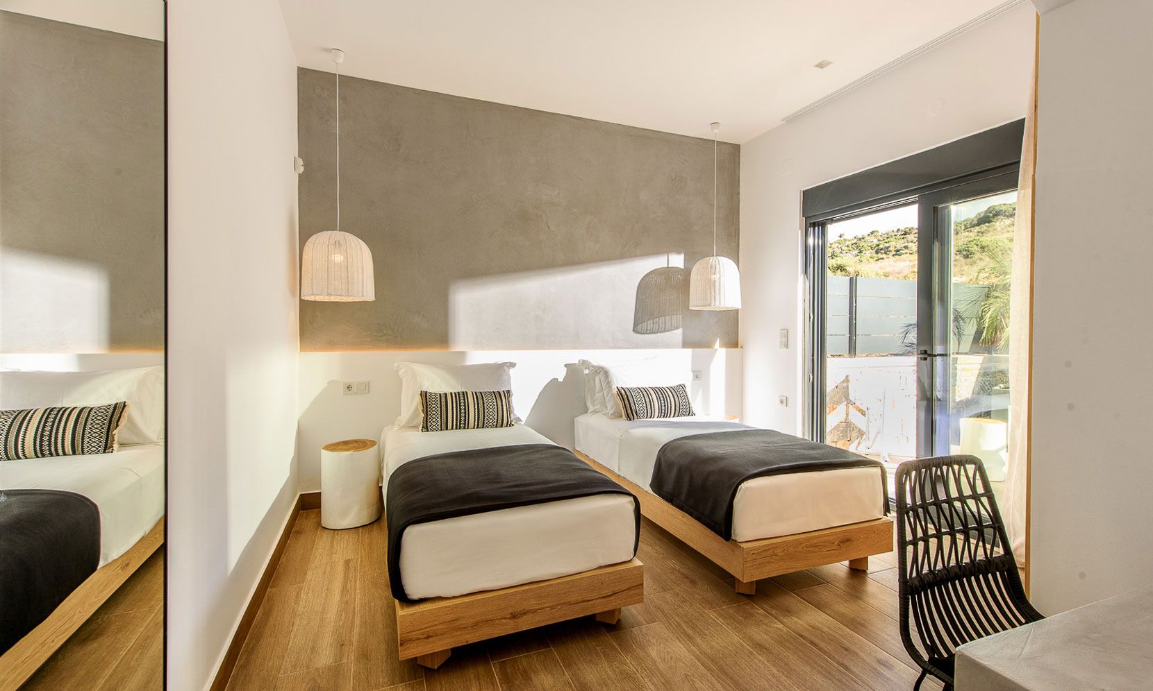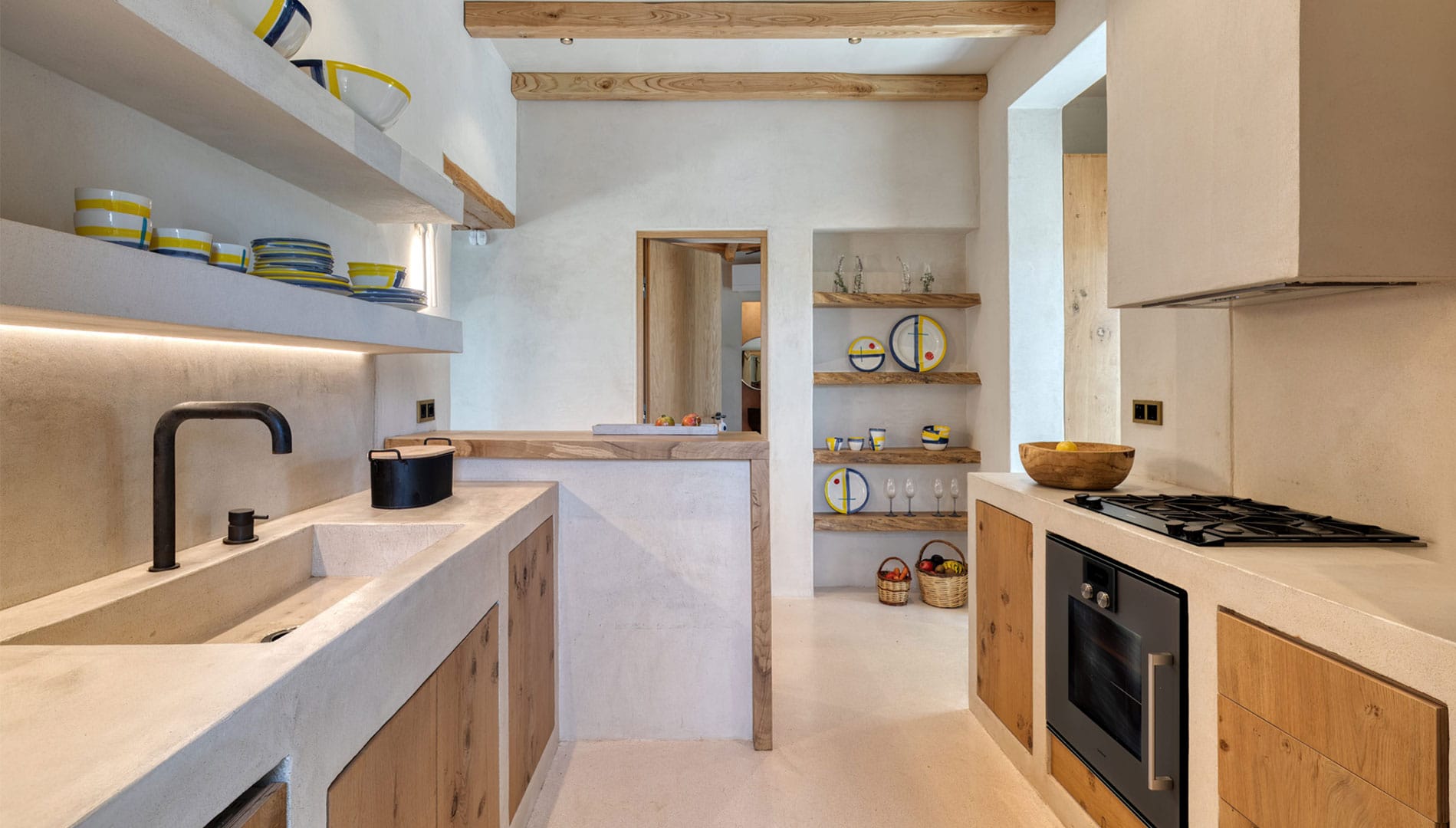 The minimal and bright decor follows a modern concept that seamlessly integrates with the local rocky surroundings. The outdoor is built around the swimming pool area with chill-out spots and dinning facilities. Inside, the decoration is minimal with modern appliances, an open plan kitchen area and a cozy sofa.
