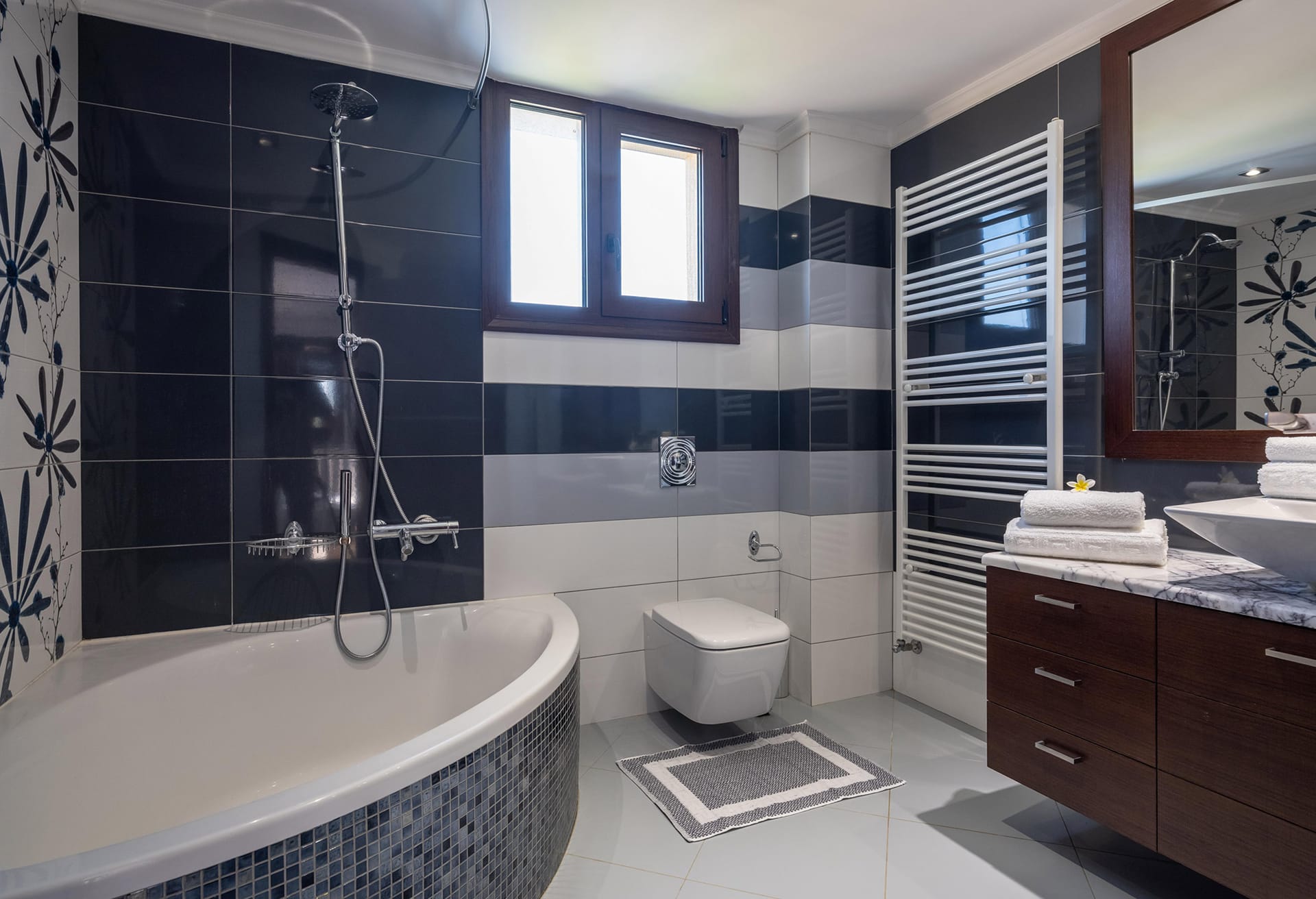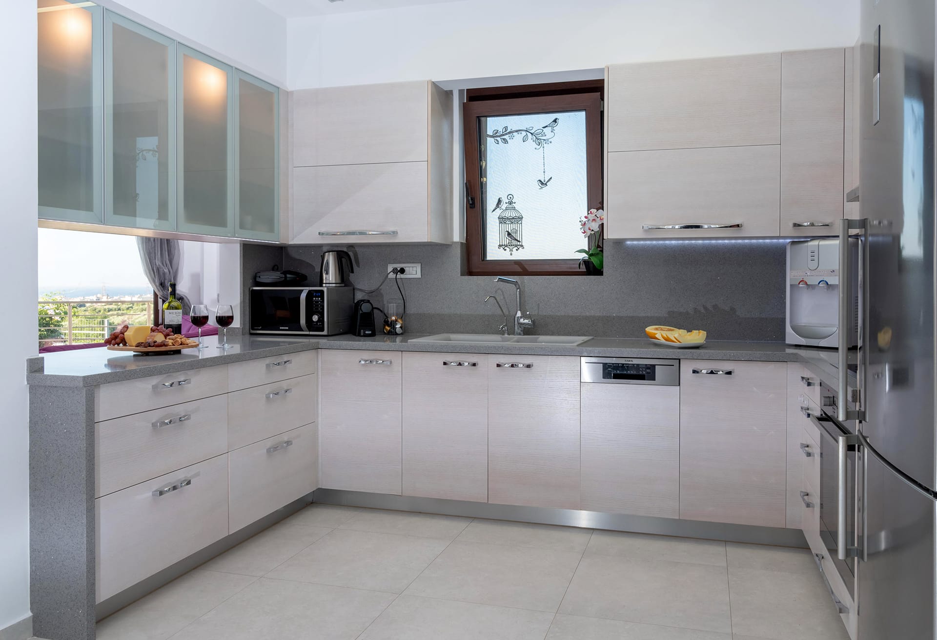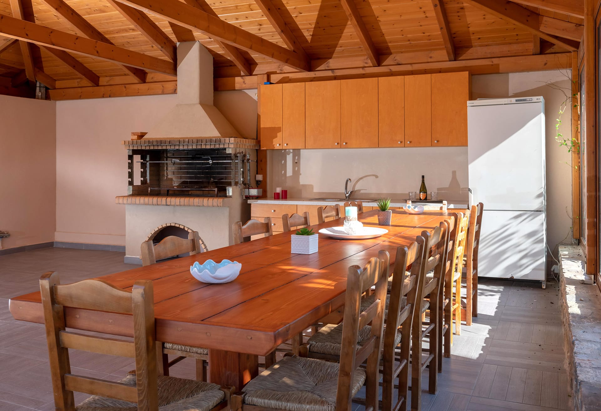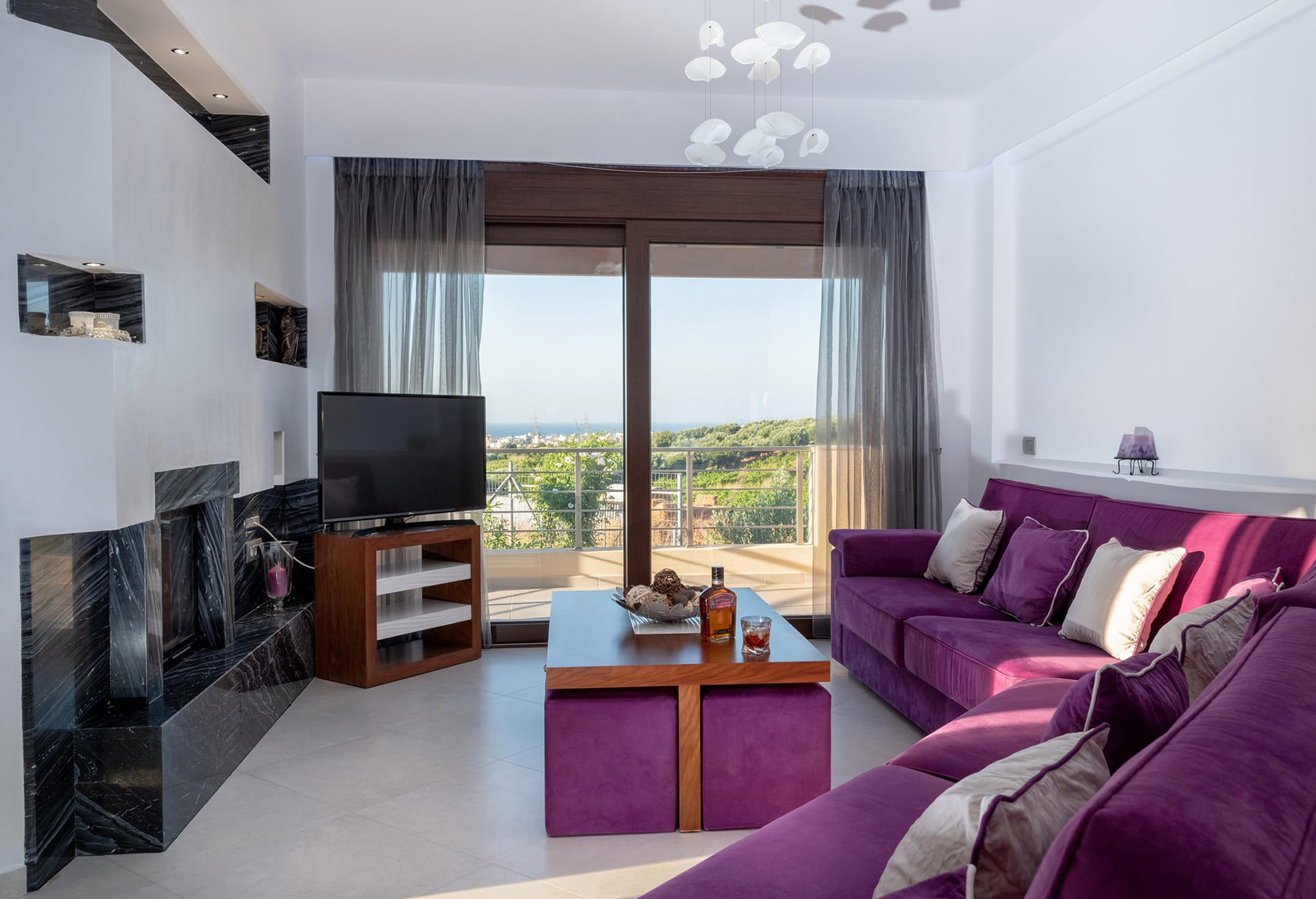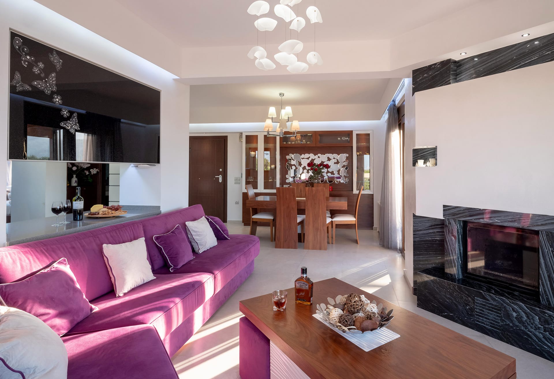 The villa boasts five beautifully appointed bedrooms and four contemporary bathrooms, making it perfect for families or groups of friends. The fully equipped kitchen provides everything needed for preparing meals with ease, while the stylish living room, complete with a cozy fireplace, creates the perfect setting for unwinding after a day of exploration or sun-soaked relaxation.