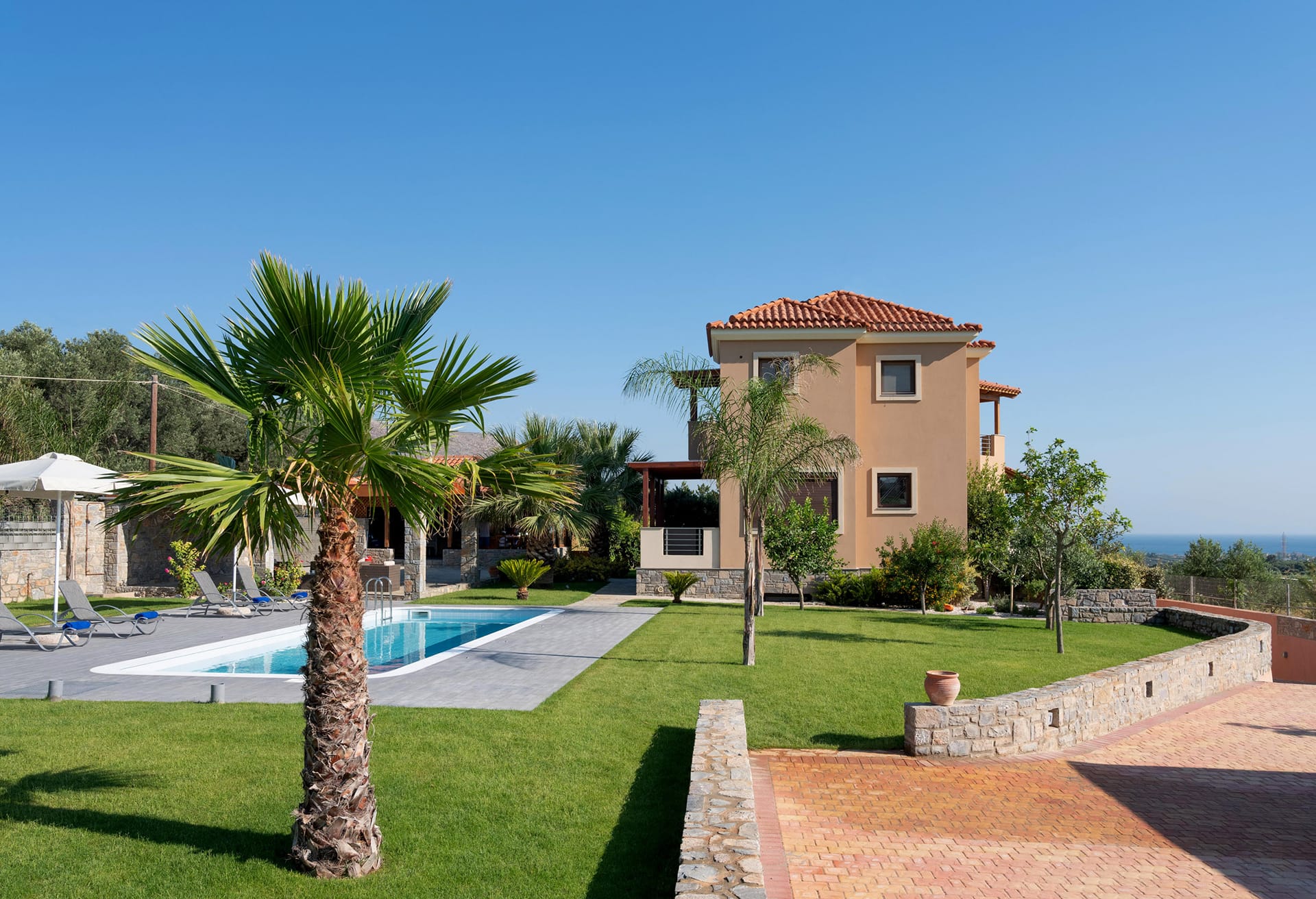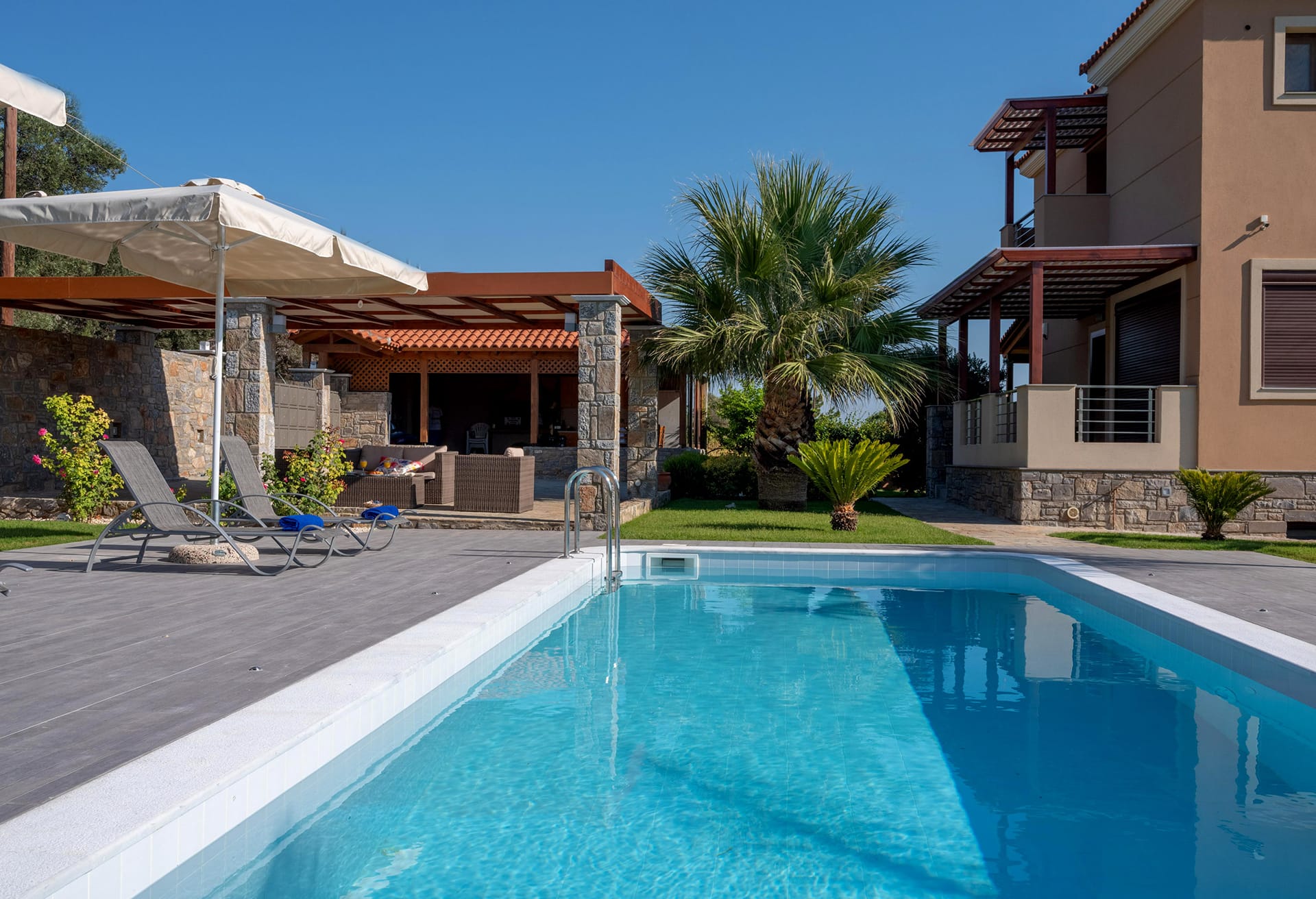 Outdoors, Villa David offers an inviting private swimming pool surrounded by comfortable sun loungers and umbrellas, allowing guests to enjoy the Cretan sun in complete serenity. The lush garden adds a sense of tranquility to the property, creating a peaceful environment ideal for morning coffee, afternoon reading, or evening gatherings under the stars.