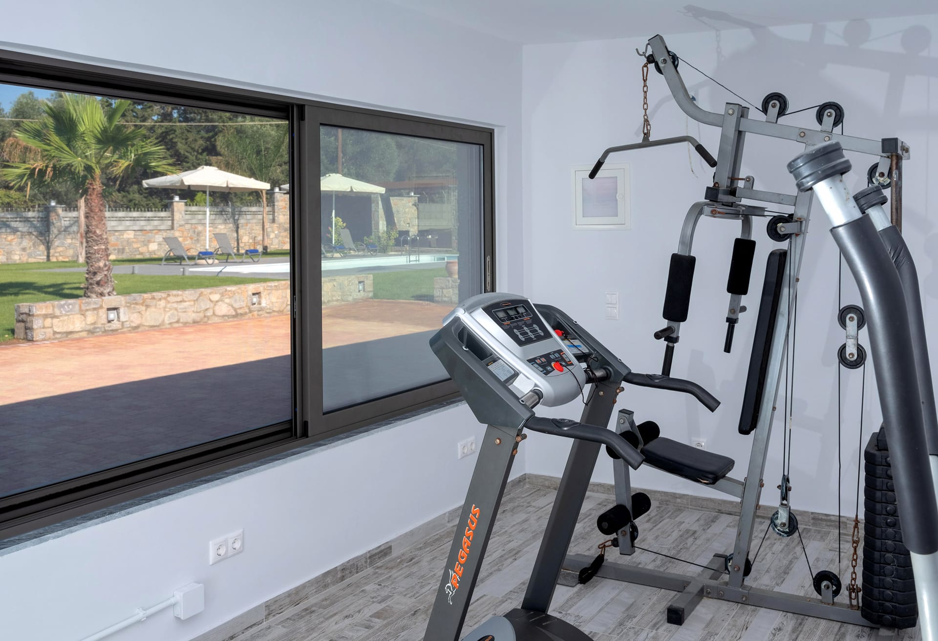 For those who value wellness and fitness, the villa includes a private gym equipped to accommodate a variety of workout routines. Additionally, air conditioning is available throughout the property, ensuring comfort at all times during the warm Cretan days and nights.
